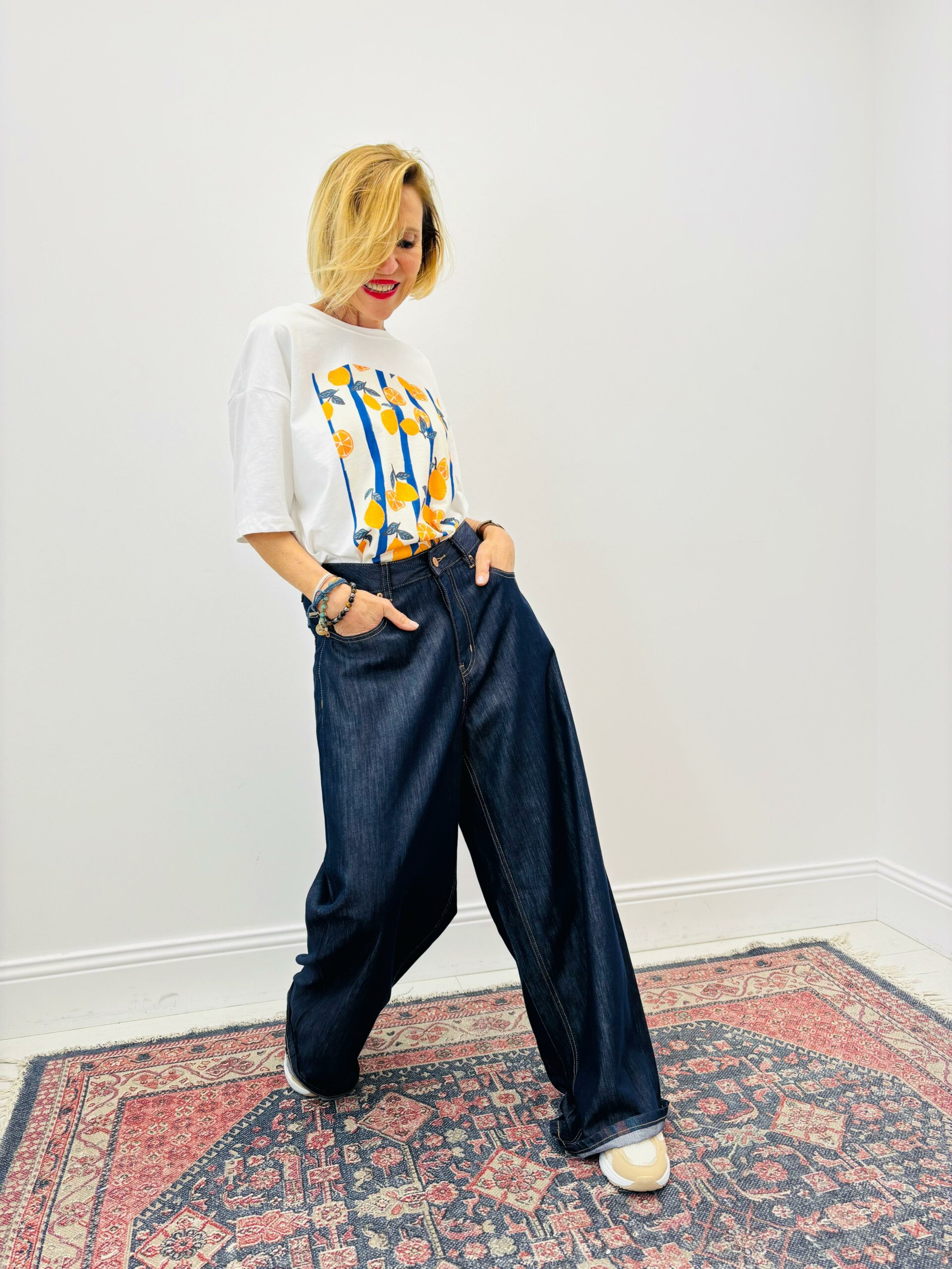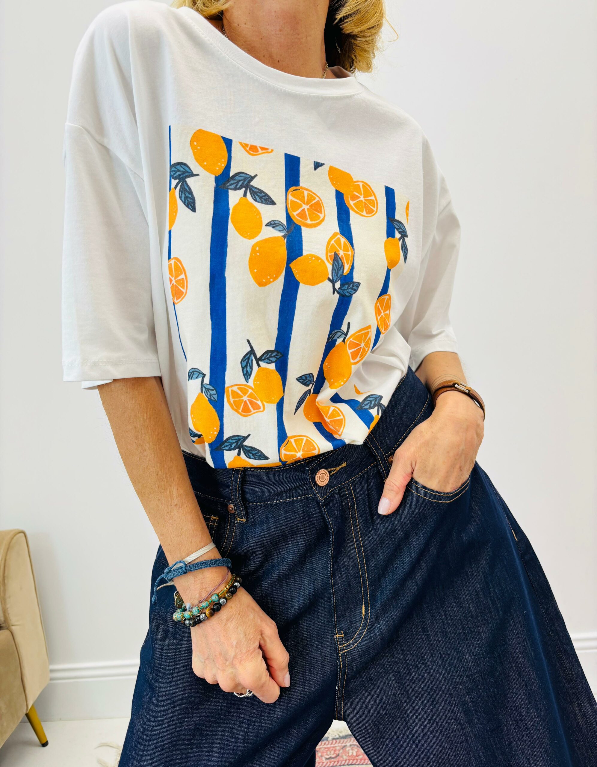 Tshirt blanc avec citrons bleus et jaunes, encolure ronde, manches courtes