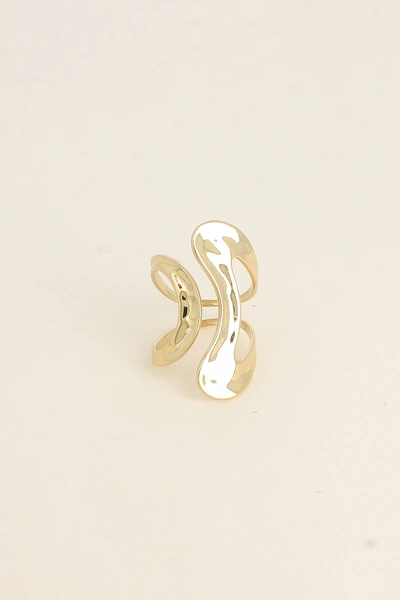 Bague ouverte en acier inoxydable composée de formes ajourées et martelées.