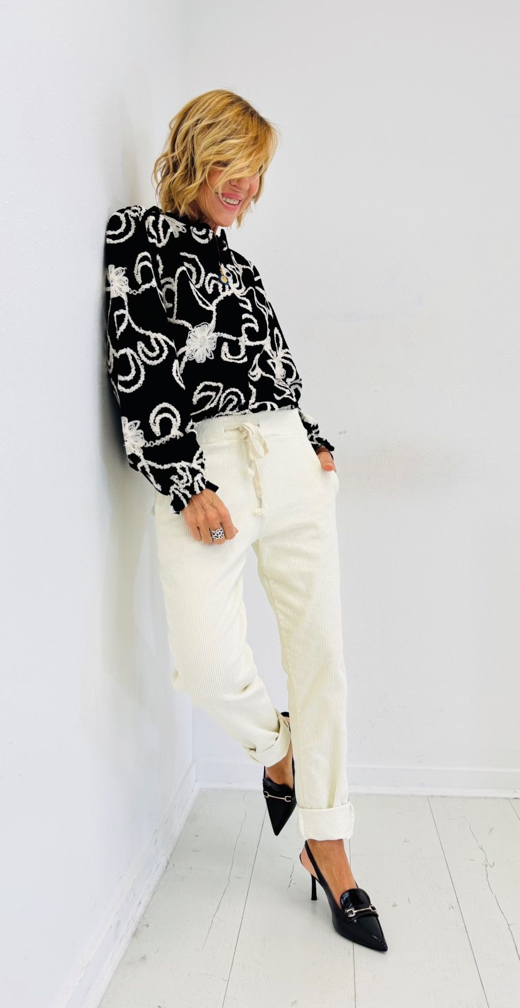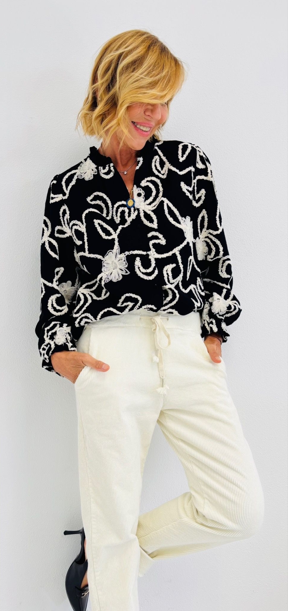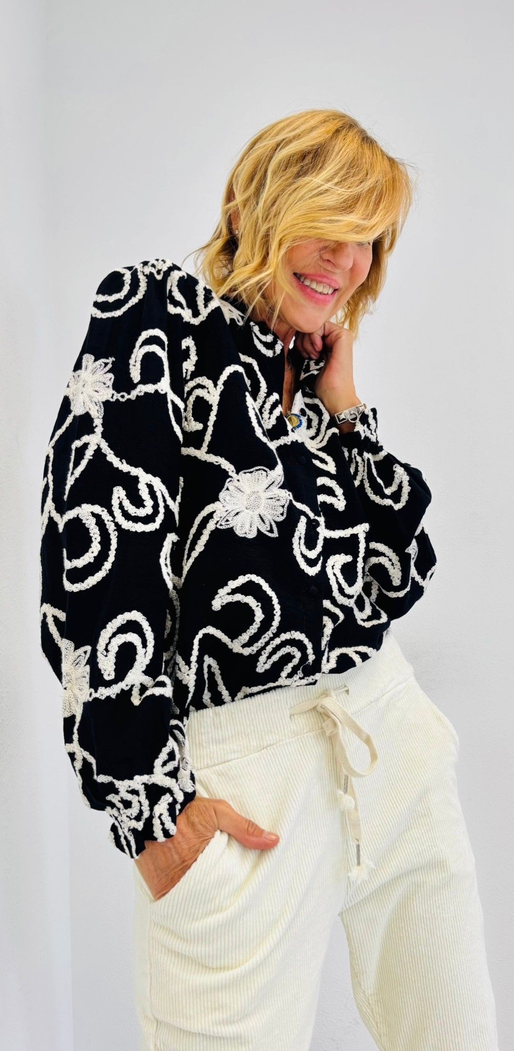 Blouse noire et blanche avec broderies, poignets resserrés, col légèrement montant