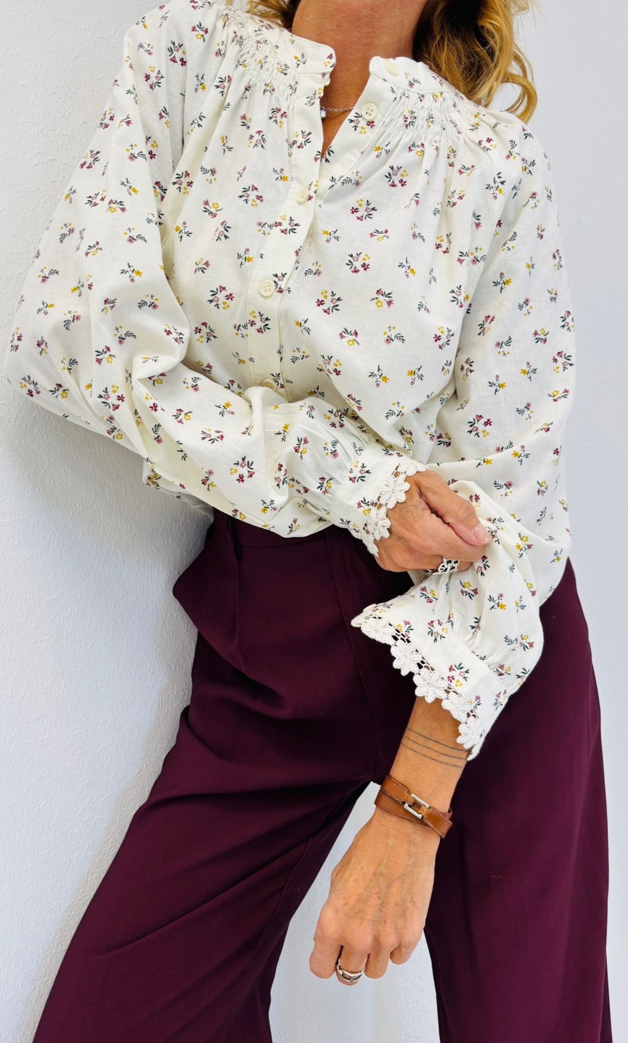 Blouse écru avec petites fleurs, façon liberty, col rond, aux poignets broderies fleurs