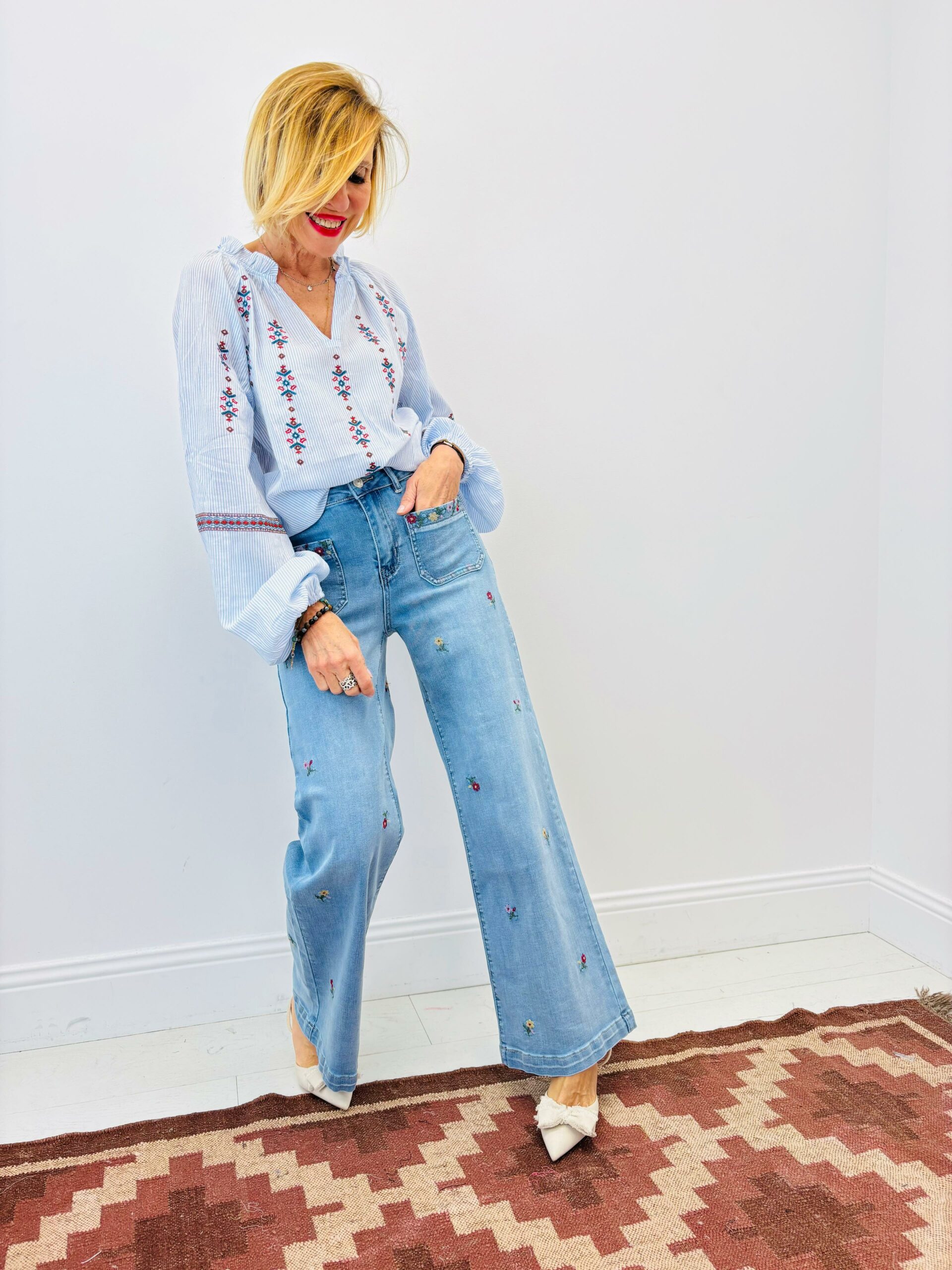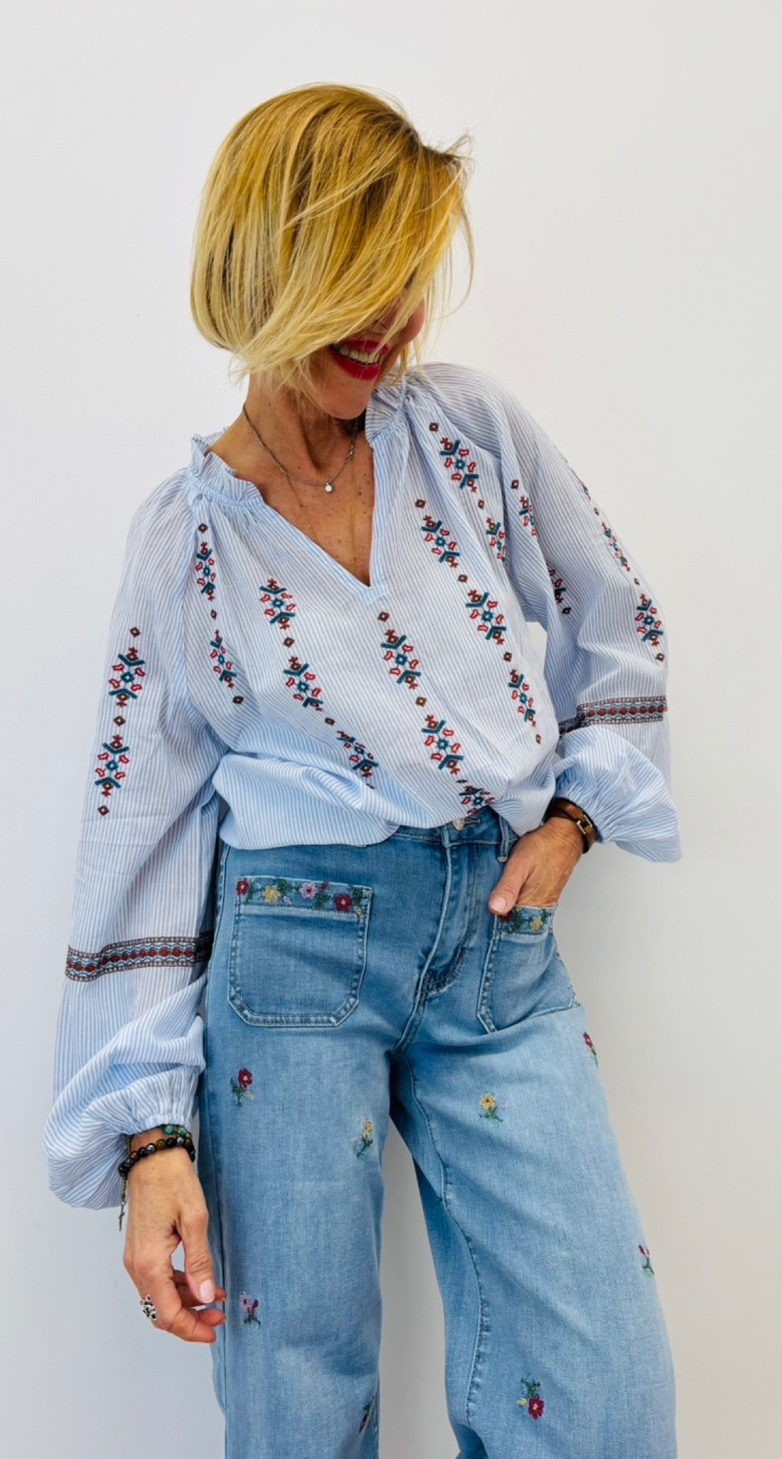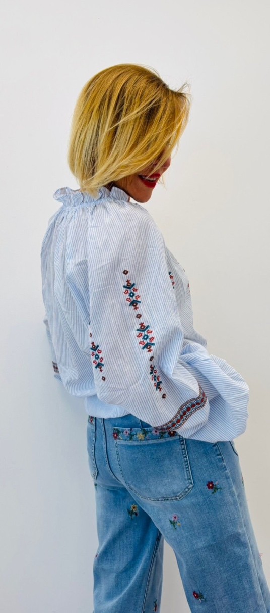 Blouse rayée bleue et blanche avec des motifs, encolure en V, matière légère et fluide, poignets resserrés