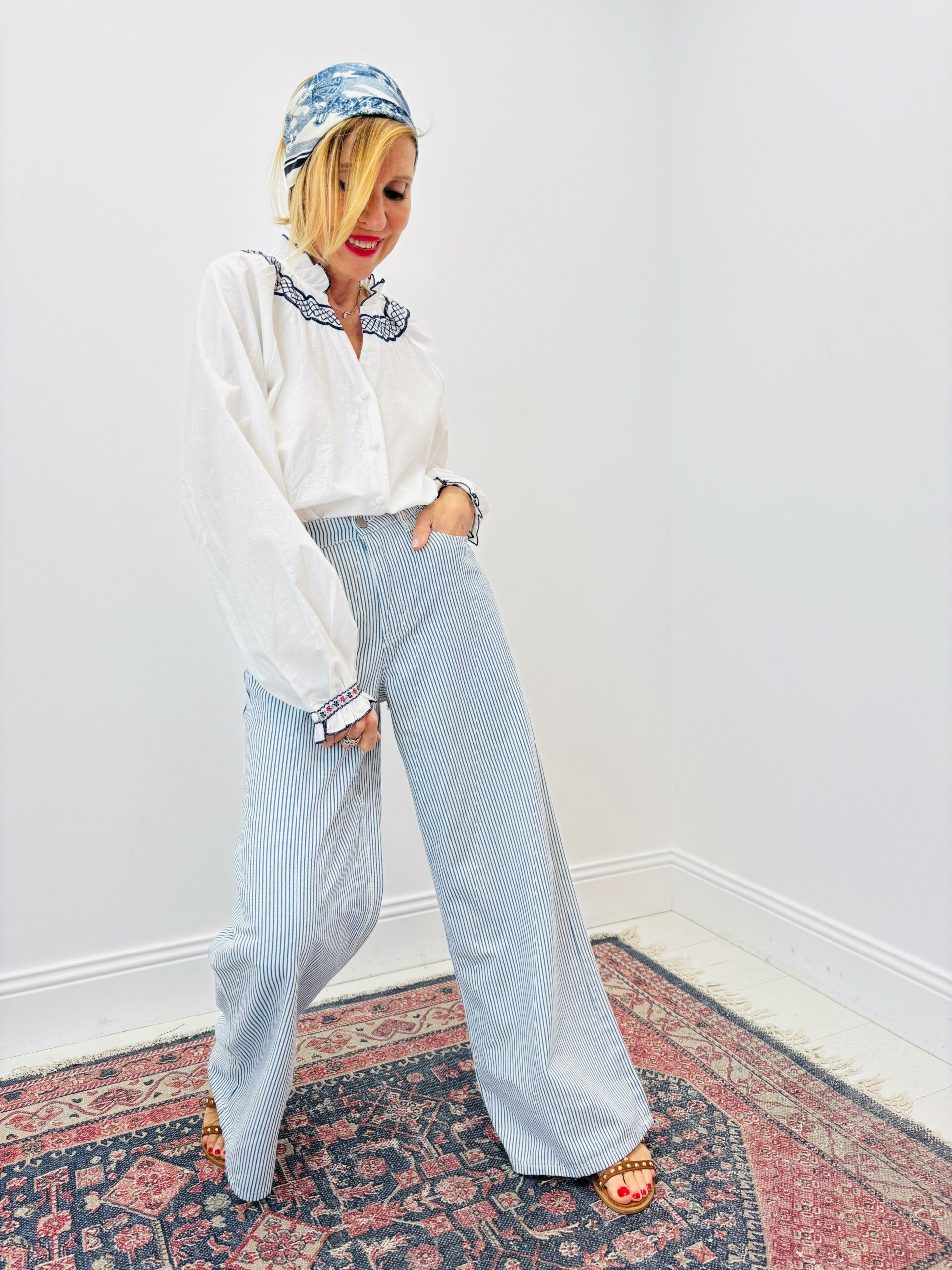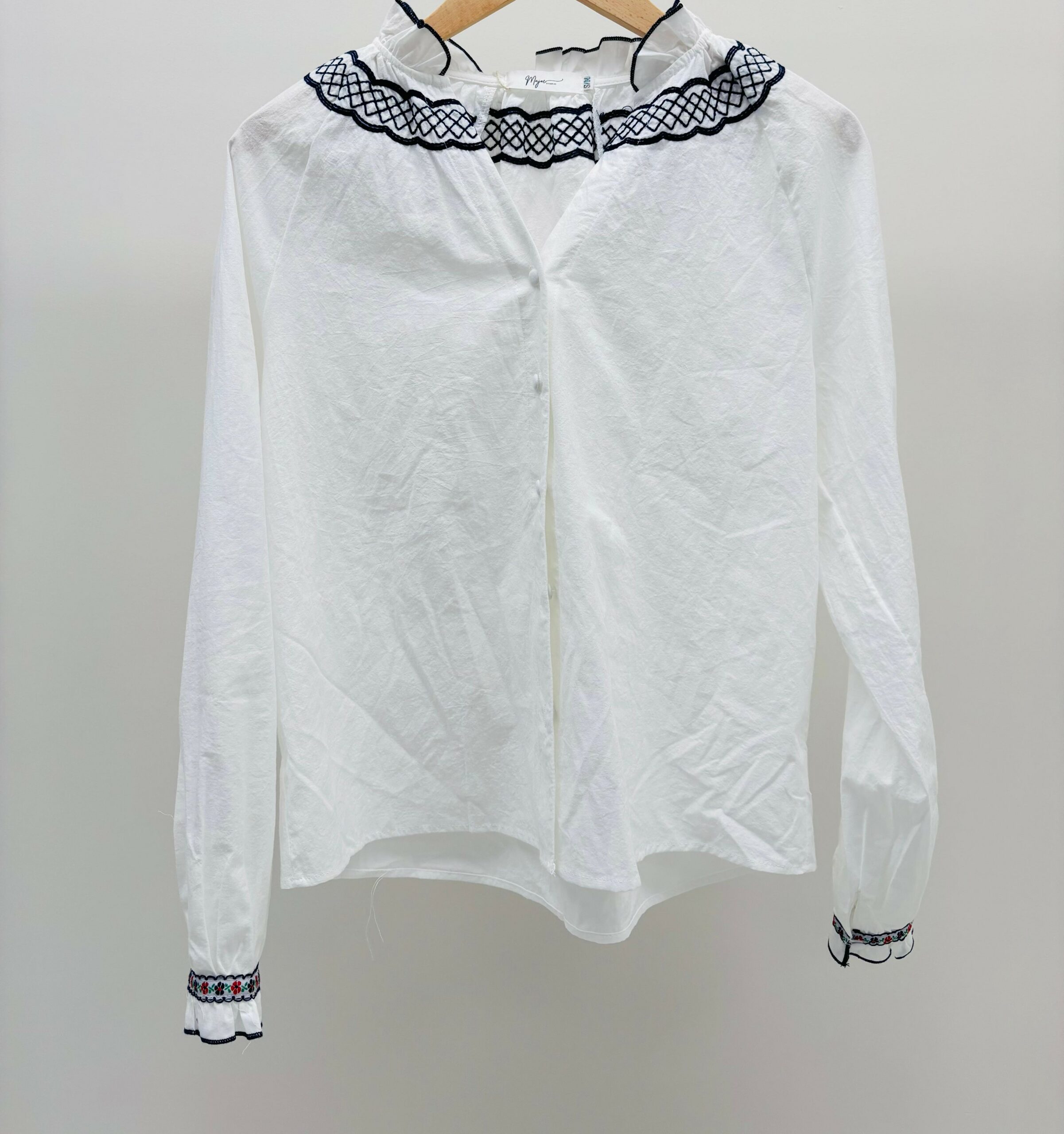 Blouse blanche avec col et poignets brodés, boutons
