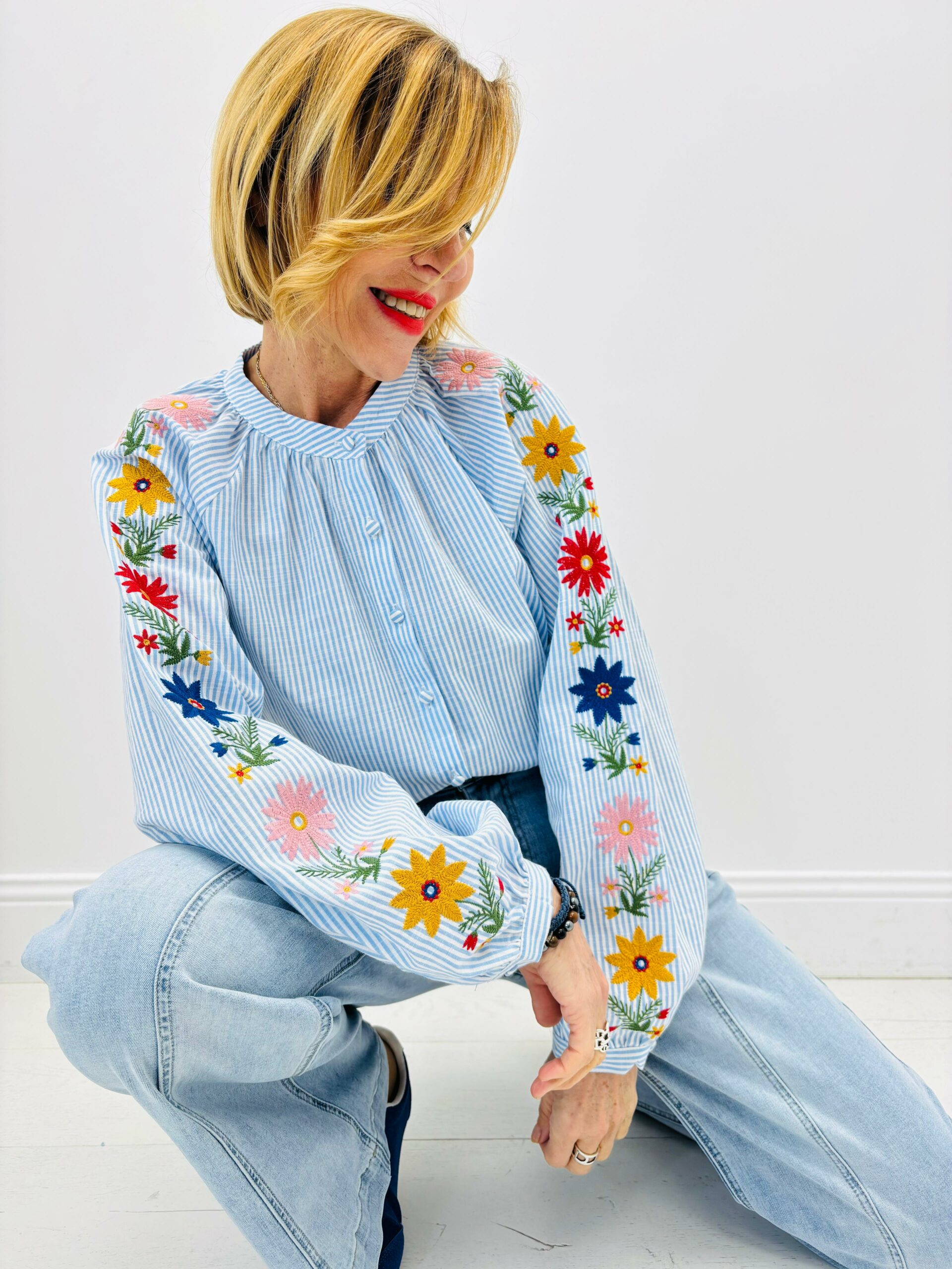 Blouse rayée bleue ciel avec ses jolies broderies sur les manches, boutons
