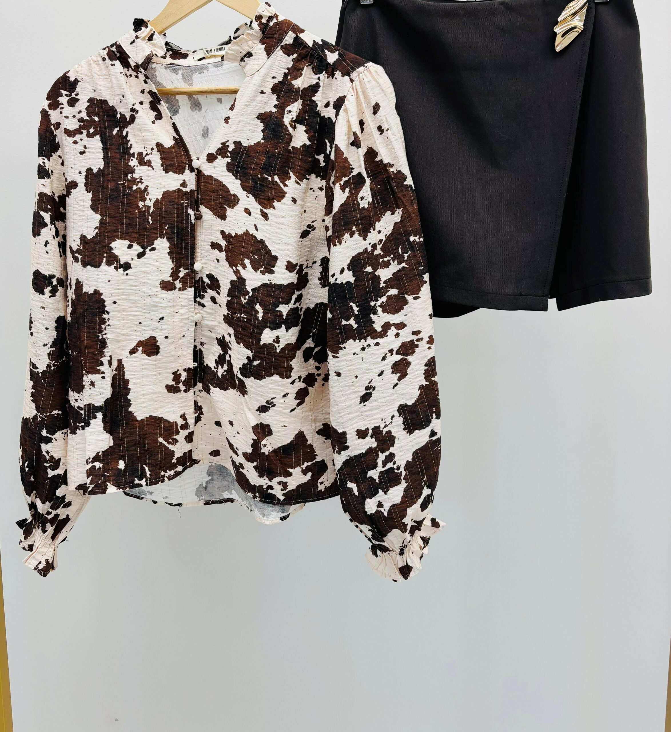 Blouse au motif « vache », avec une touche de lurex dedans, boutonnée, poignets légèrement ressérés