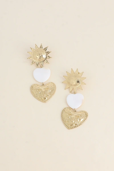 Boucles d’oreilles pendantes en acier inoxydable composées de 3 pièces, 2 cœurs dont un cœur nacré et 1 soleil.