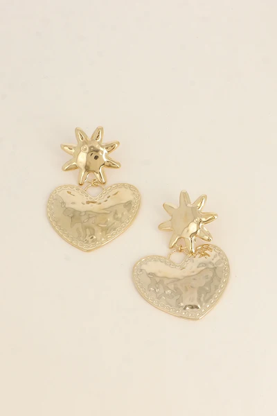 Boucles d’oreilles pendantes en acier inoxydable composées d’un soleil et d’un coeur martelé.