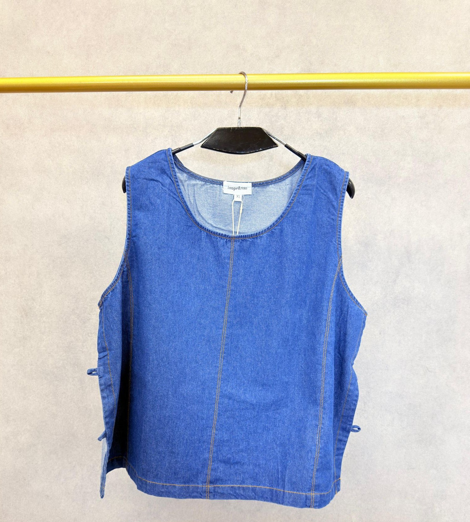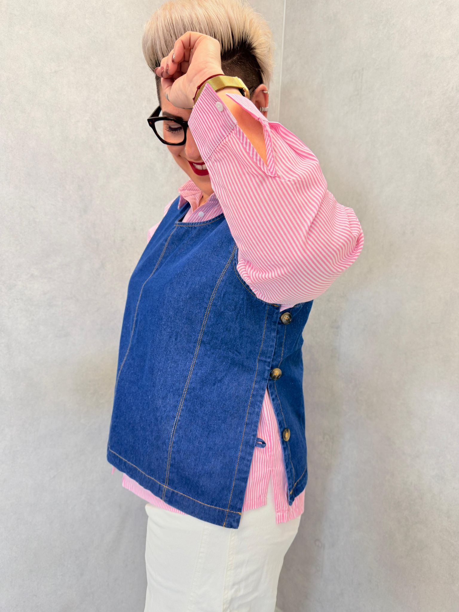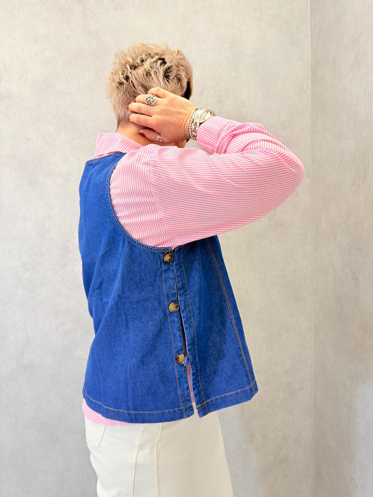 Chasuble en jeans, idéale avec une chemise en dessous, boutons sur chaque côté pour fermer
