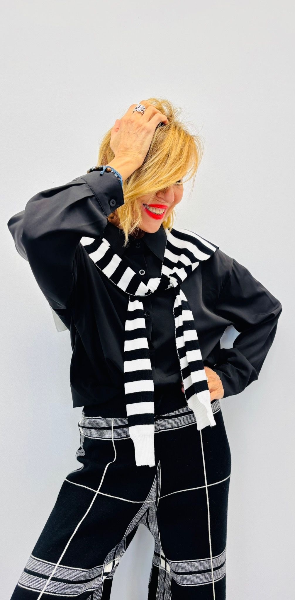 Chemise noire, avec « petit haut » marin se portant sur les épaules, façon pull à nouer, » trompe œil »