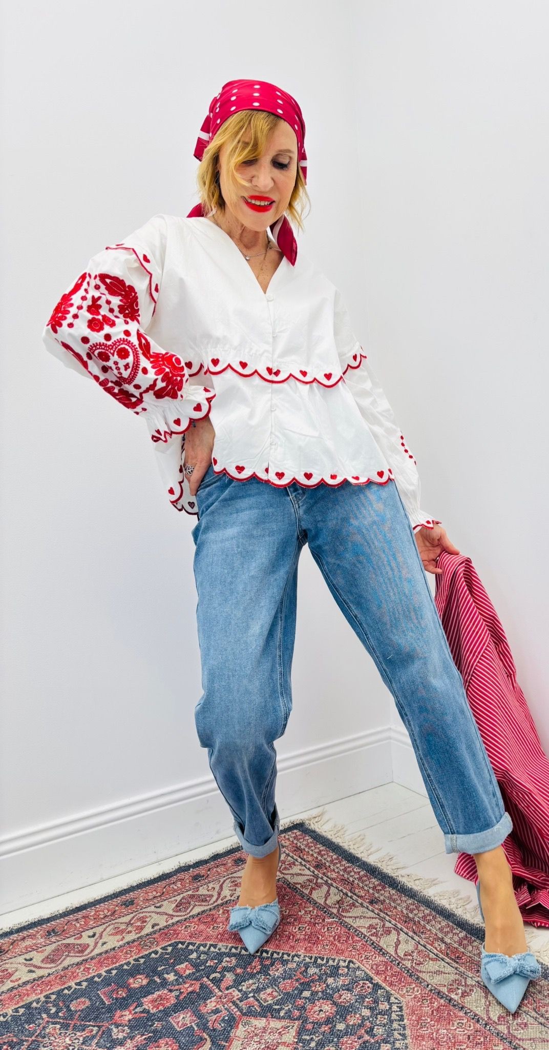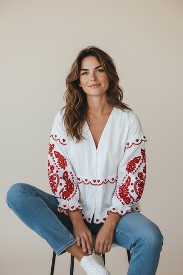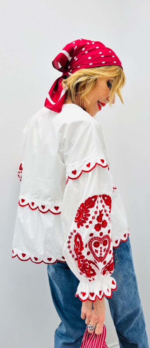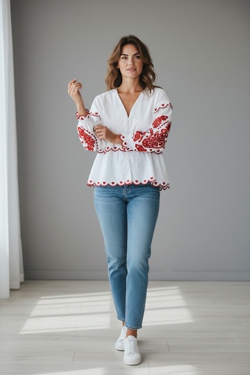 Chemise blanche avec broderies rouges, coupe légèrement ample, col en V, boutons