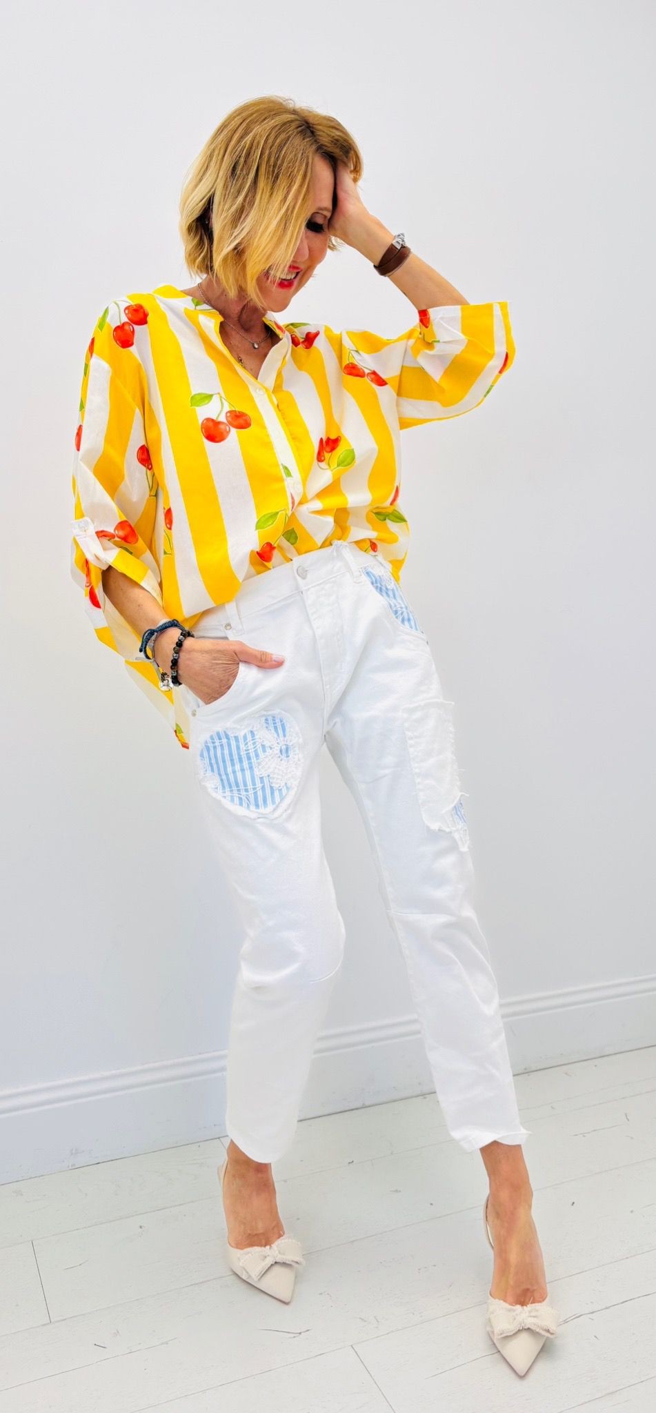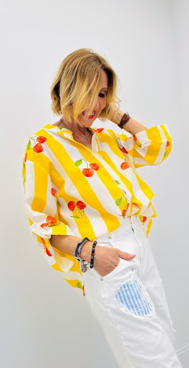 Chemise jaune rayée avec cerises, boutons, col légèrement montant