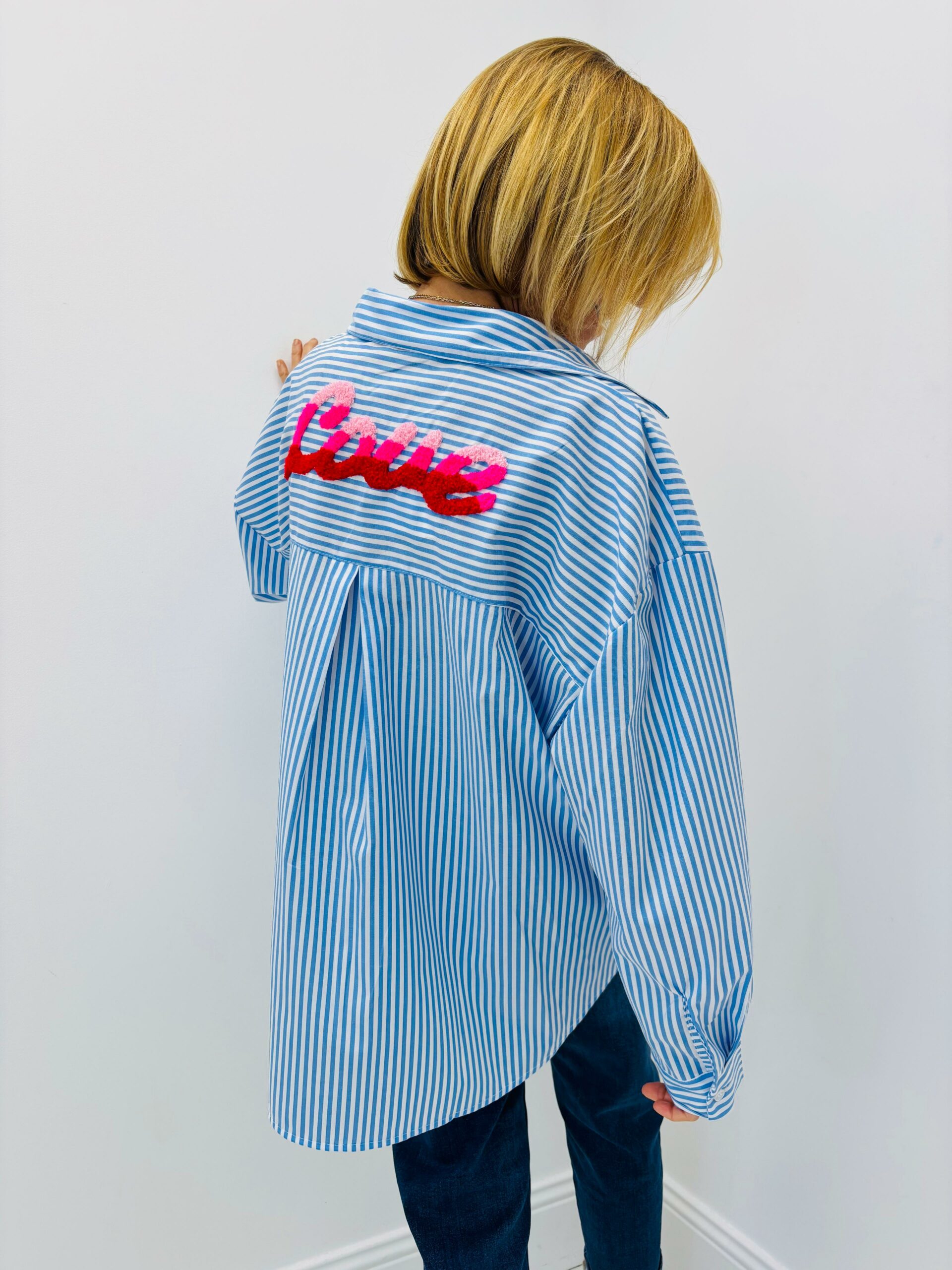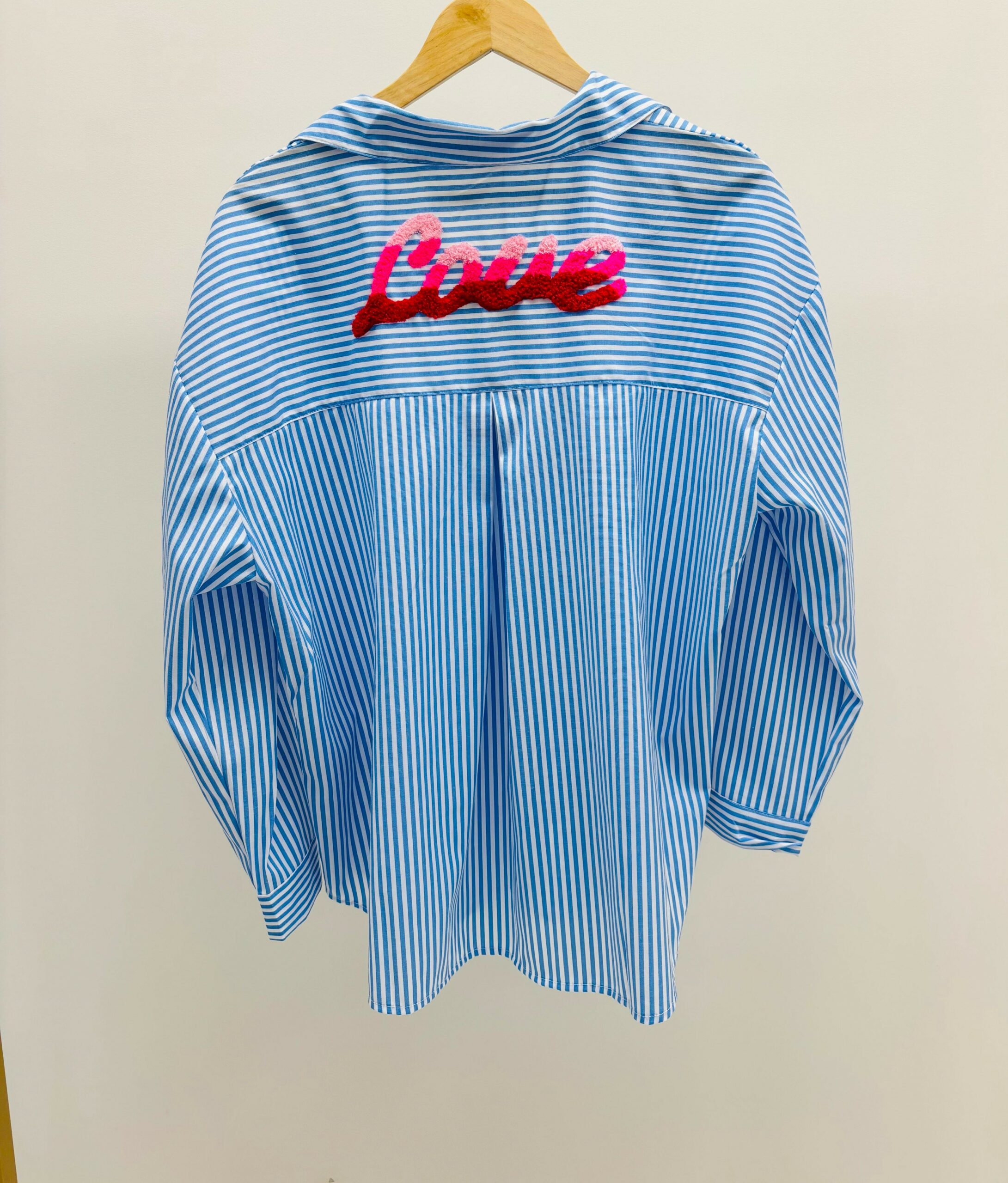Chemise rayée bleue ciel/ blanche, au dos « love » en couleur rose, boutons