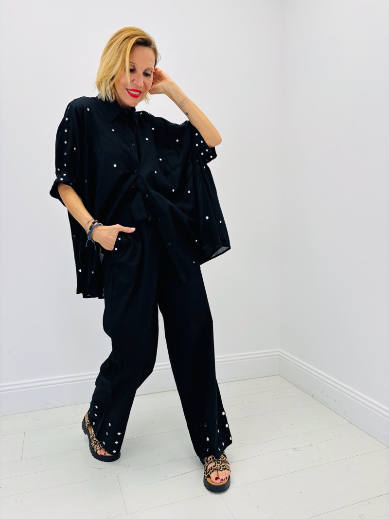 Chemise noire avec effet « petits miroirs » de face, couple ample, légère et fluide