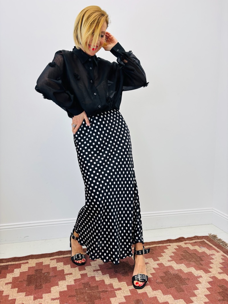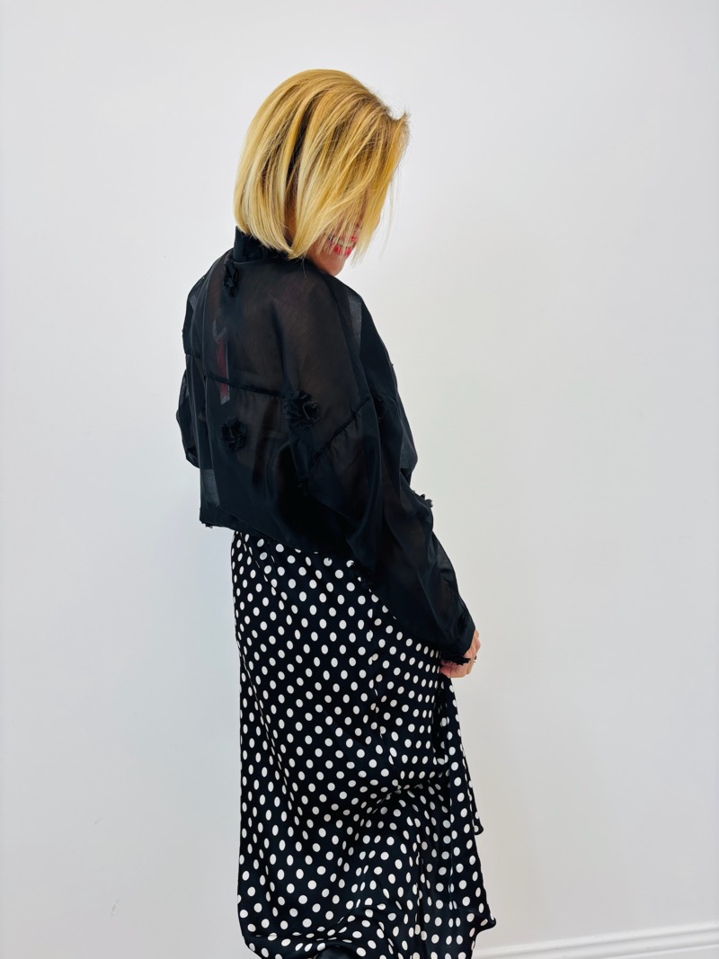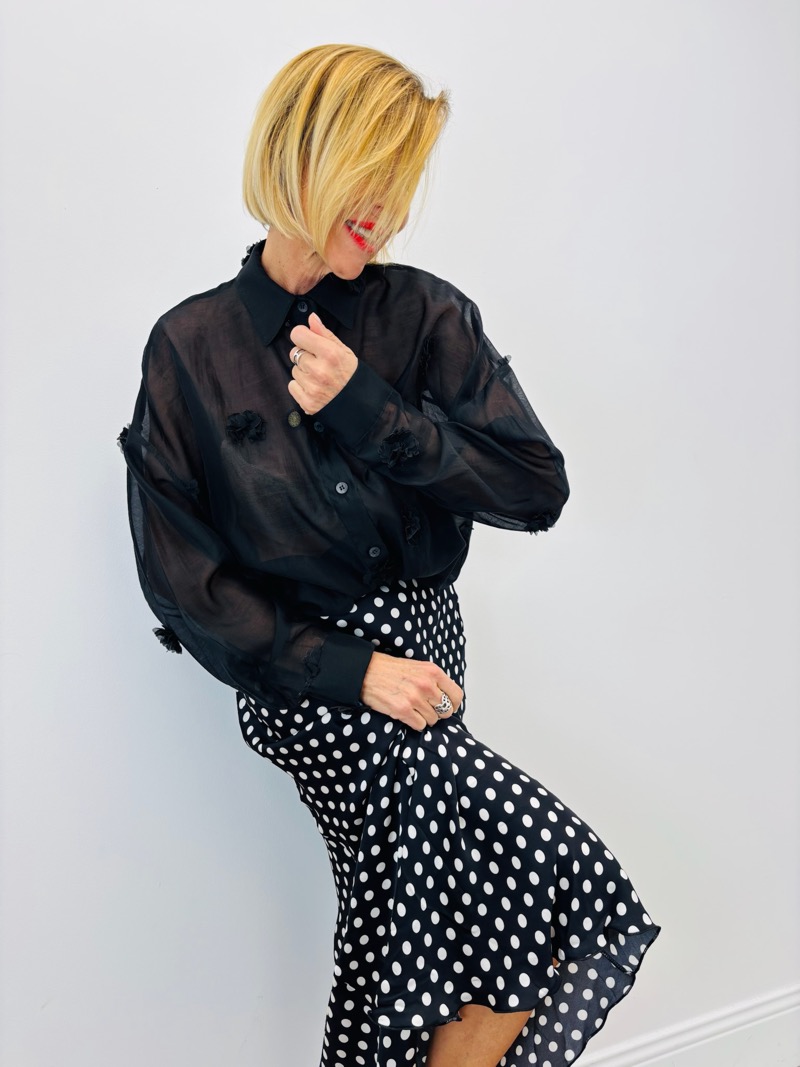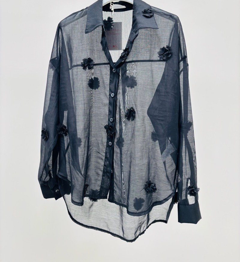 Chemise noire, légèrement transparente, avec des fleurs en relief sur toute la chemise, boutons
