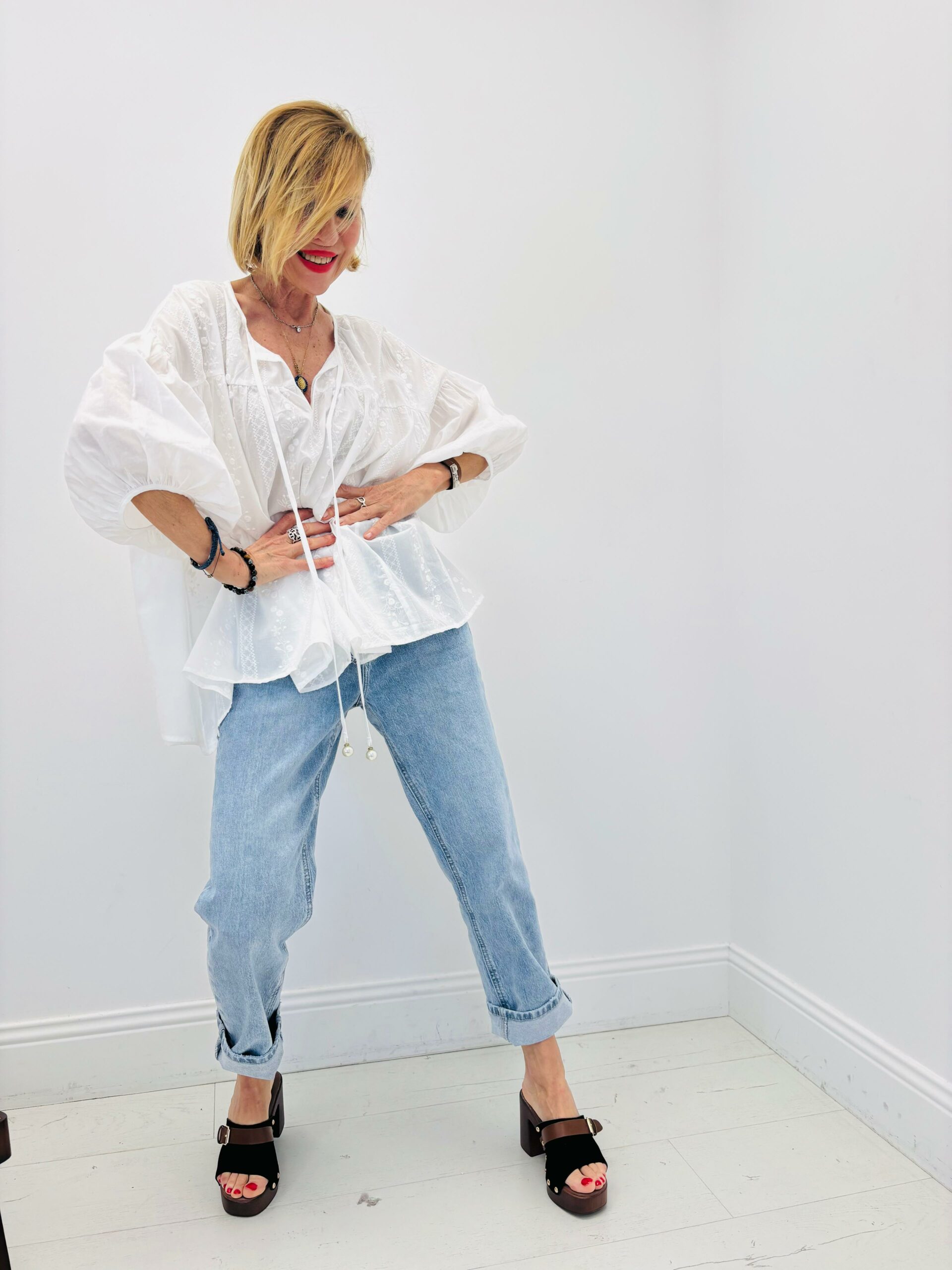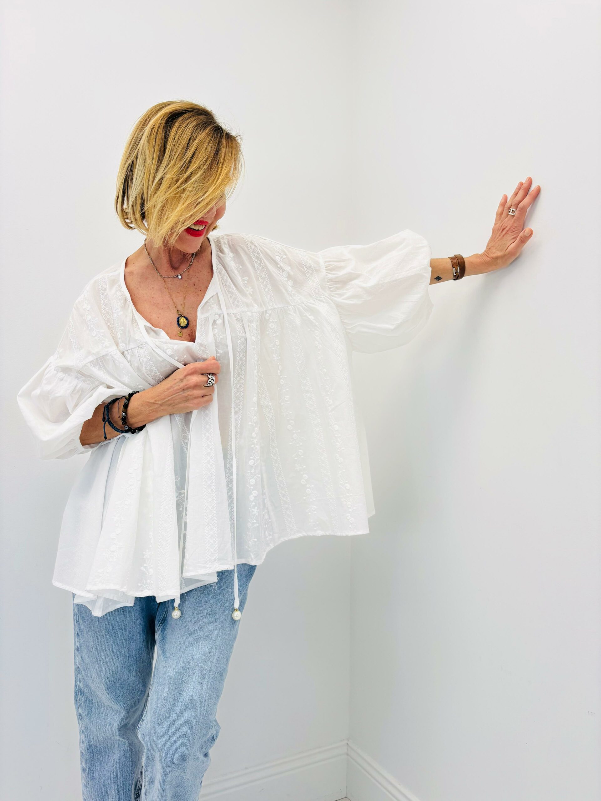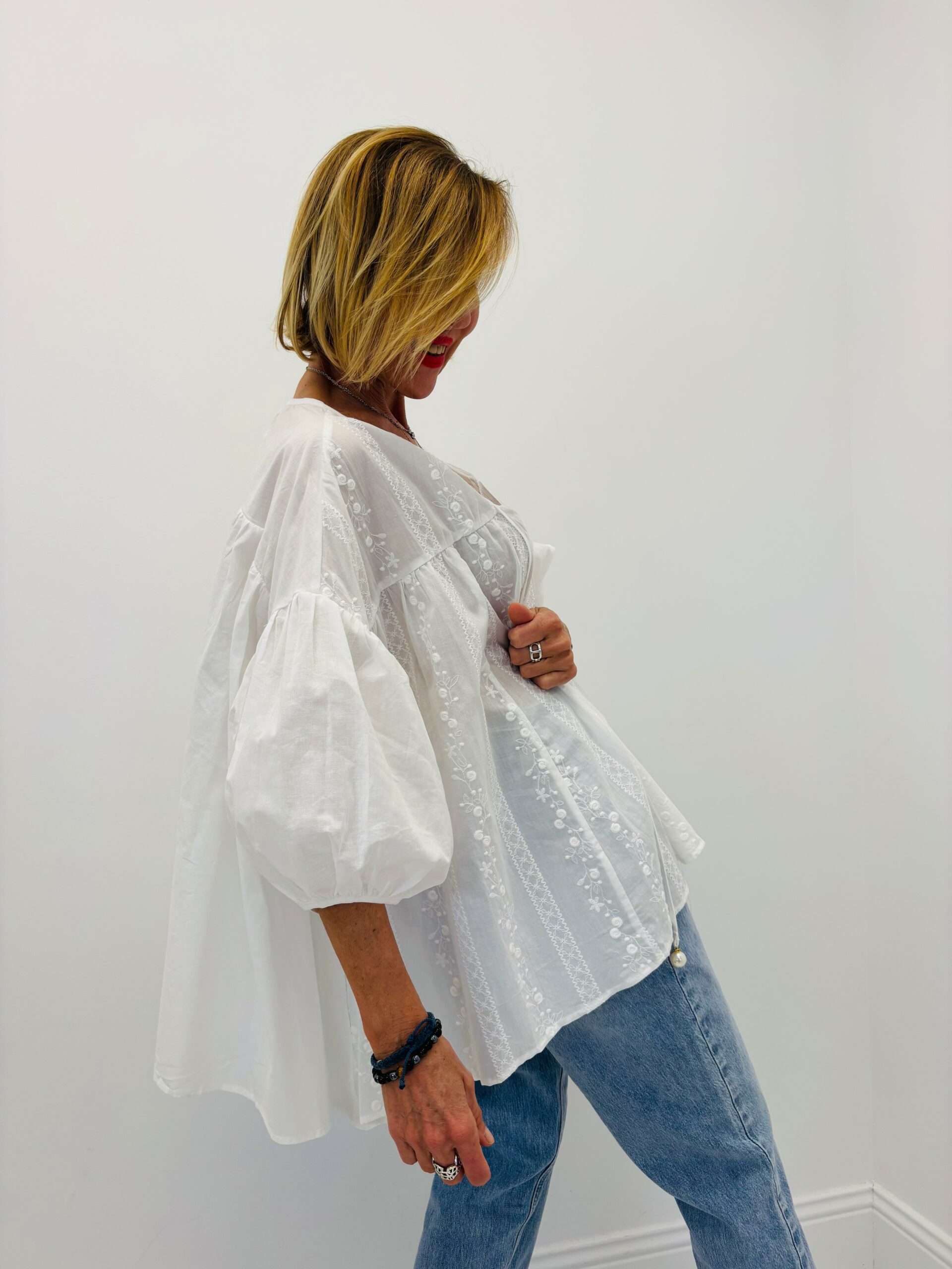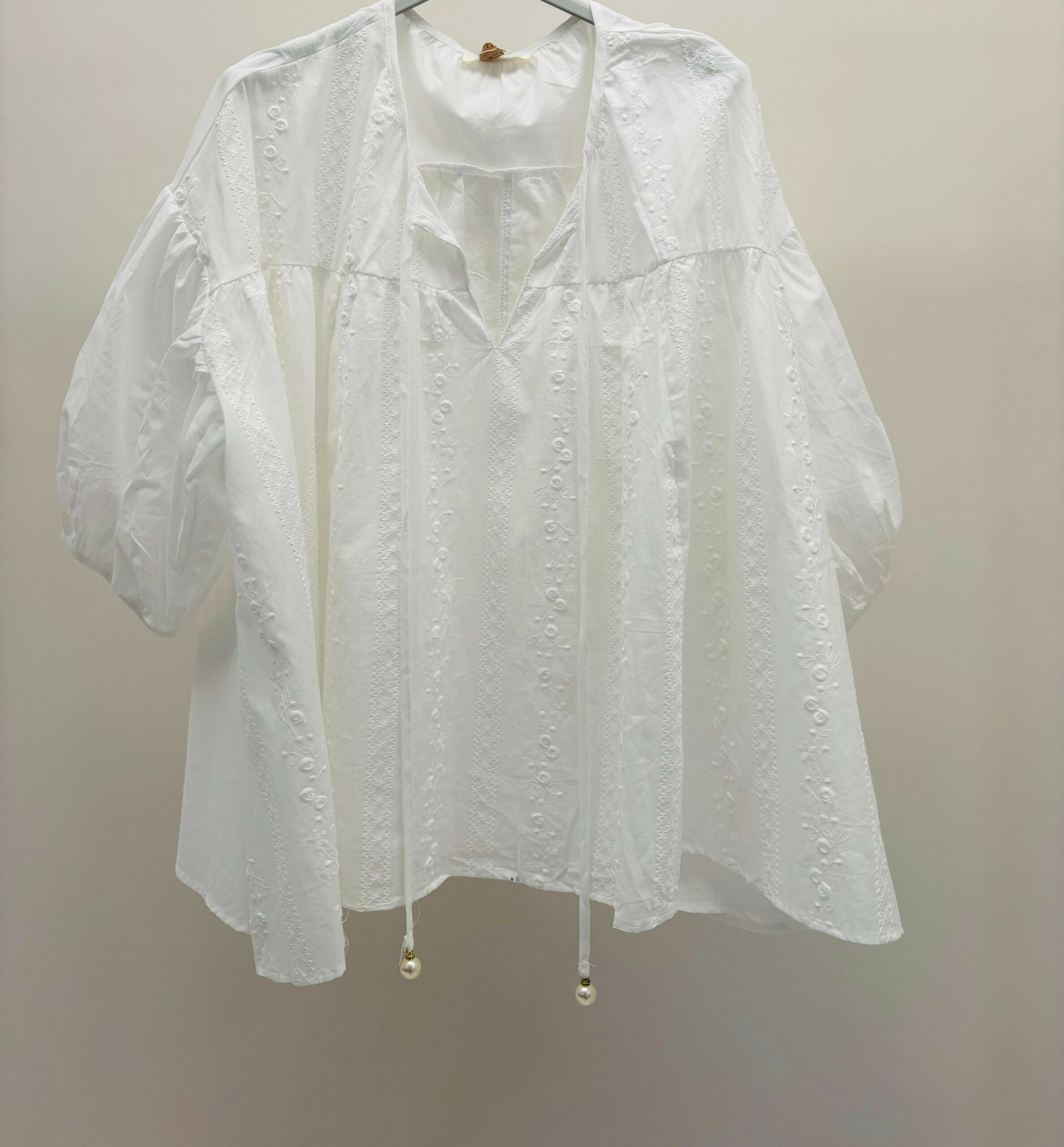 Chemise blanche brodée, coupe oversize, cordons avec perles