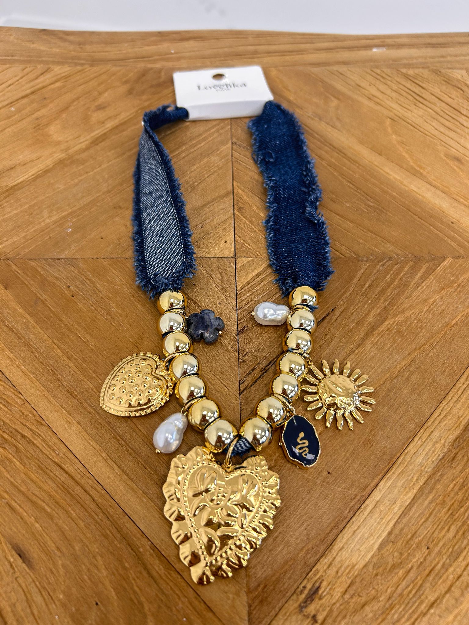 Collier ruban en jeans très souple, pampilles dorées et bleues
