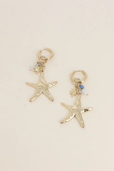 Boucles d’oreilles type créoles avec fermoir à charnière en acier inoxydable composées de pierres naturelles, d’une étoile de mer et d’une étoile du Nord.