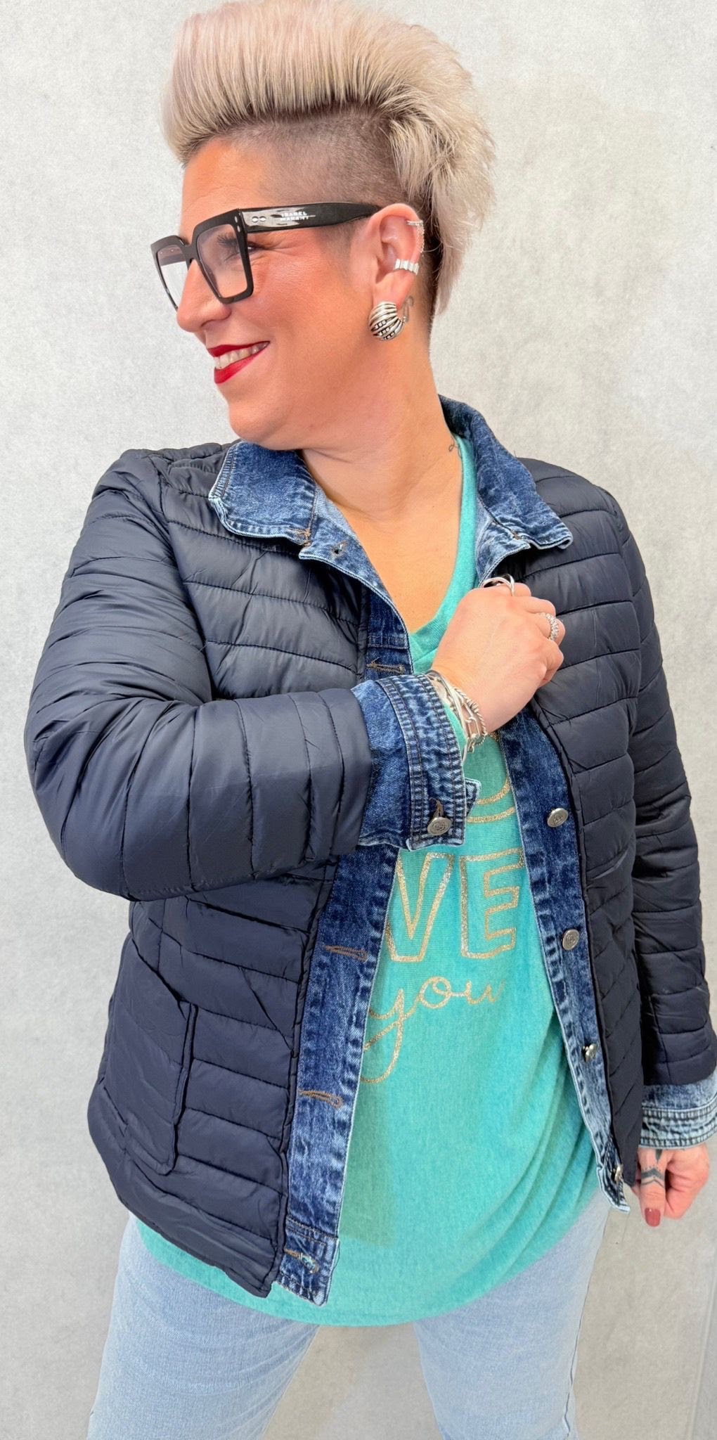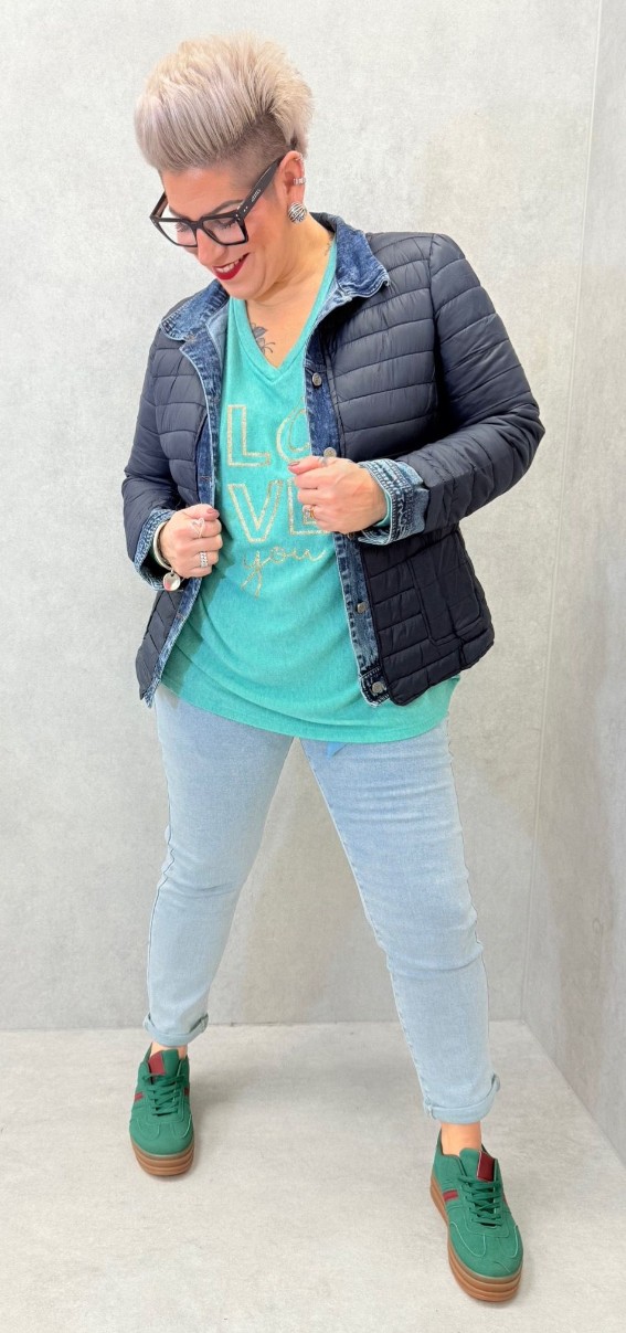 Doudoune finement matelassée, boutons, poches avec col et poignets en jeans