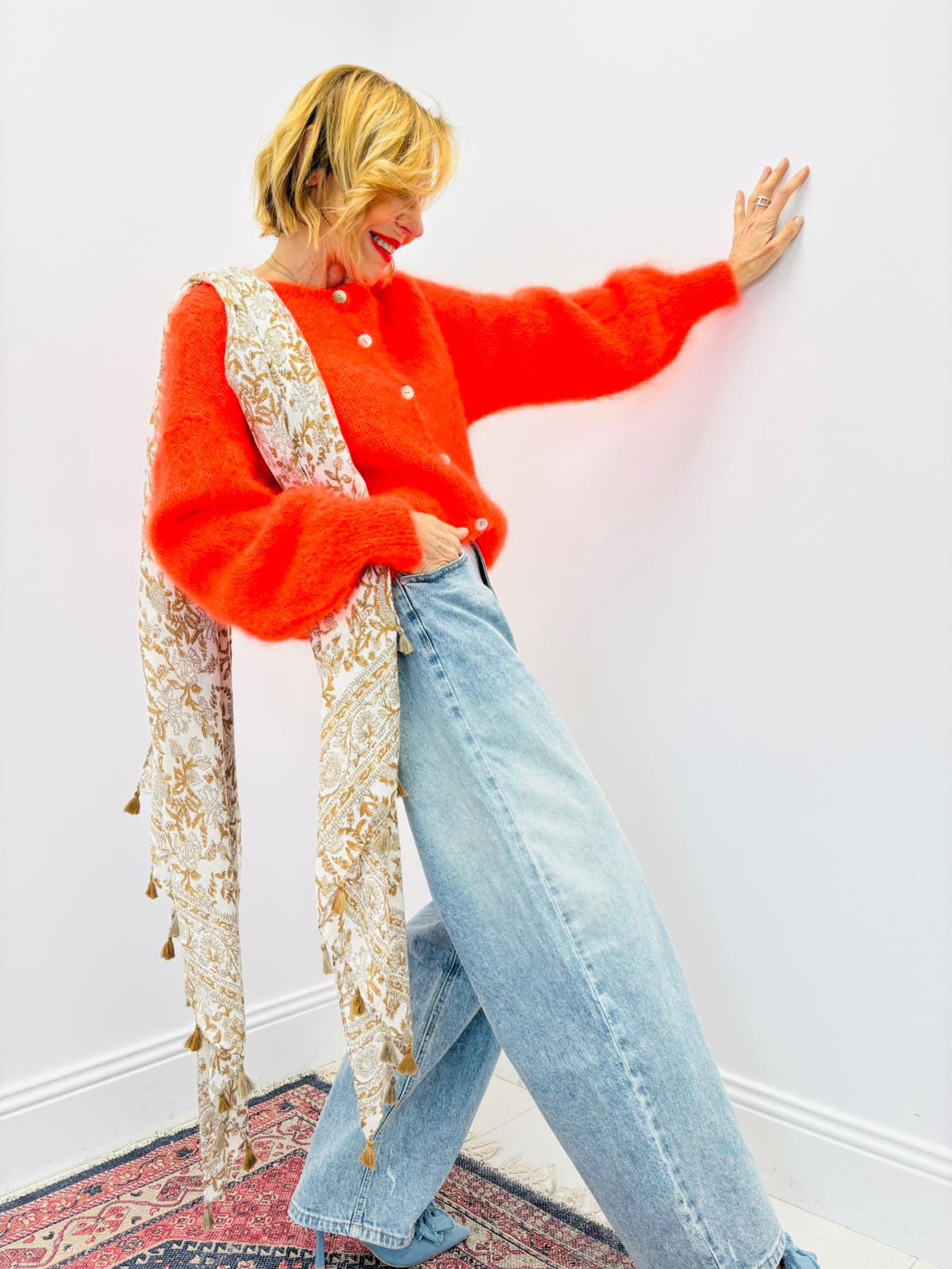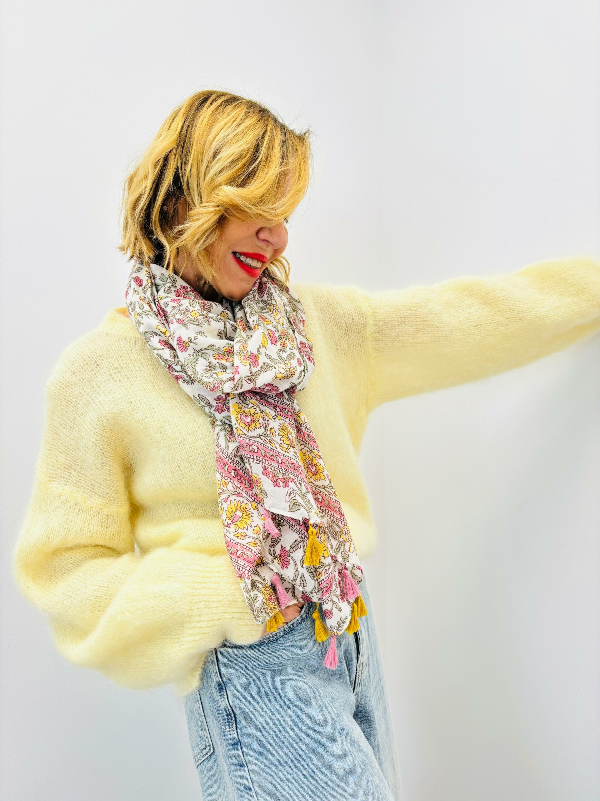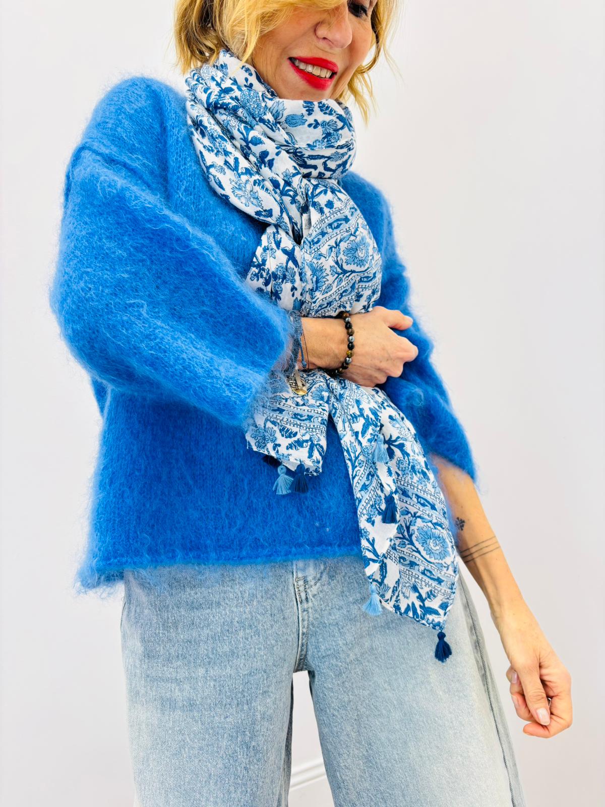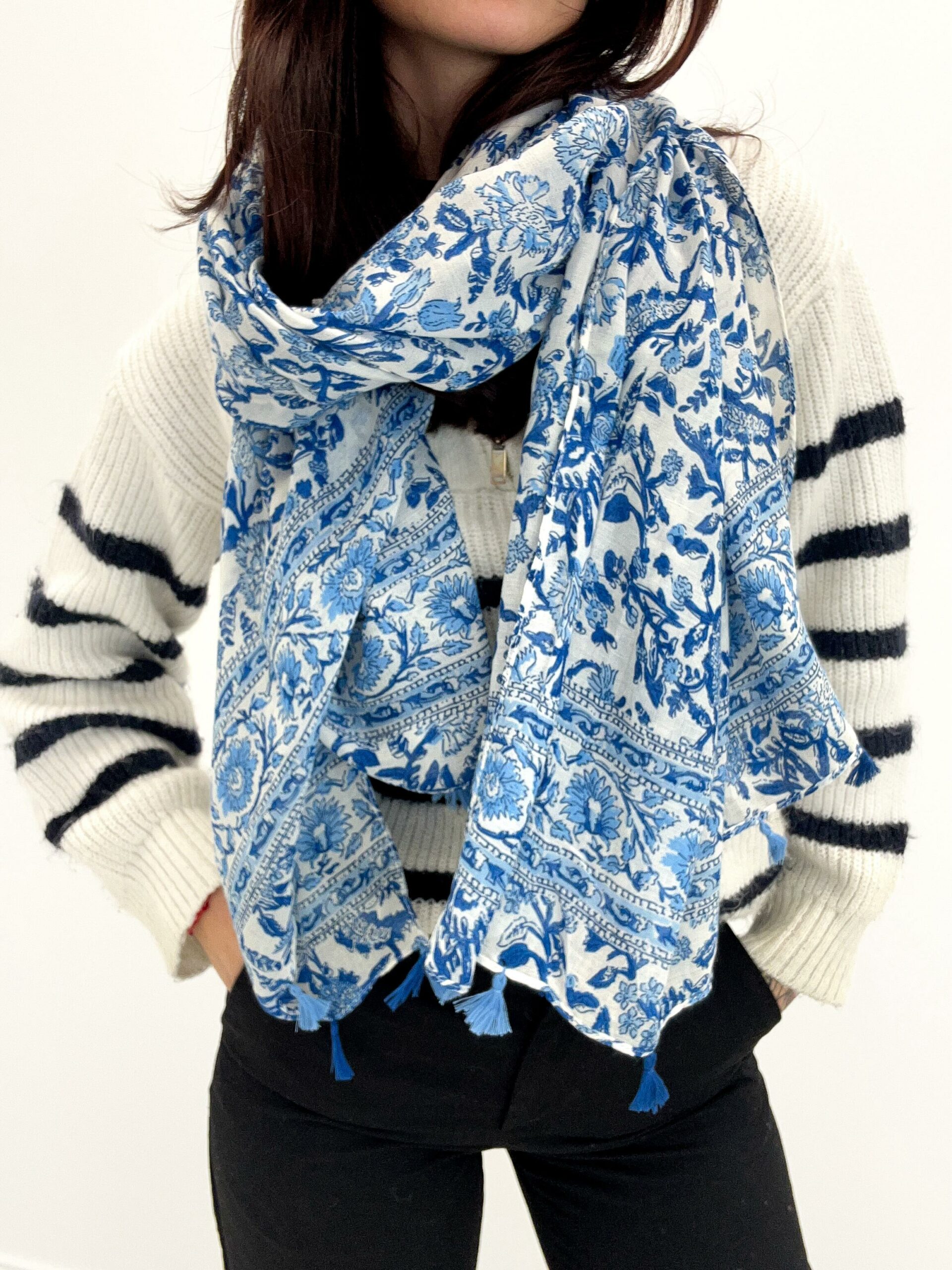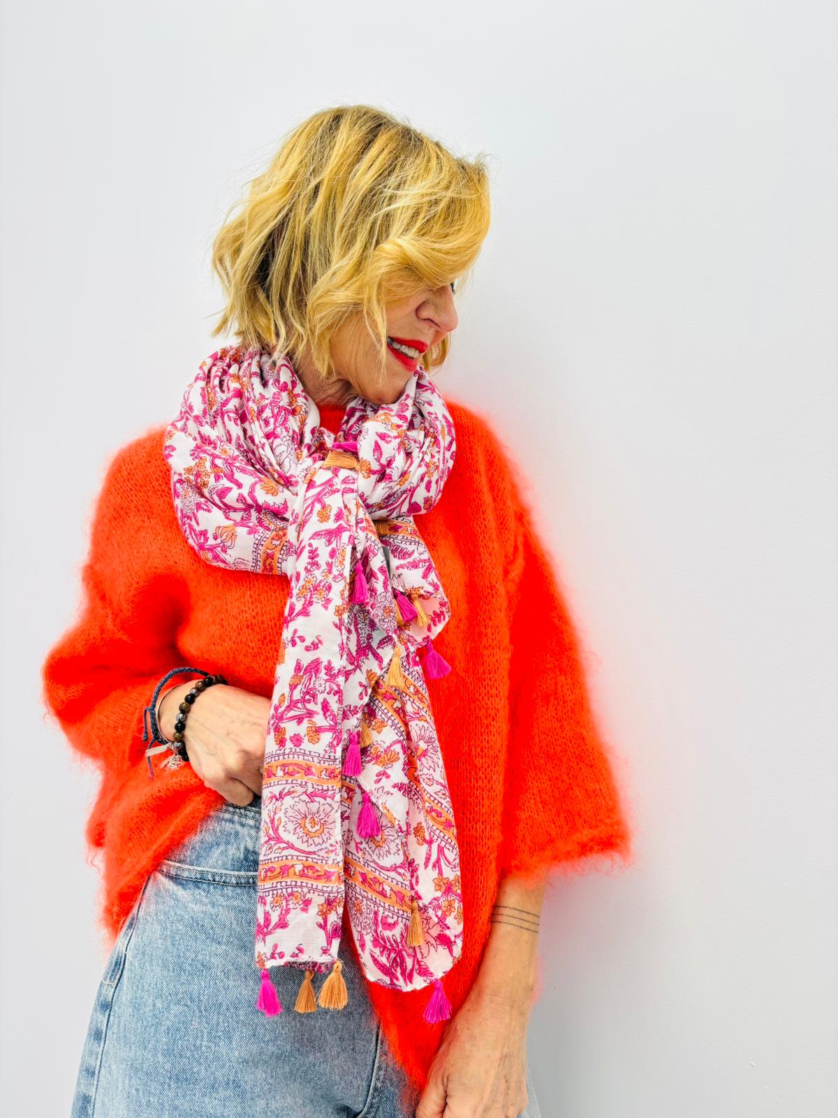 Foulard aux motifs liberty avec pompons