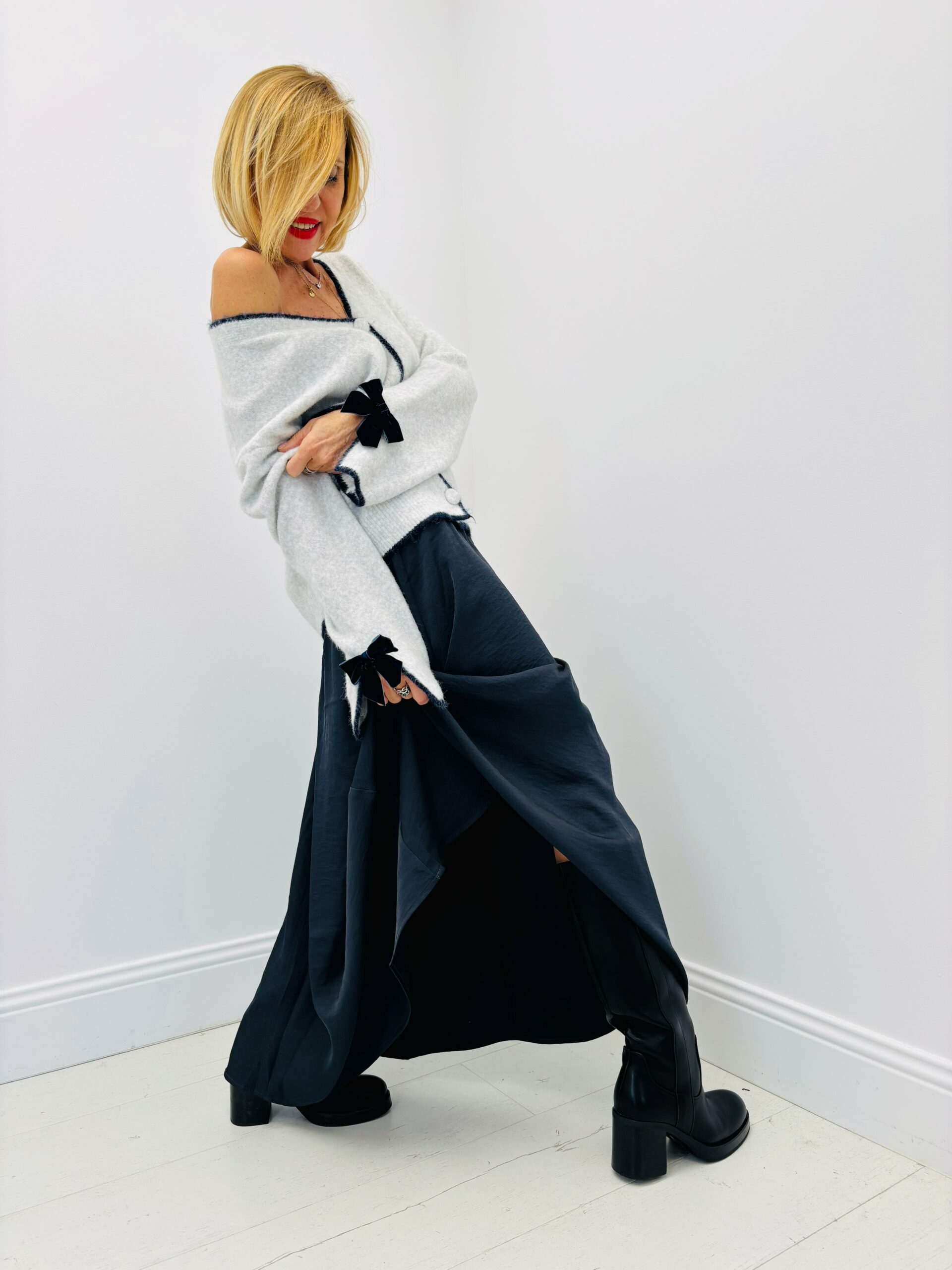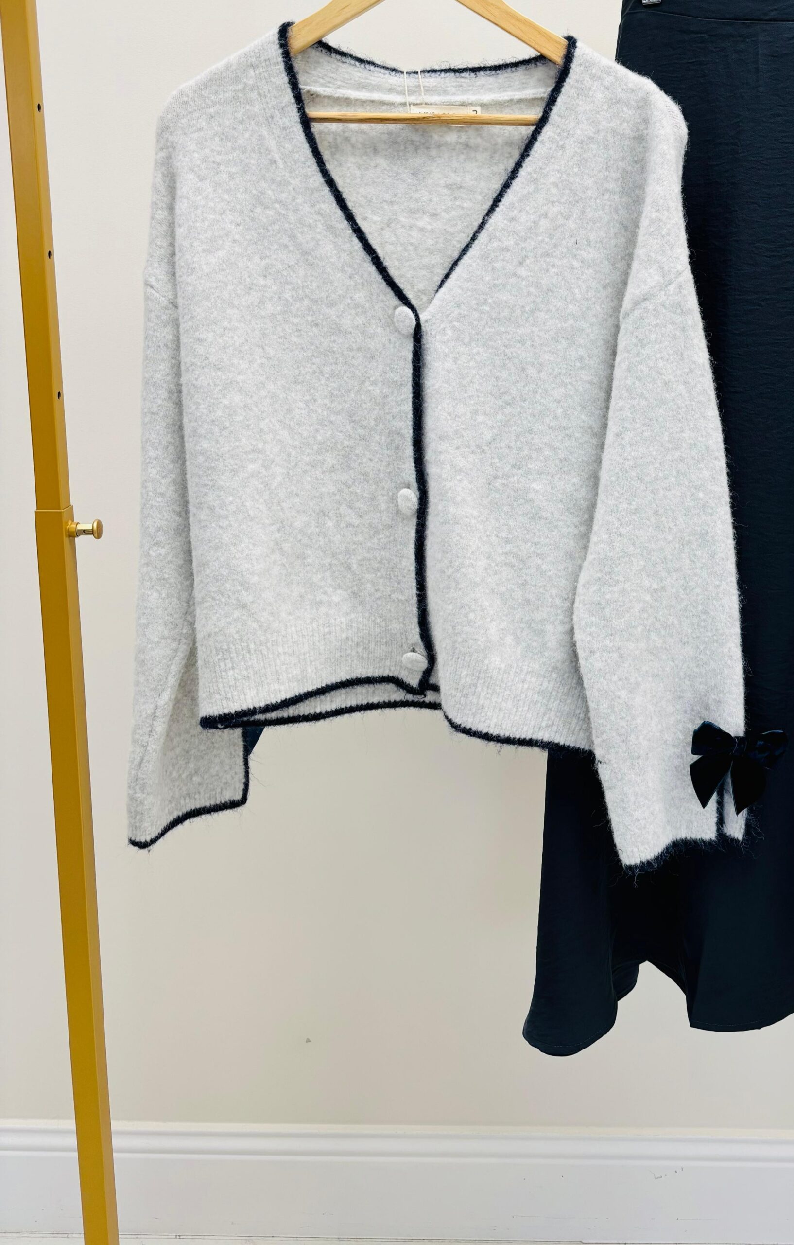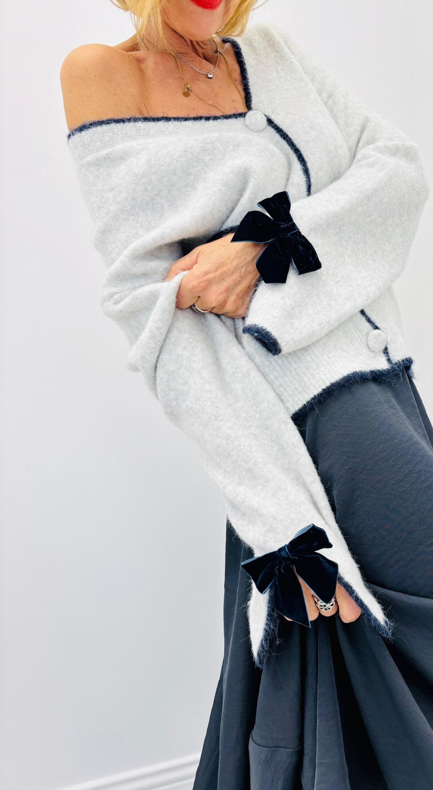Gilet gris avec bordure et nœuds dans le bas de la manche en velours, bleu marine foncé, boutonné, matière très douce