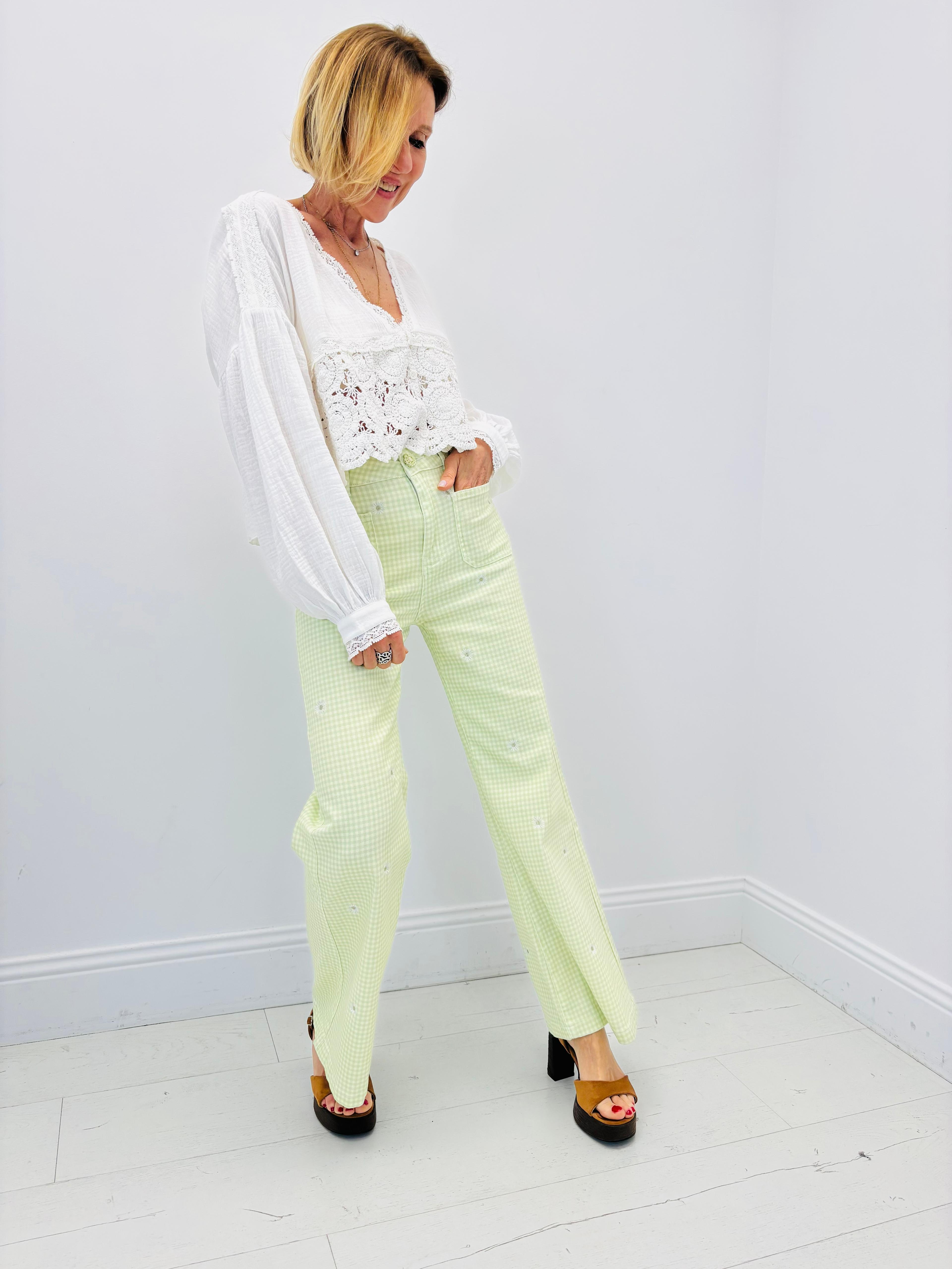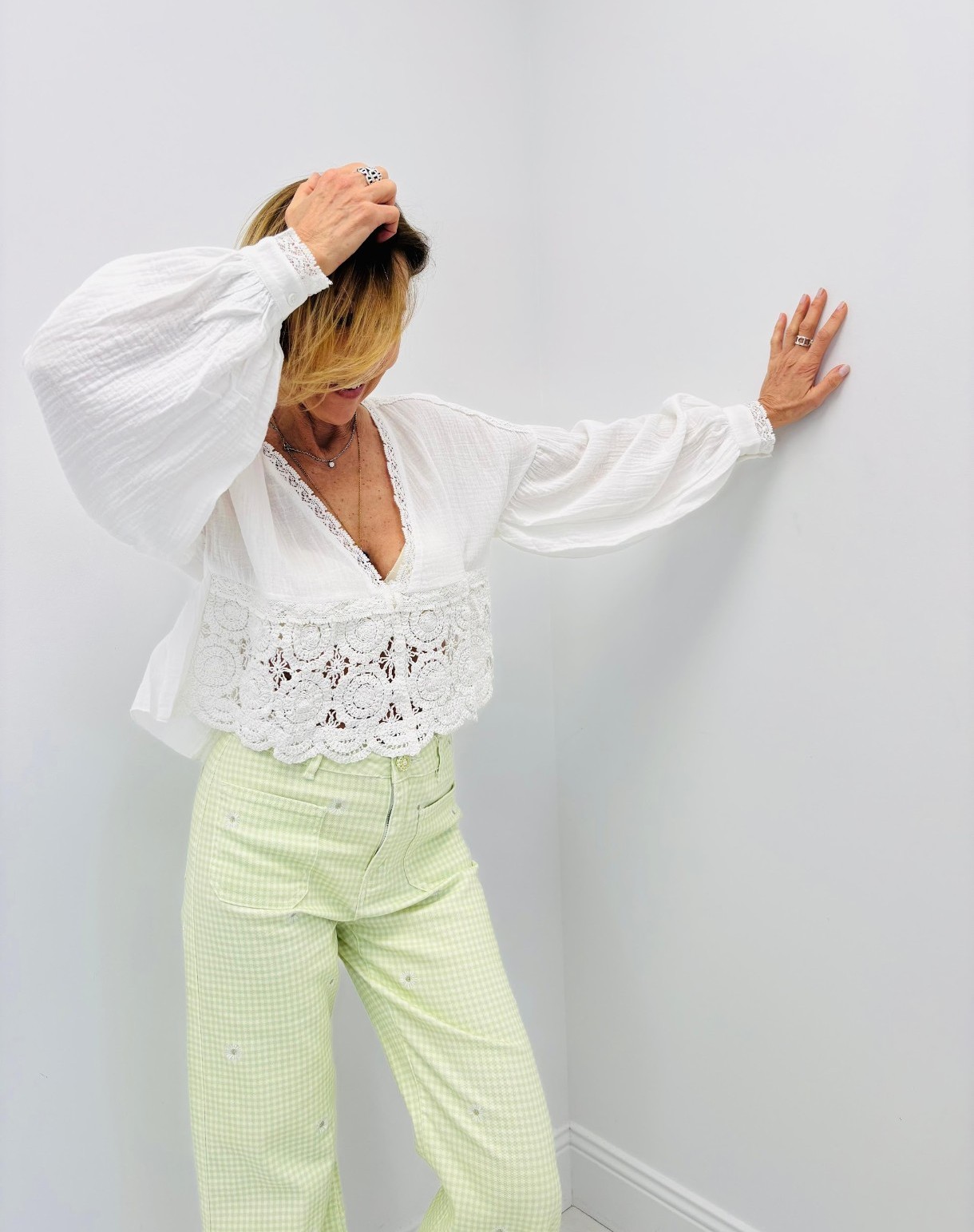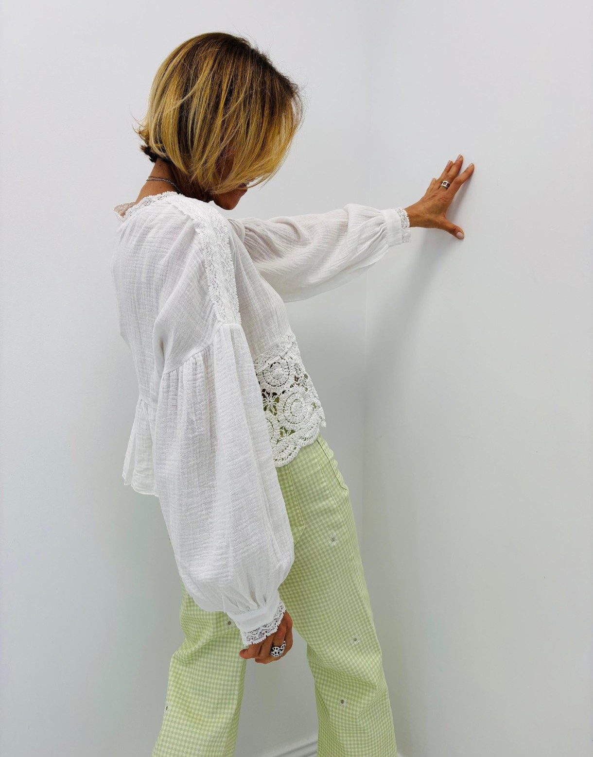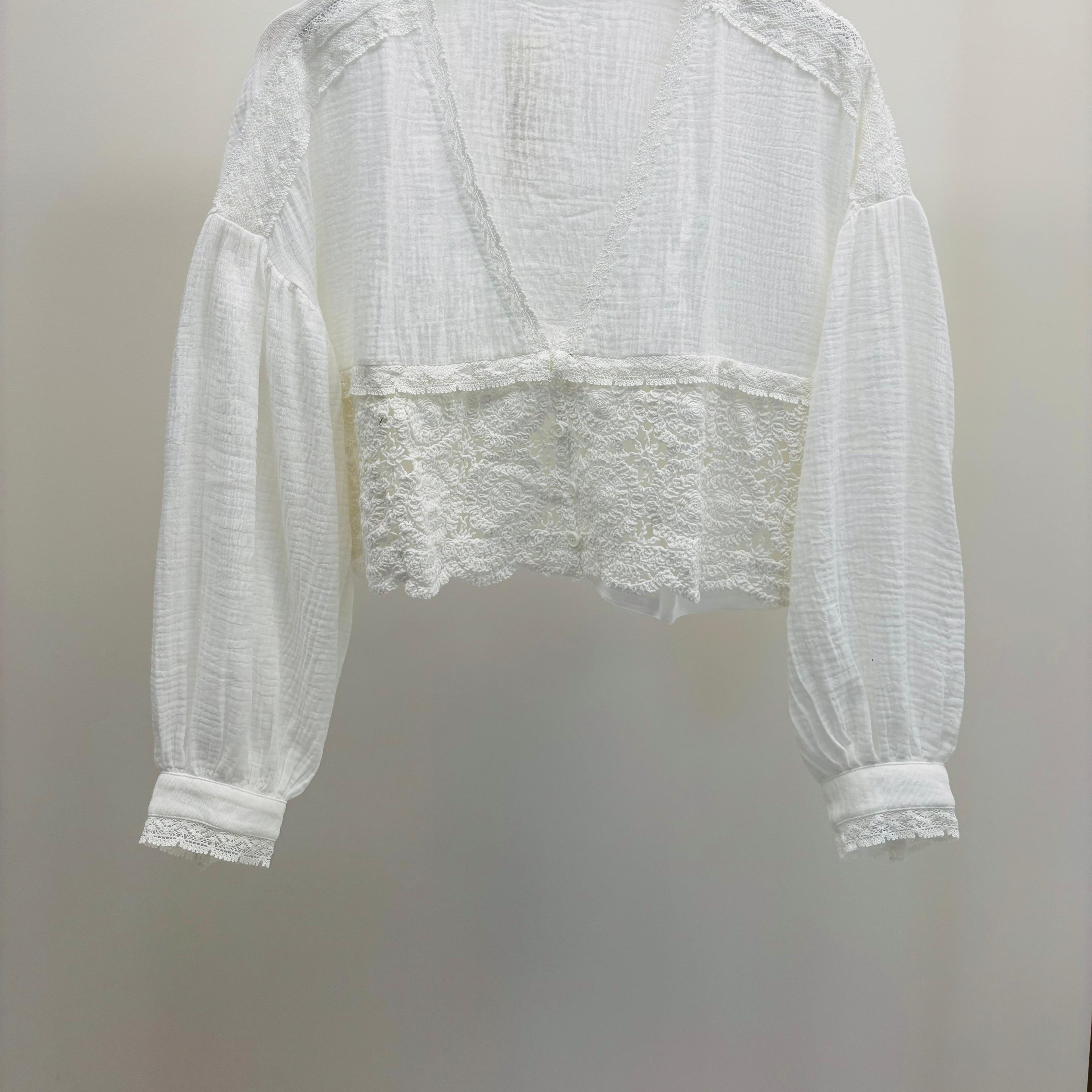 Gilet/ veste blanc, en gaze de coton avec de la broderie dans le bas devant, manches légèrement bouffantes