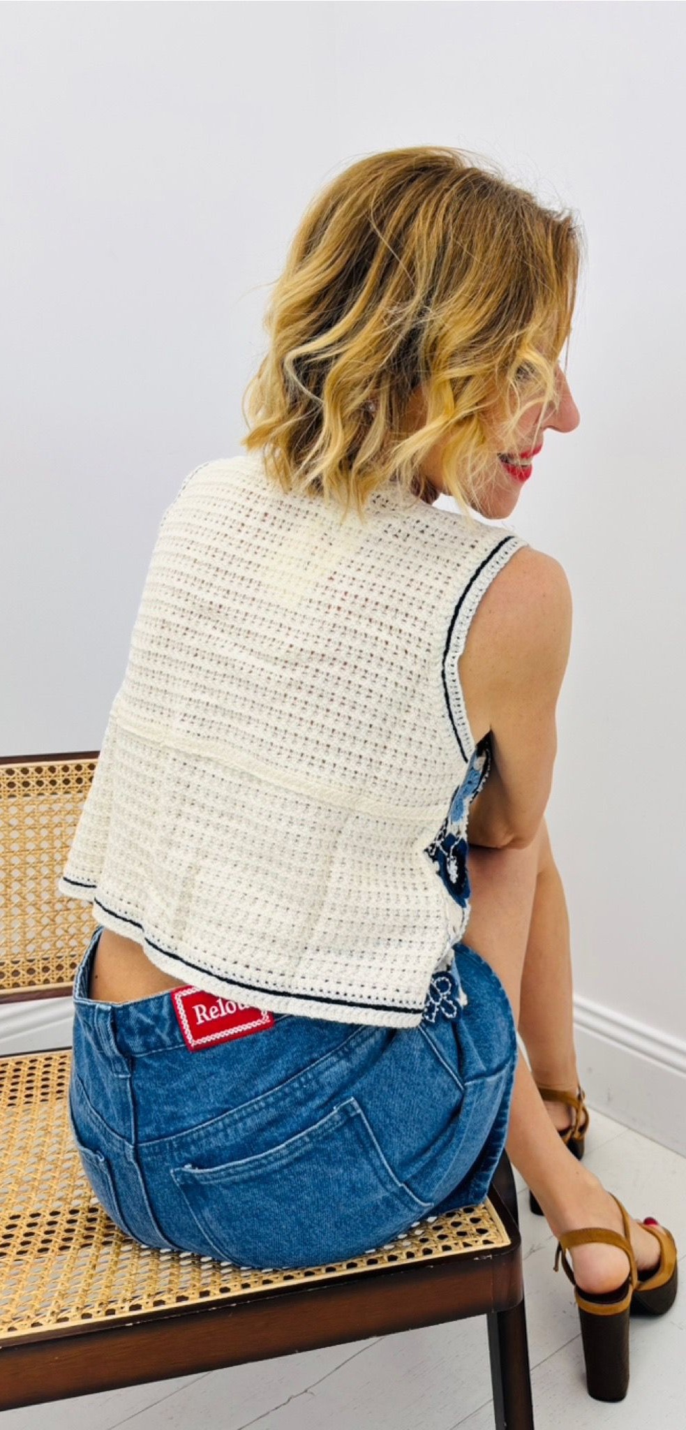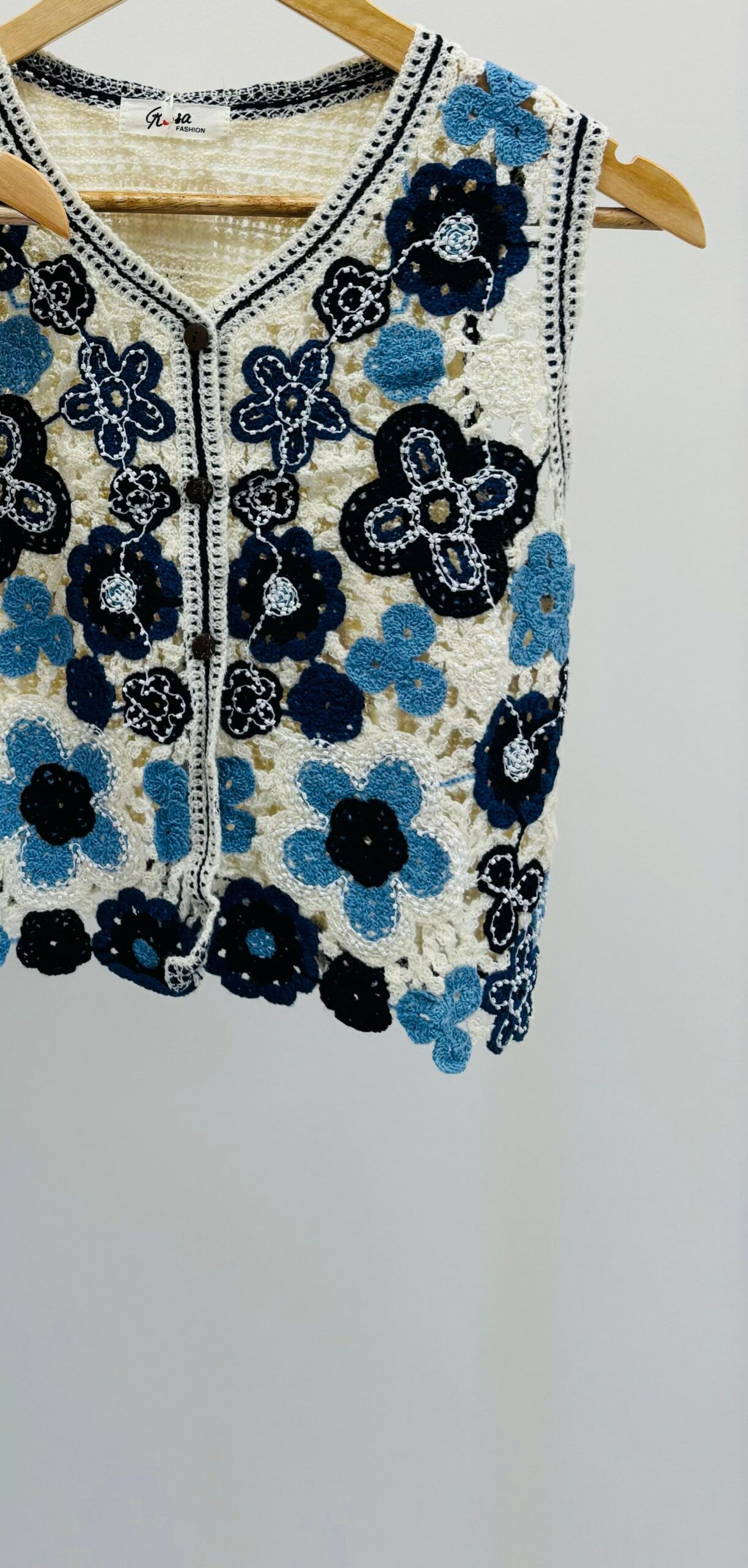 Gilet sans manche en crochet, motif fleurs, petites perles, boutons