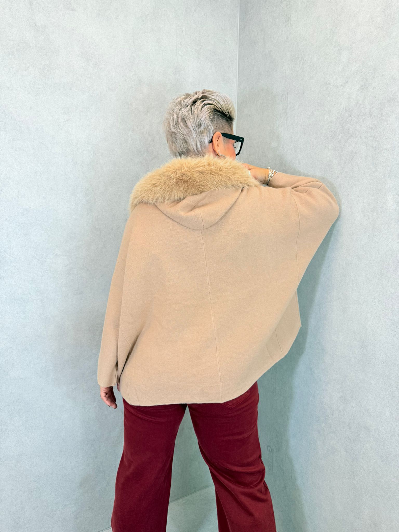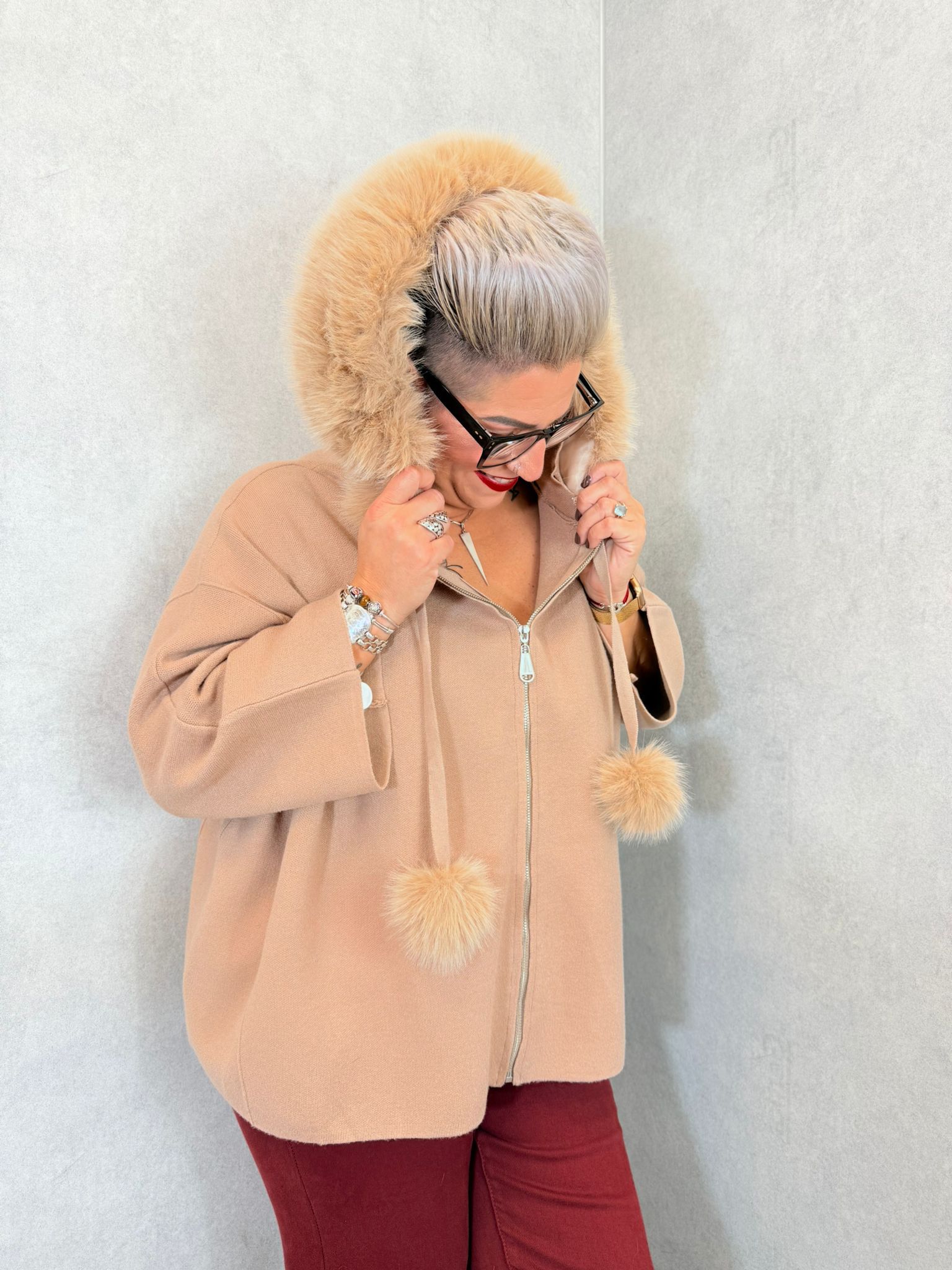 Gilet zippé, capuche, fausse fourrure, pompons, matière très douce, qui ne pique pas