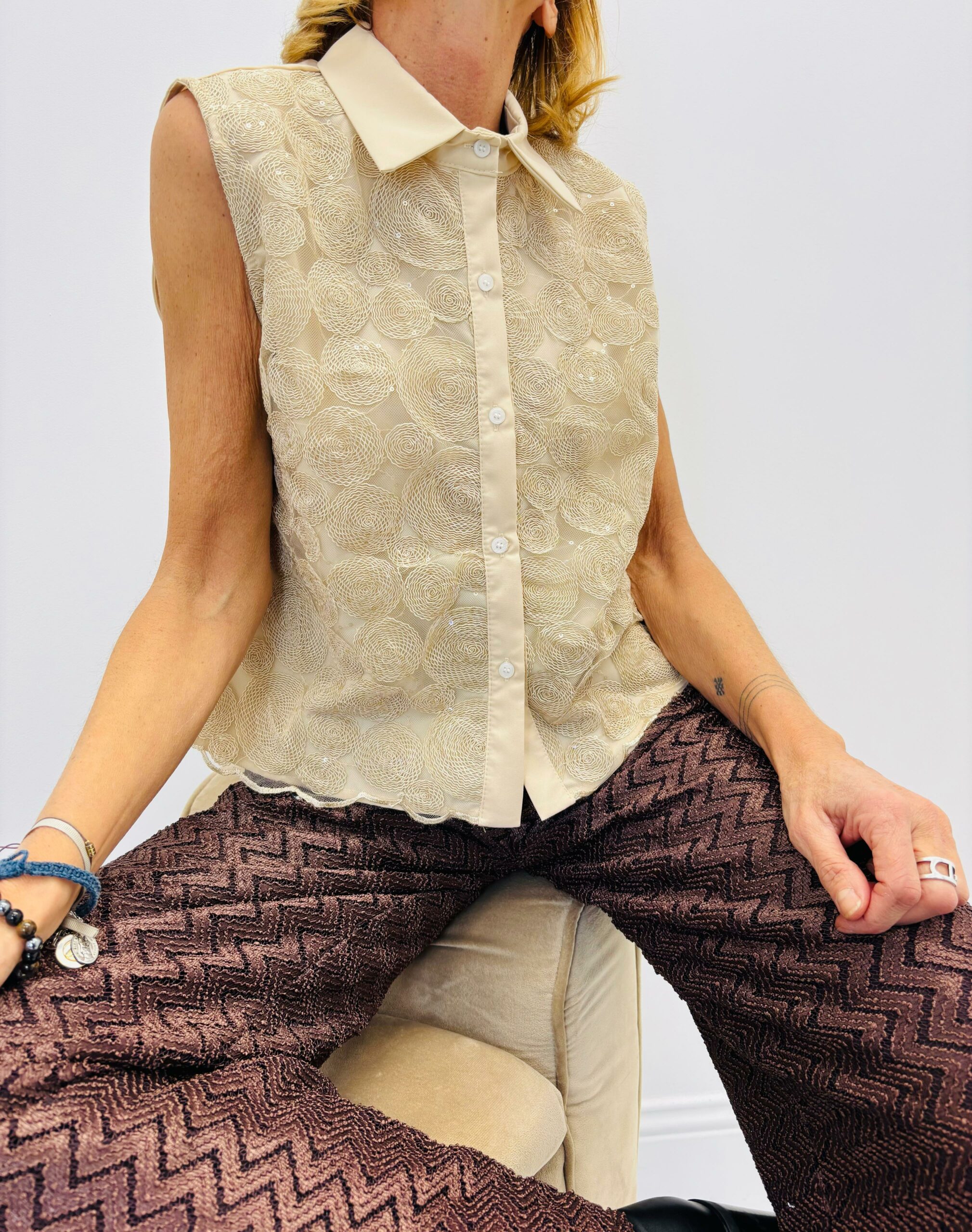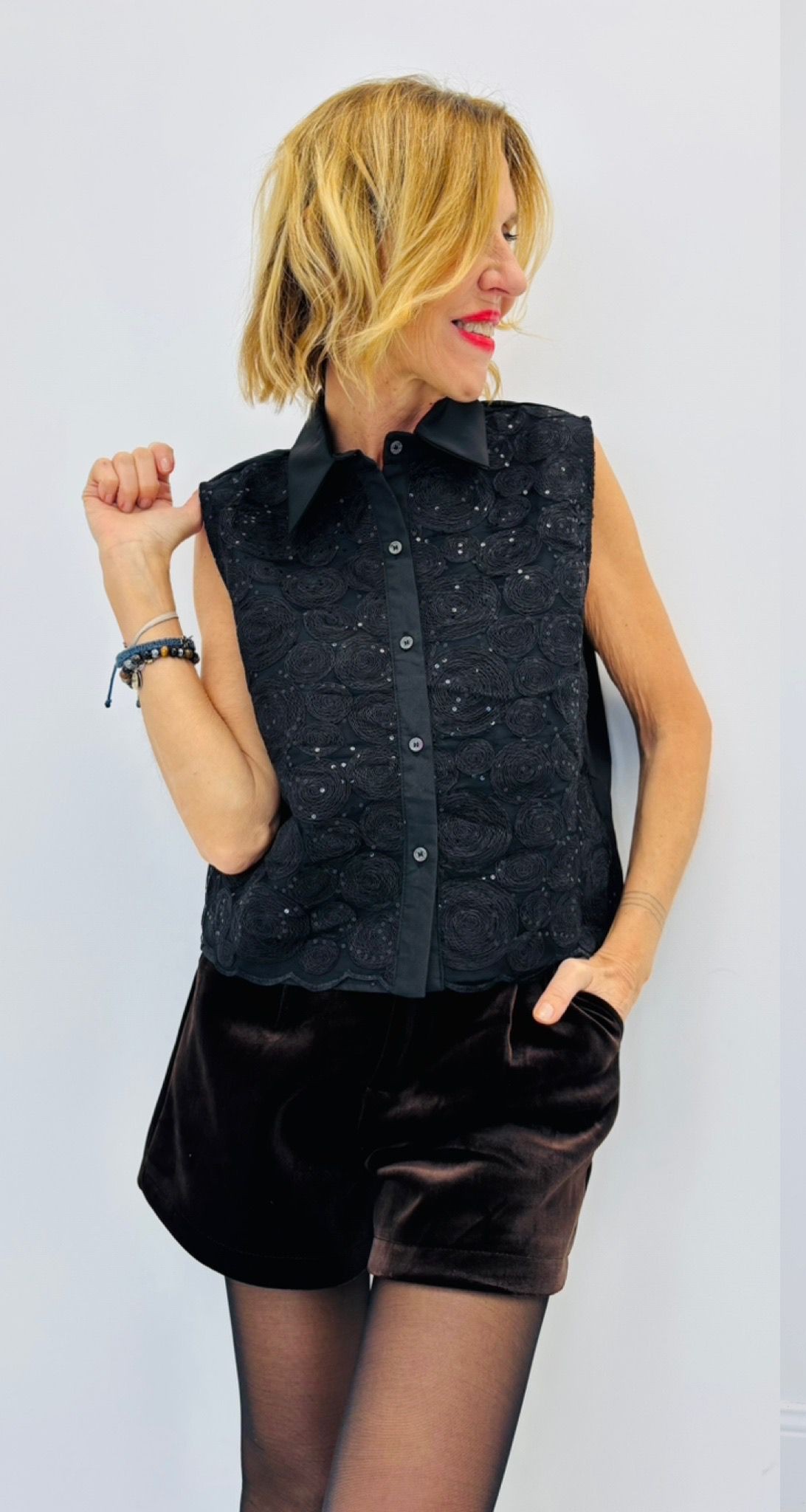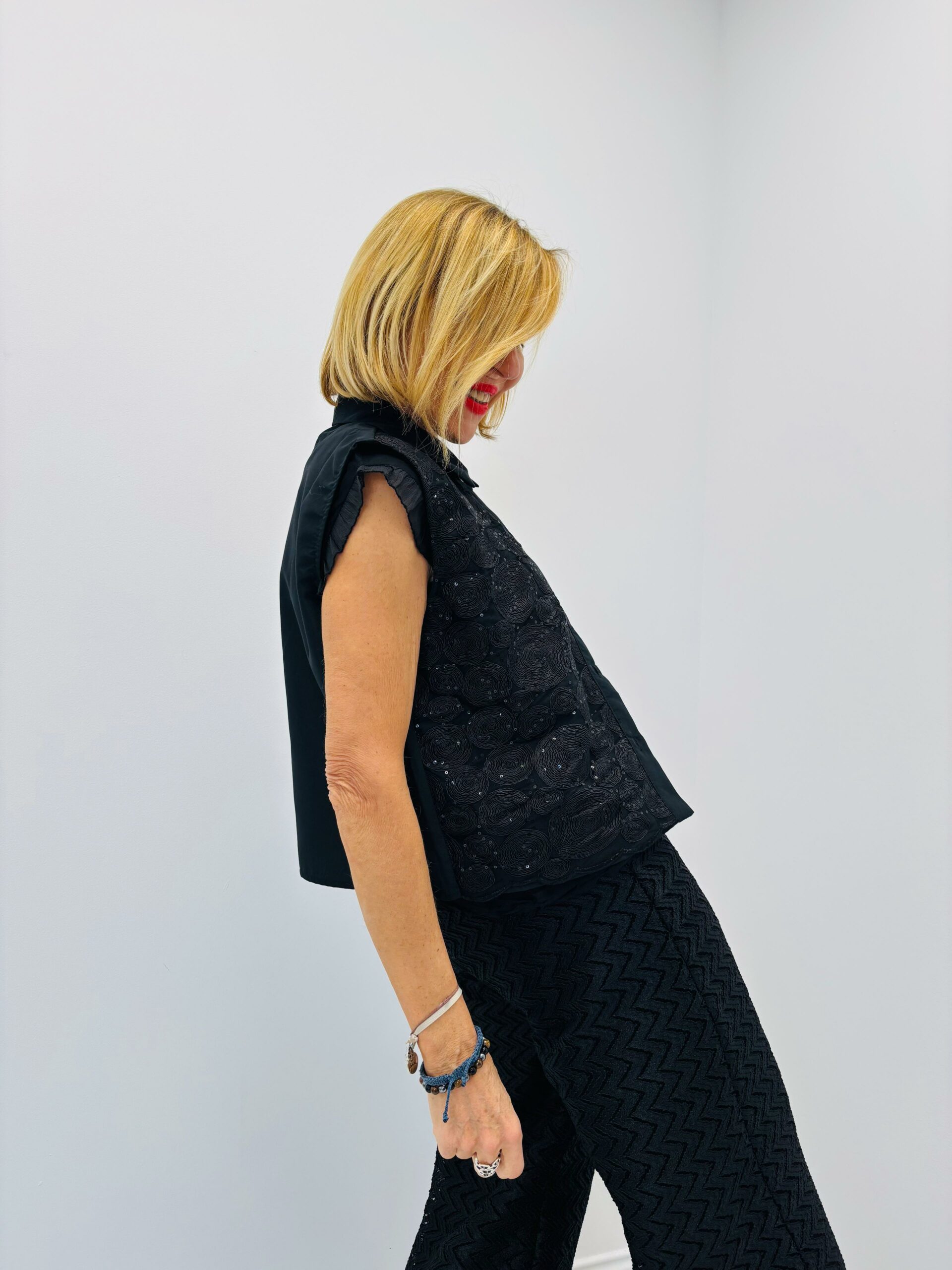 Gilet noir sans manches doublé avec jolis motifs, boutonné, petits sequins