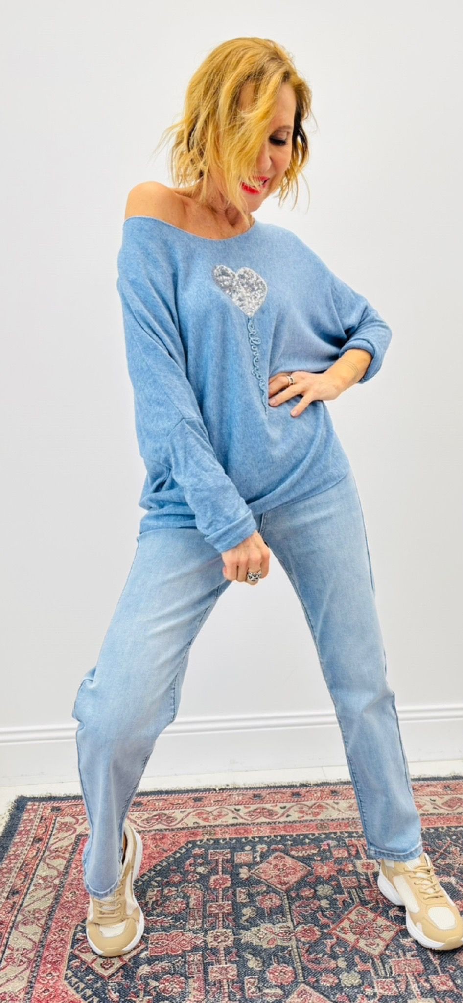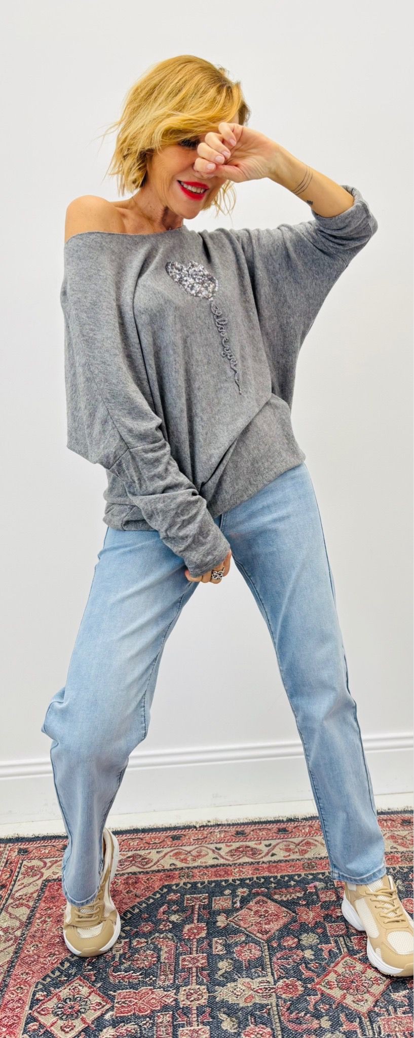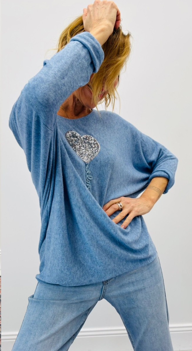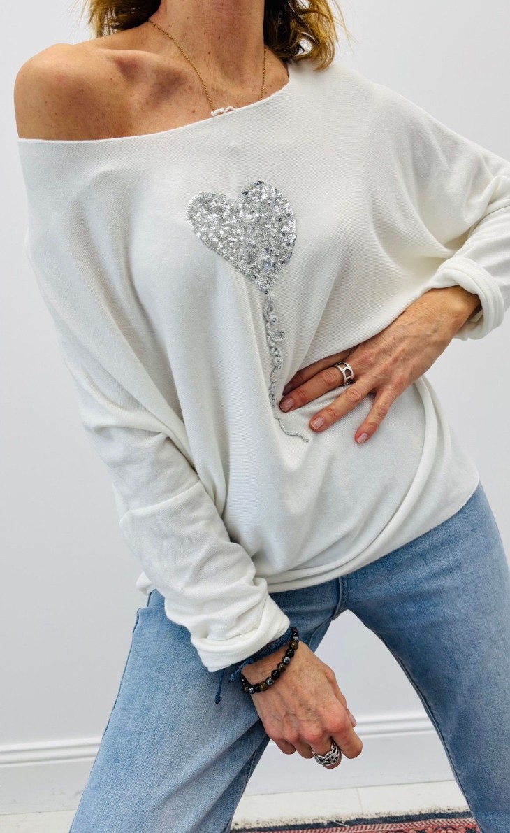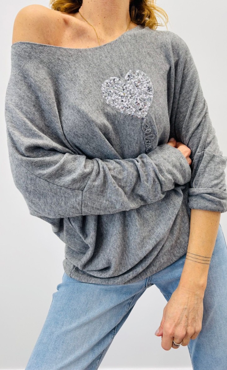 Haut avec cœur en sequins argent, encolure ronde