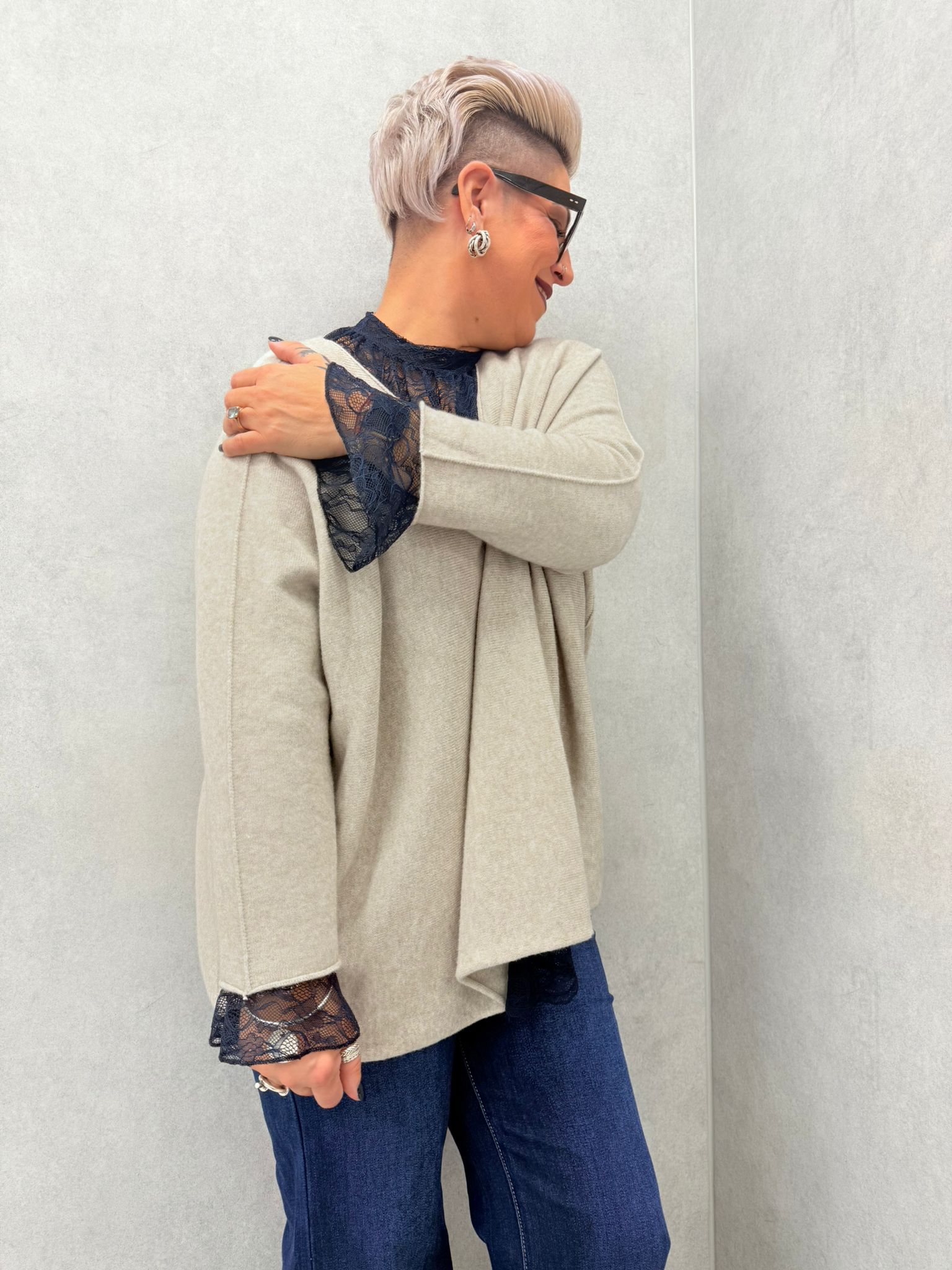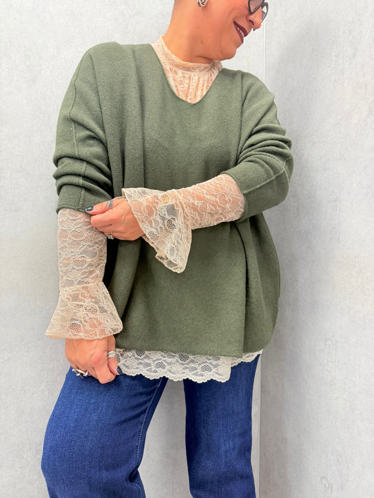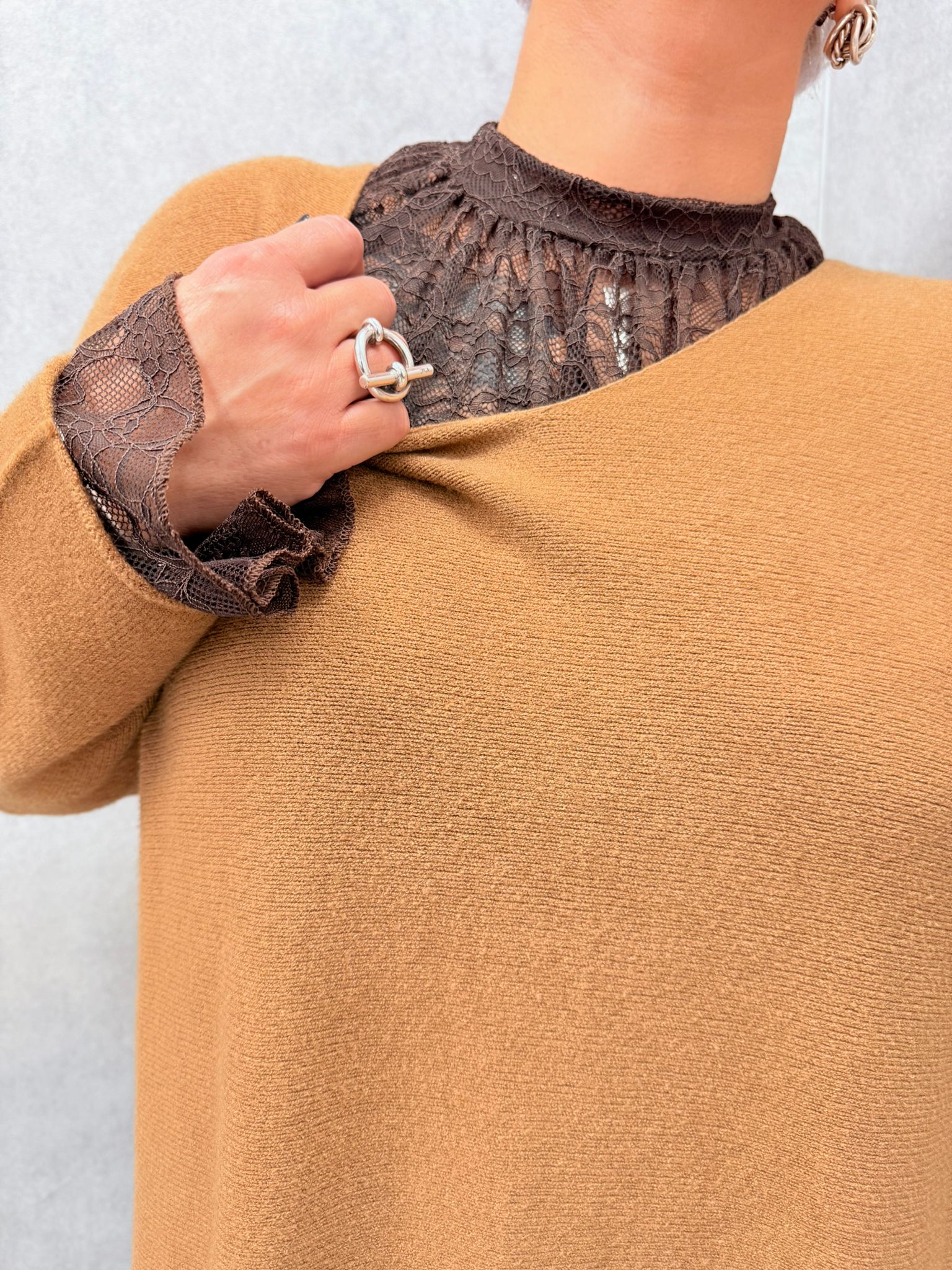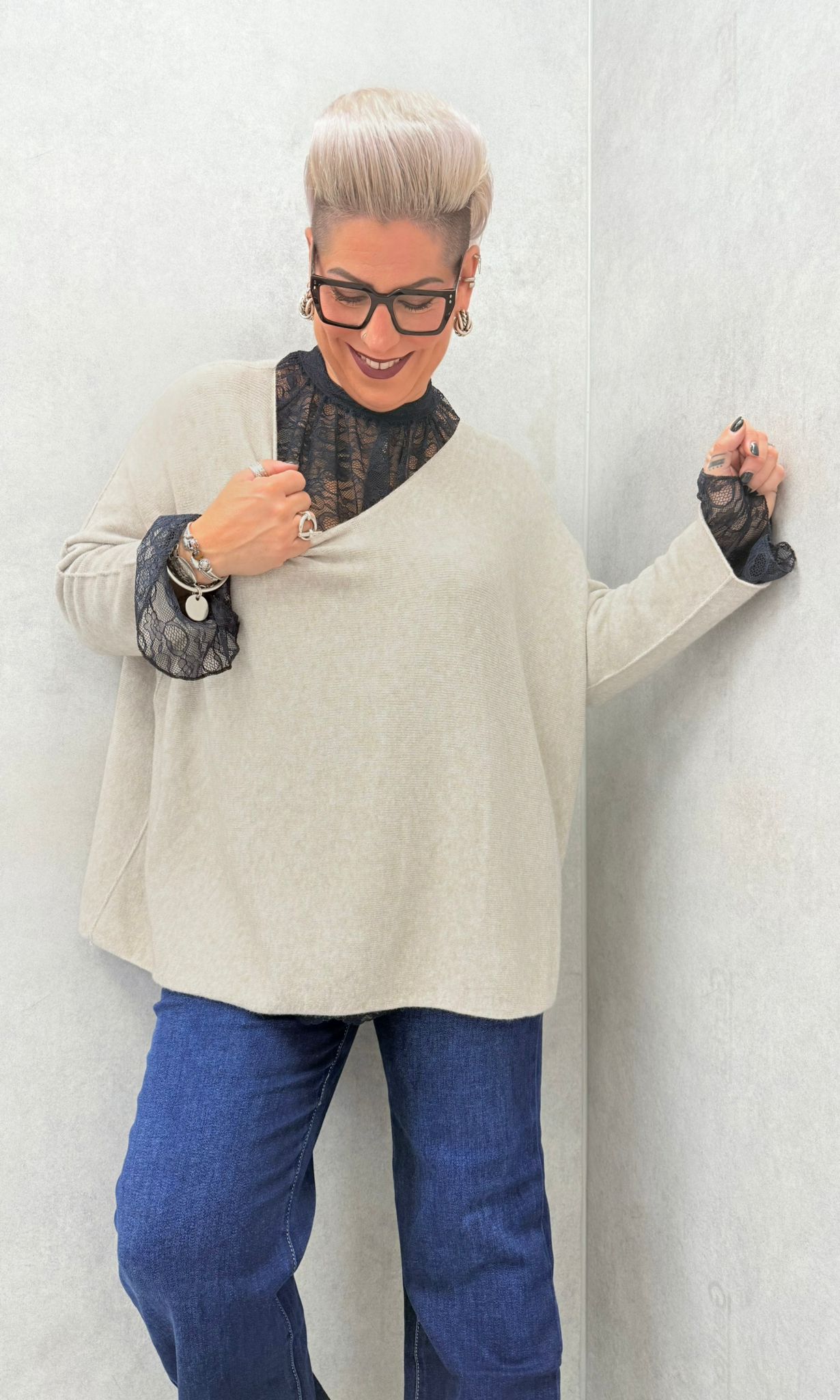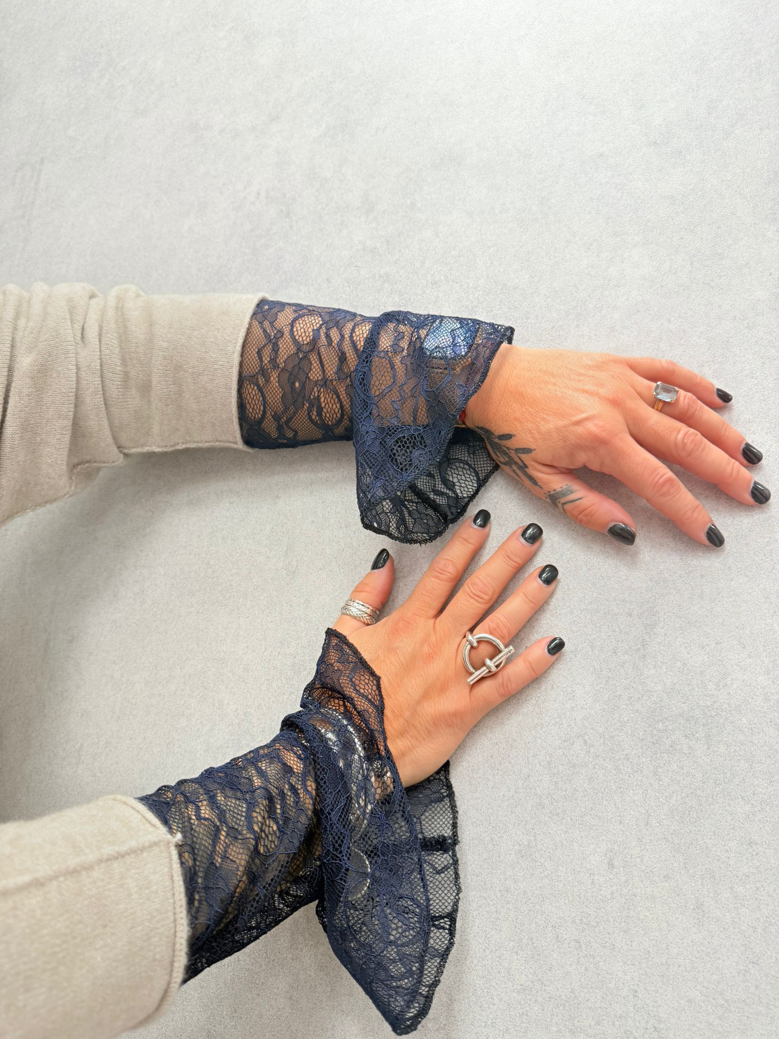 Haut fin tout en transparence, dentelle, col montant, poignets serrés sauf sur le top noir