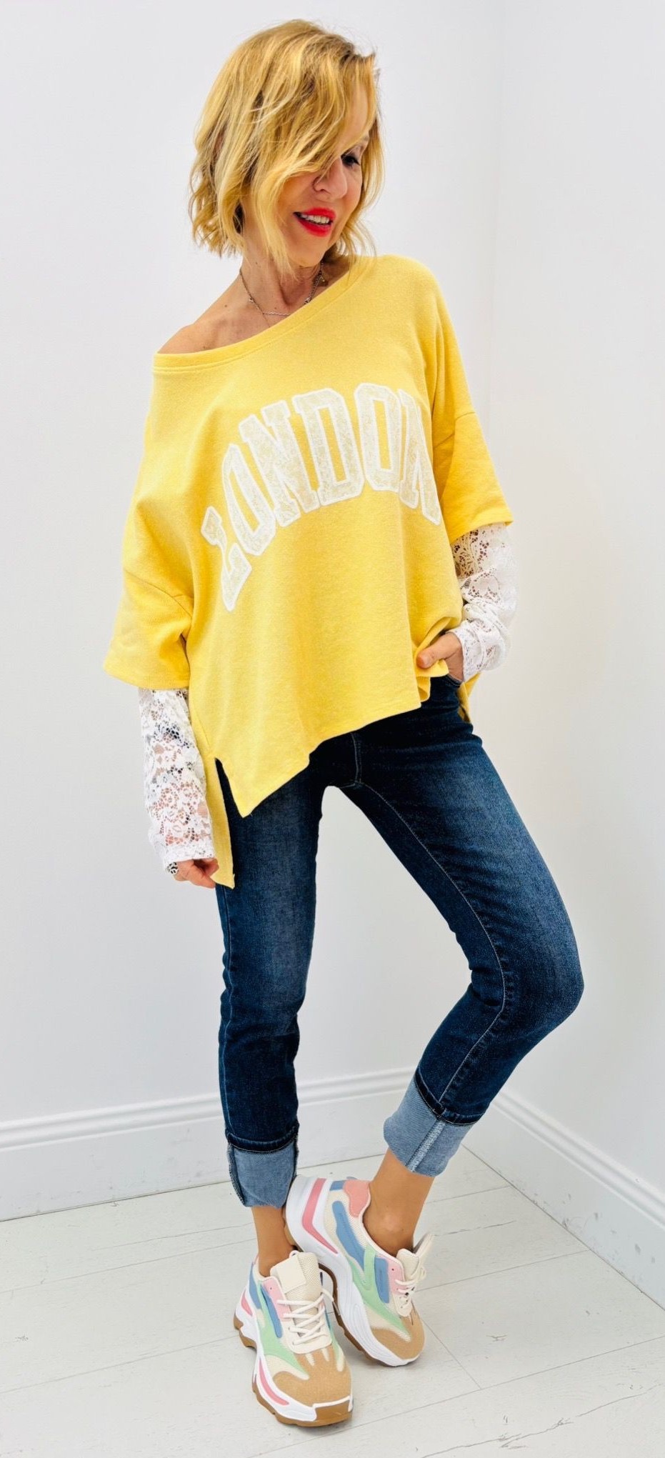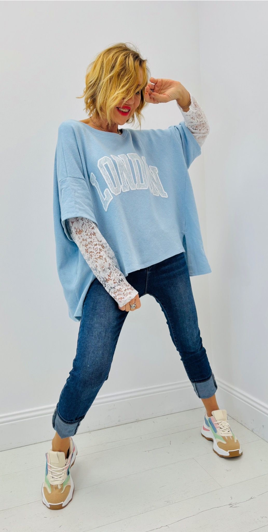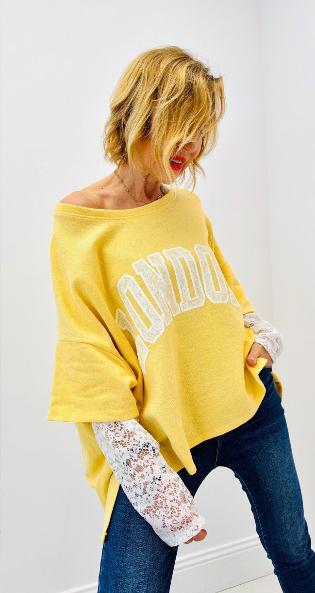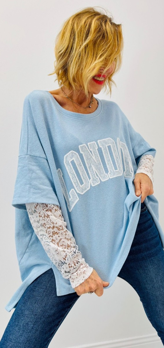 Haut « London », manches en dentelle, intégrées au haut, matière sweat, plus court devant