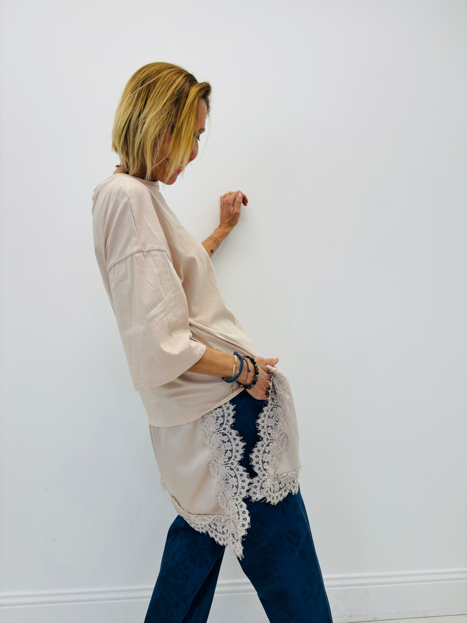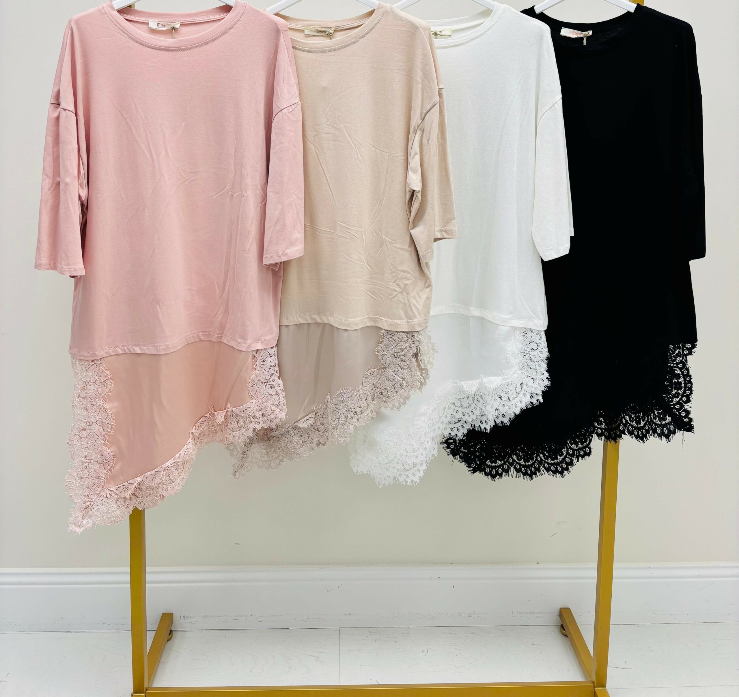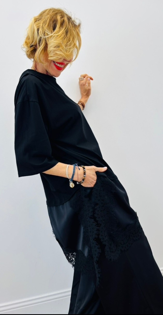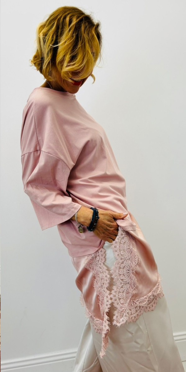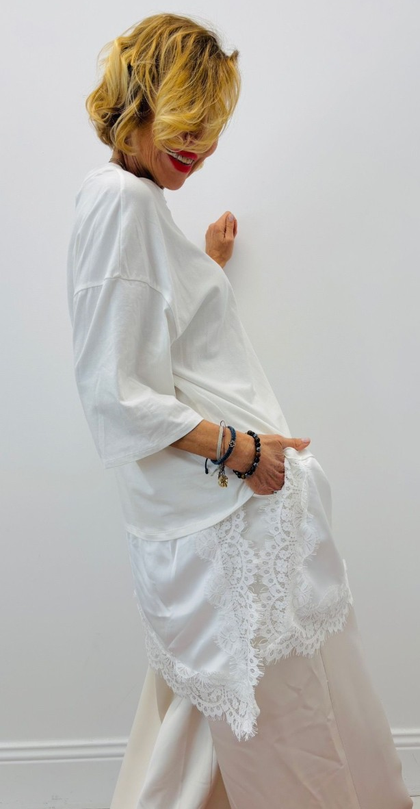 Haut façon tshirt long découpe asymétrique avec dentelle, manches courtes, col rond, très tendance sur les réseaux