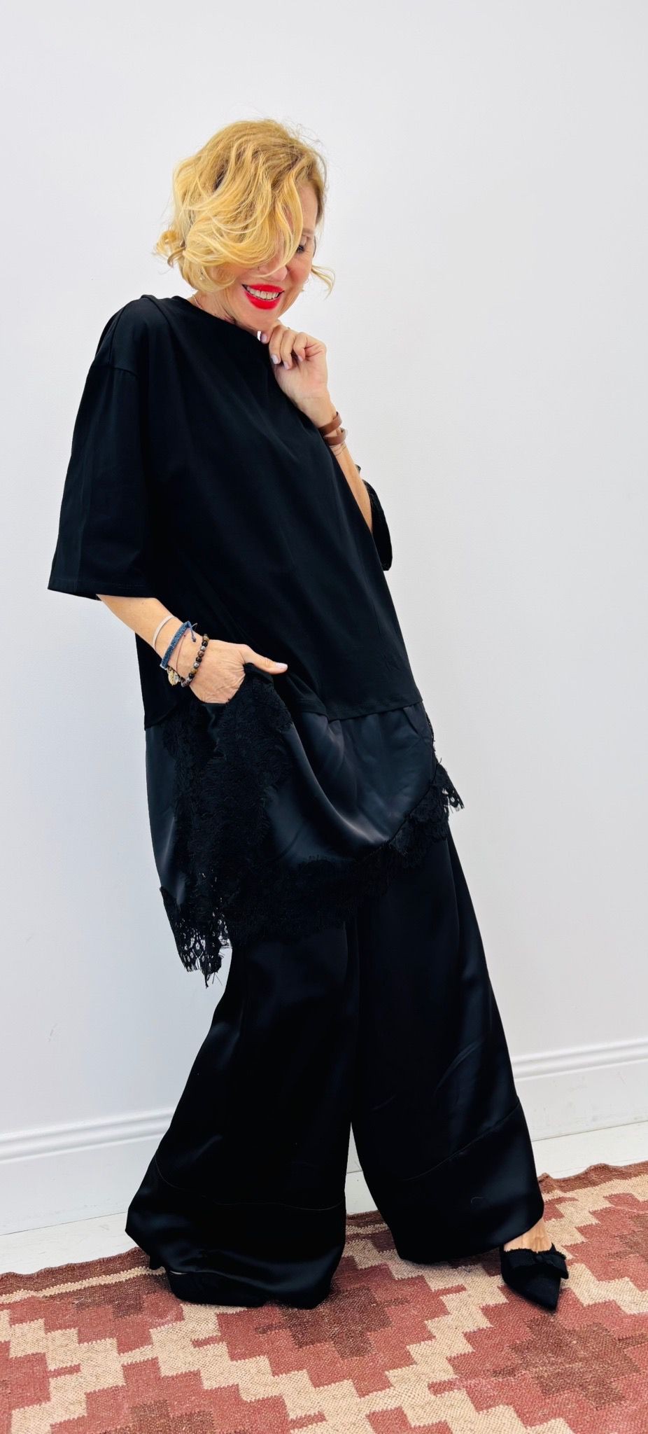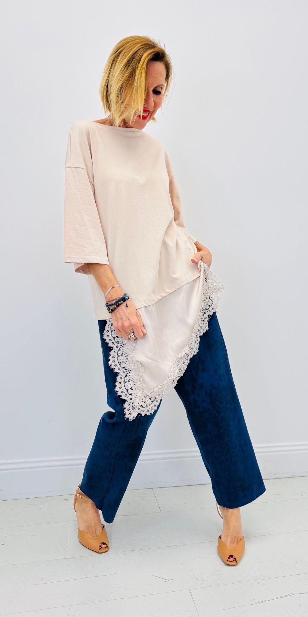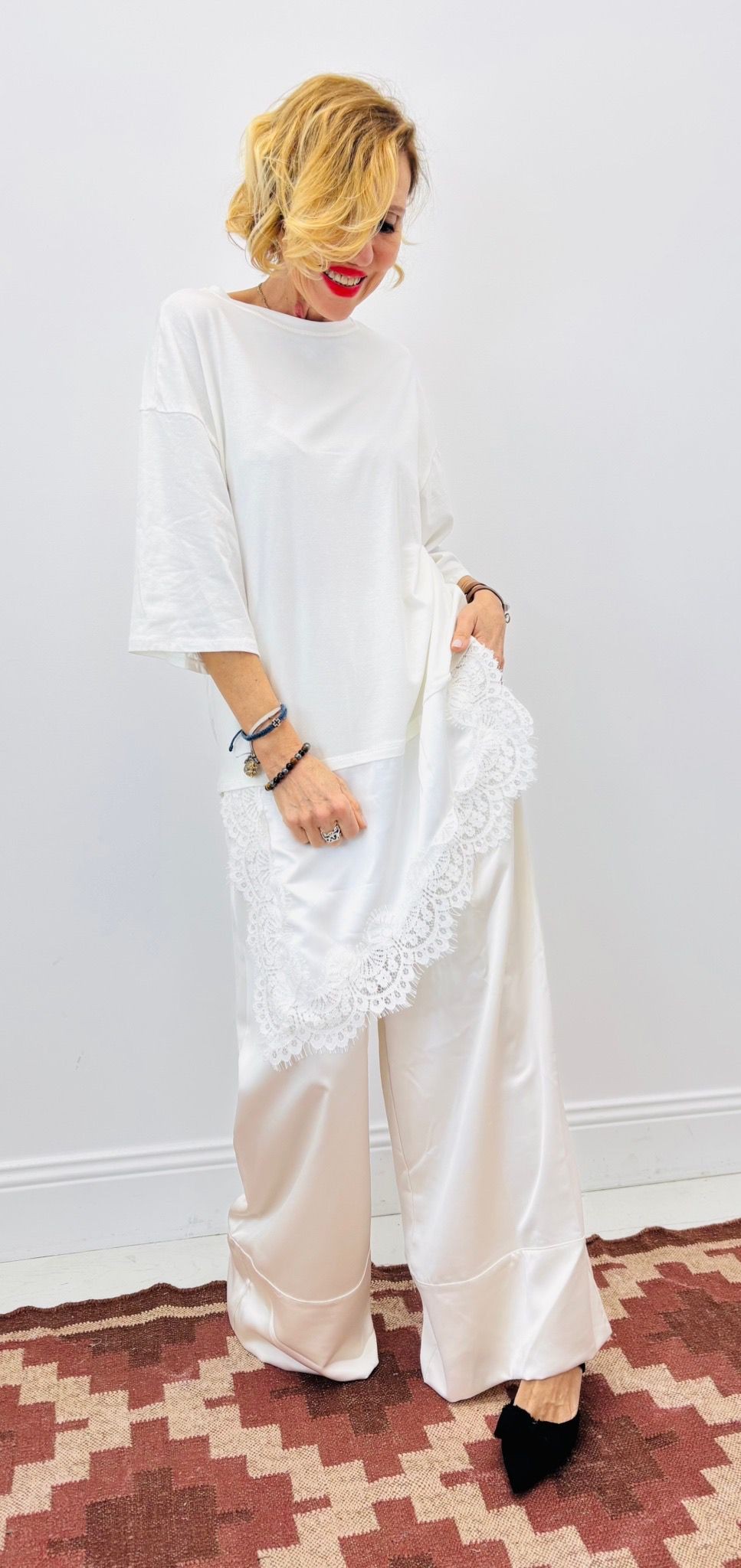 Haut façon tshirt long découpe asymétrique avec dentelle, manches courtes, col rond, très tendance sur les réseaux