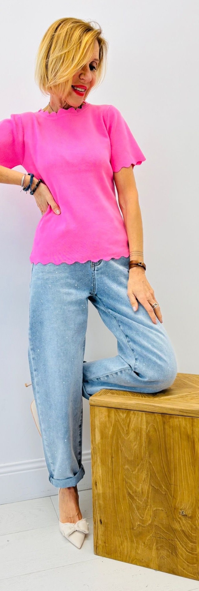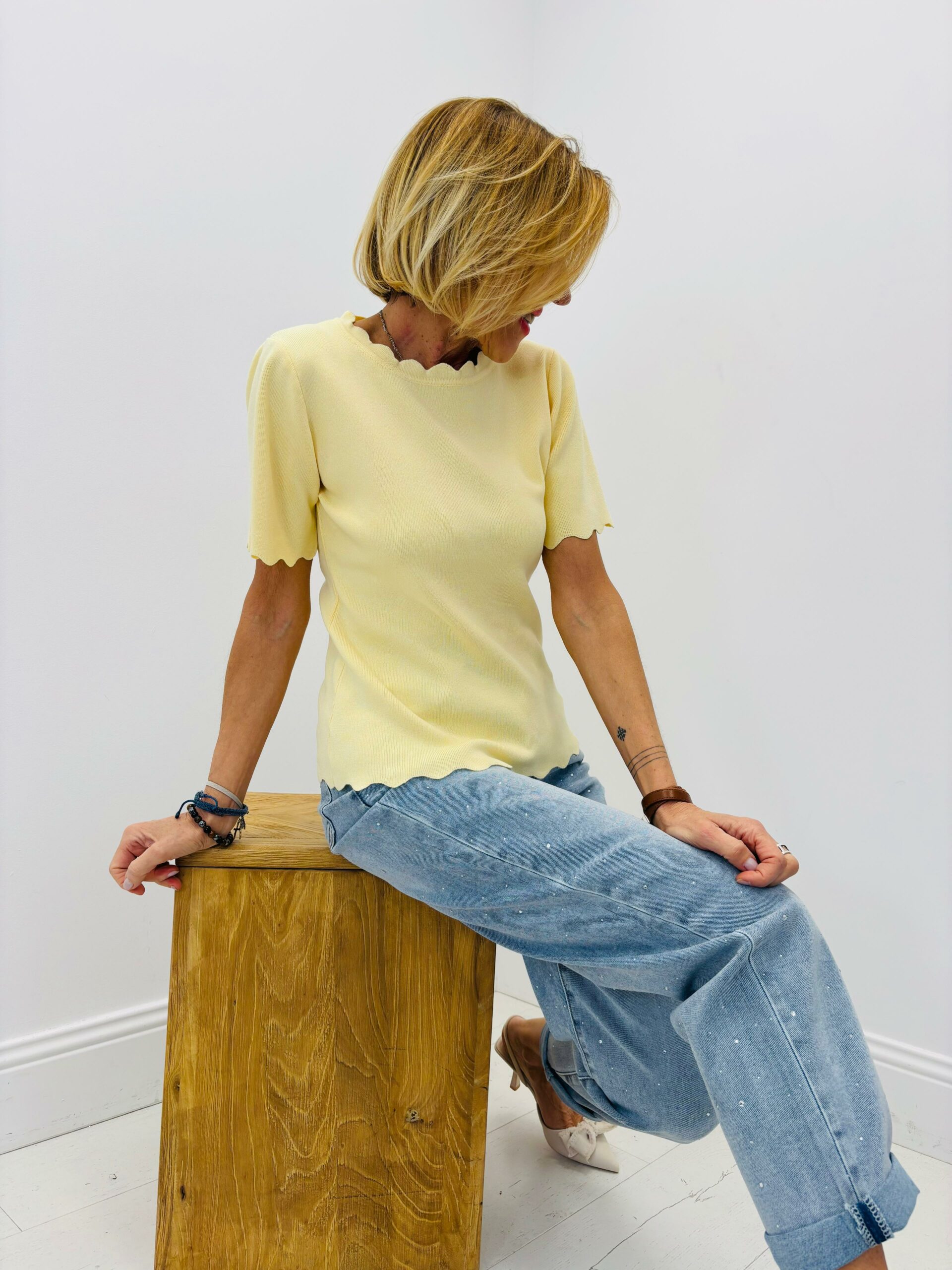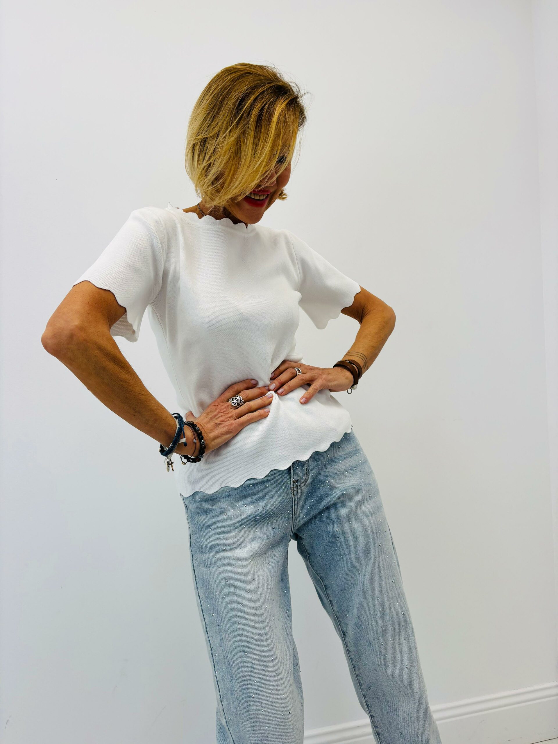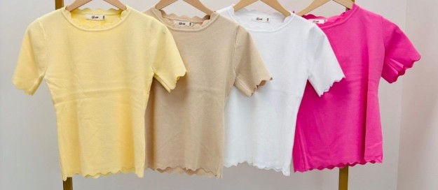 Haut légèrement côtelé,assez près du corps, encolure ronde, effet « vagues « au col, manches et bas