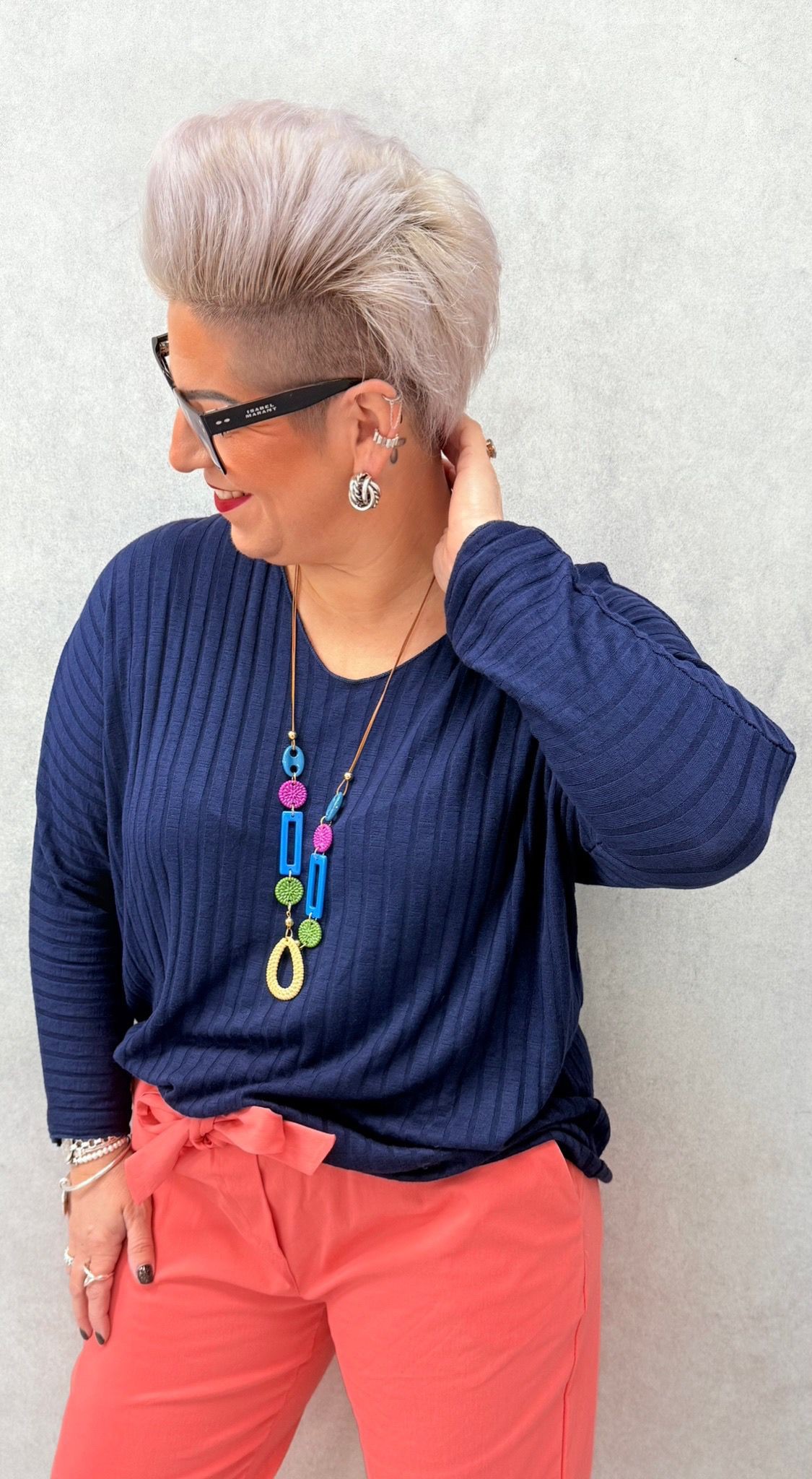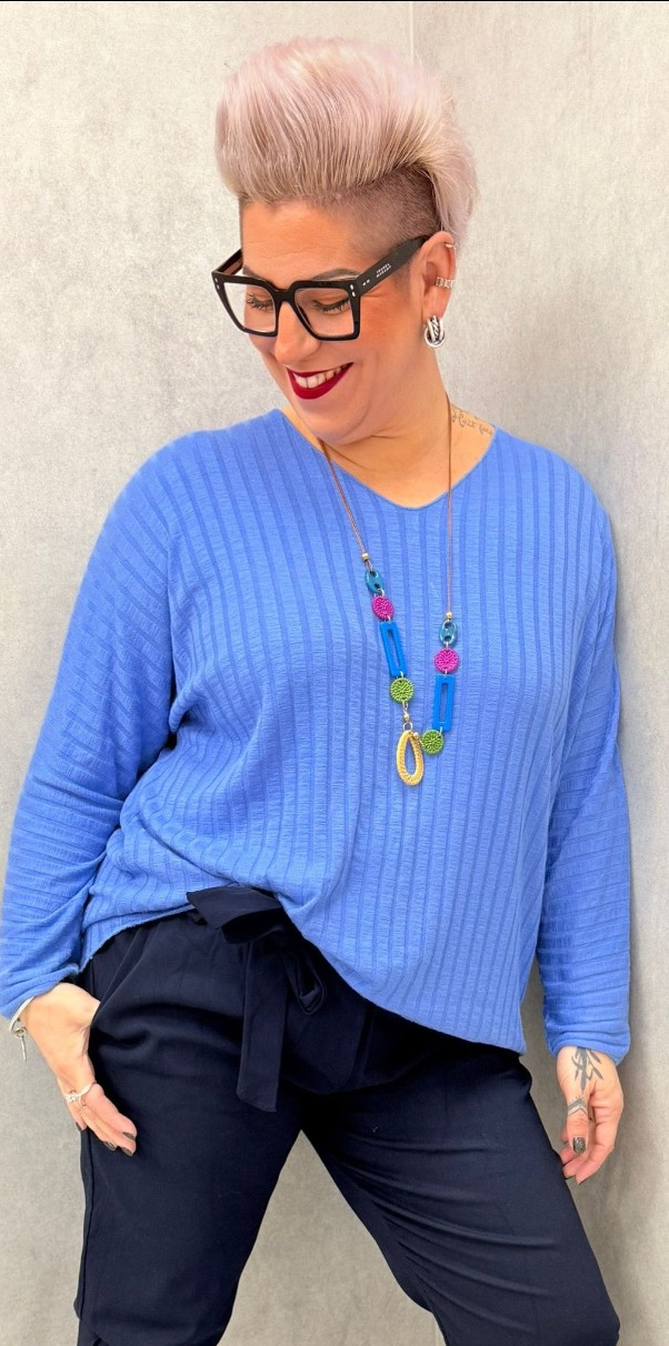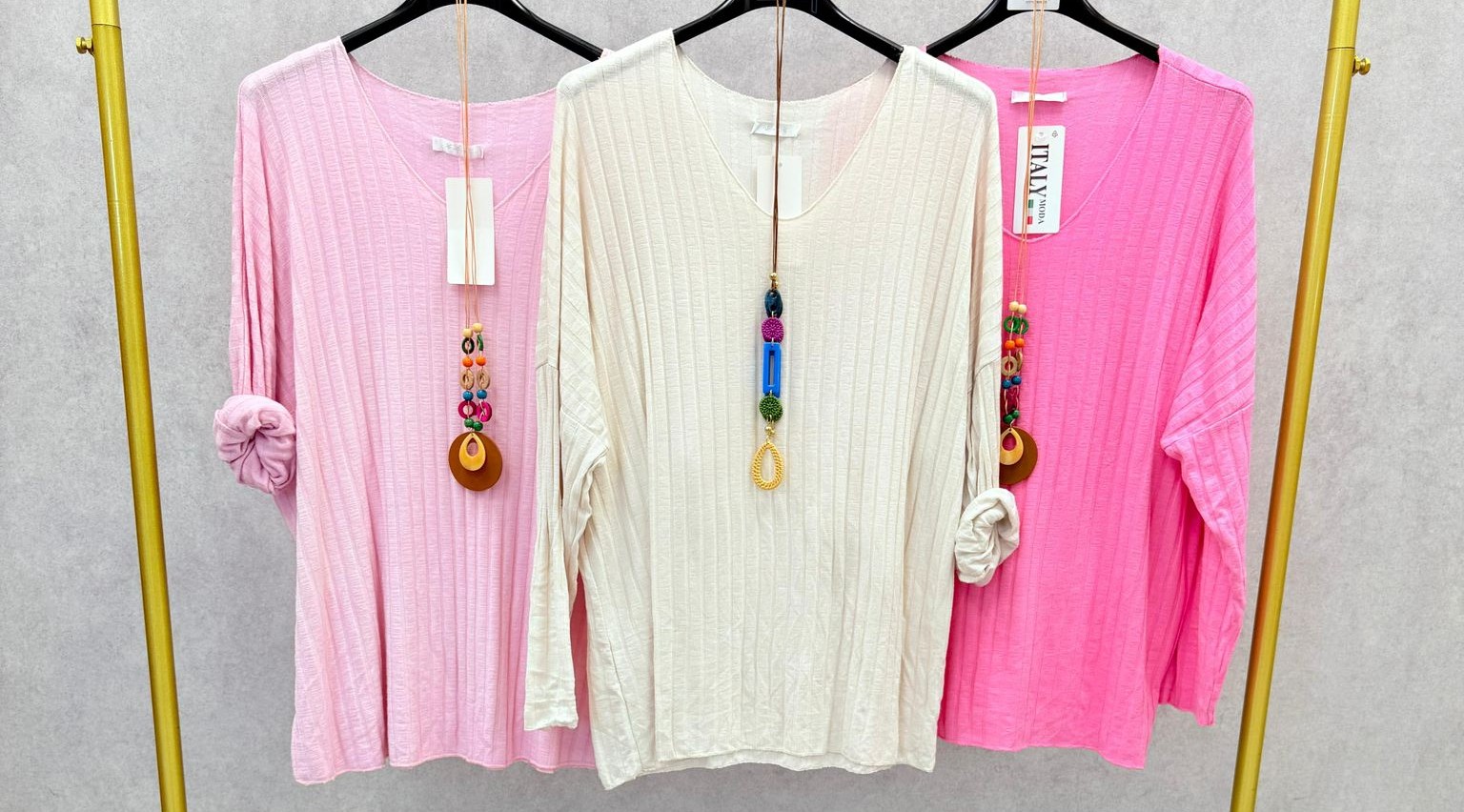 Haut uni, légèrement côtelé, très agréable à porter, encolure en V, manches longues, vendu avec un collier