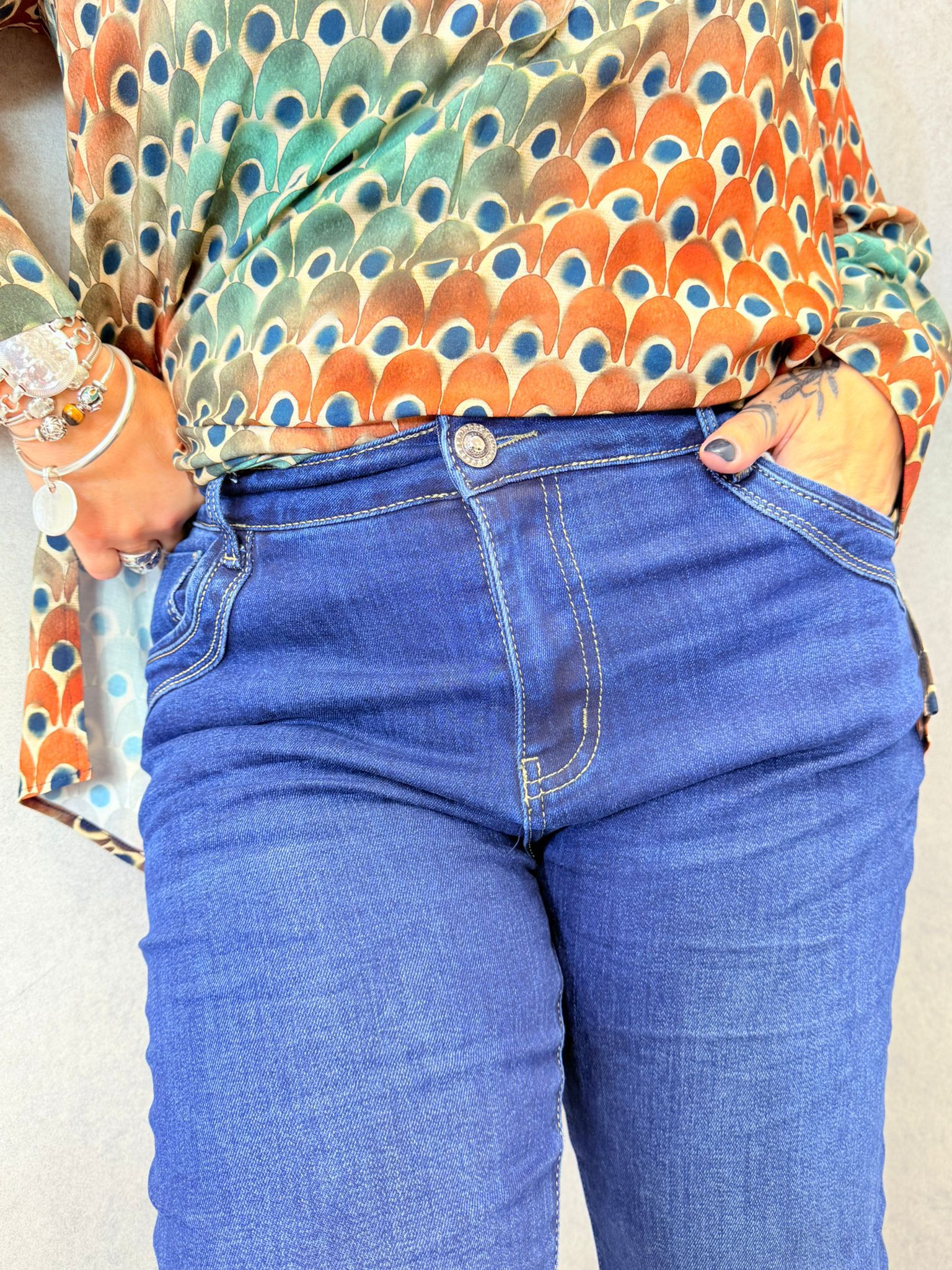 Jeans foncé, bouton fermeture éclair, très confort, prendre 1 taille en dessous de sa taille habituelle