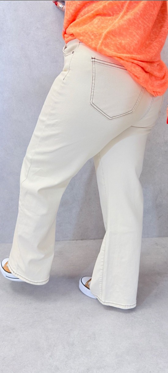 Jeans sable avec coutures apparentes chocolat, hyper confortable, coupe un large, poches, fermeture éclair et bouton