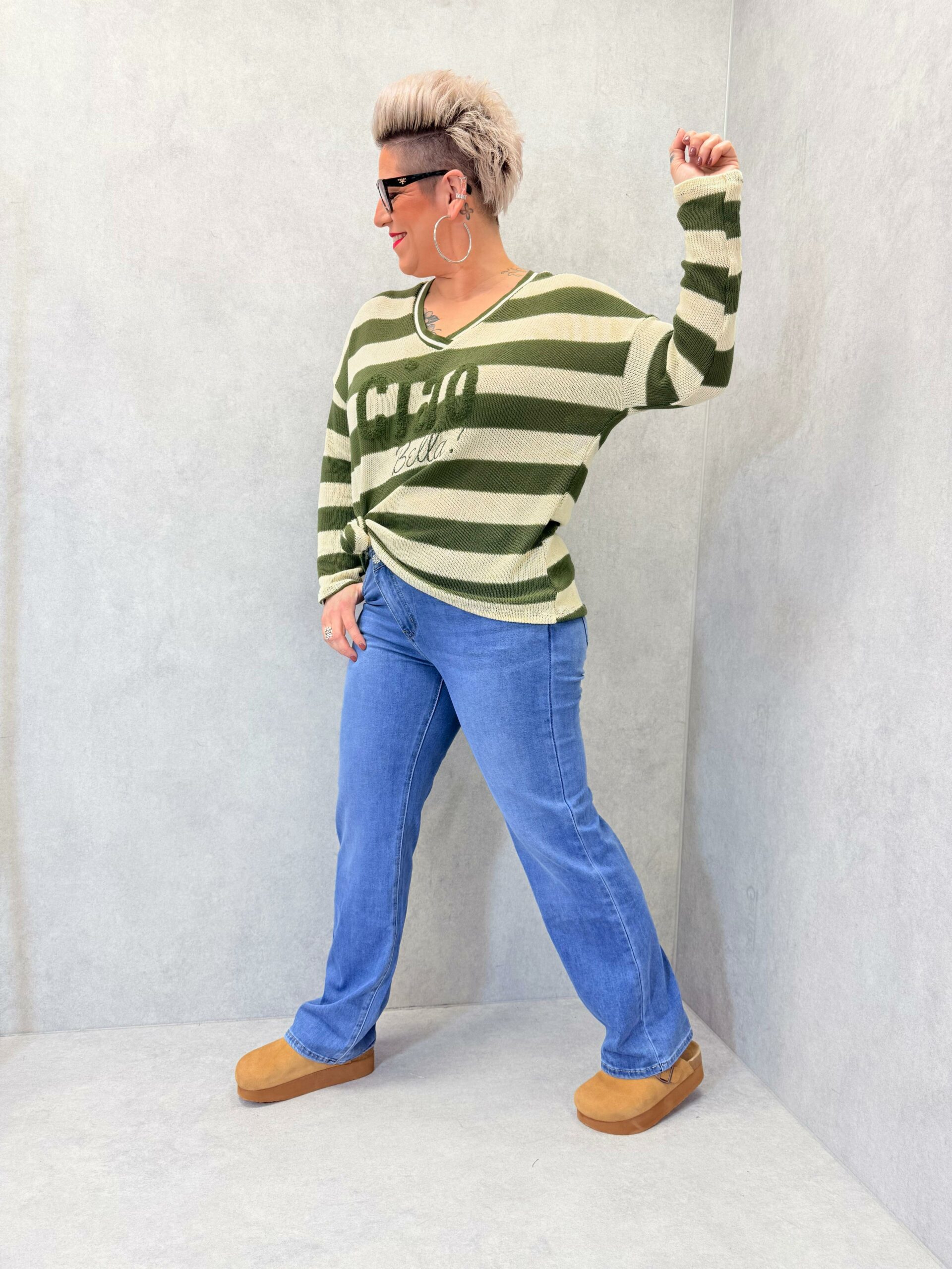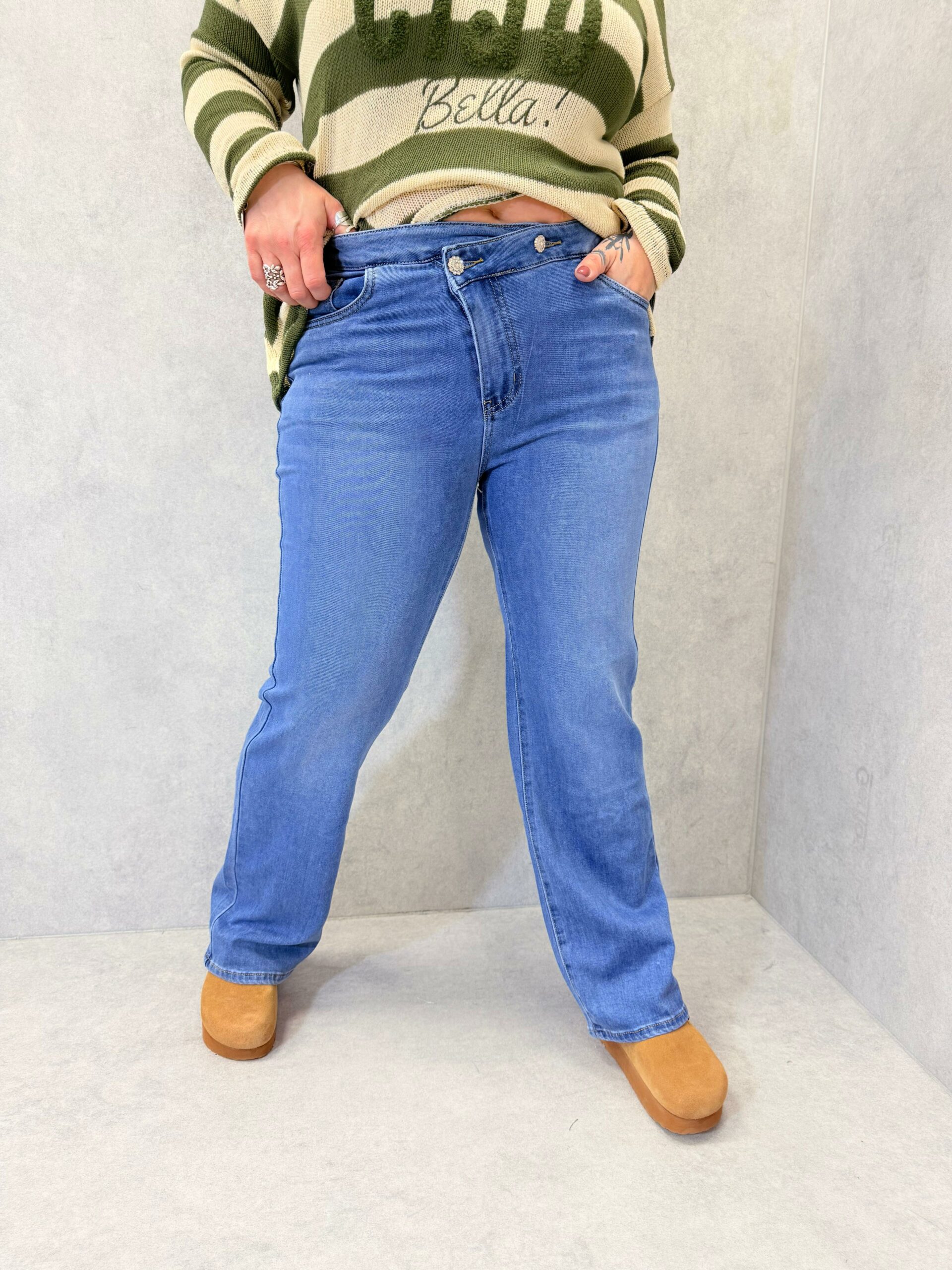 Jeans coupe wide leg, 2 boutons dont l’un est décalé, fermeture éclair, poches, très confortable