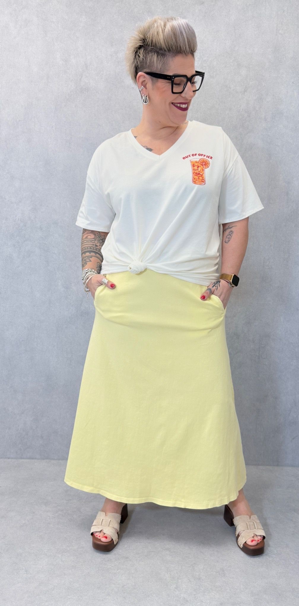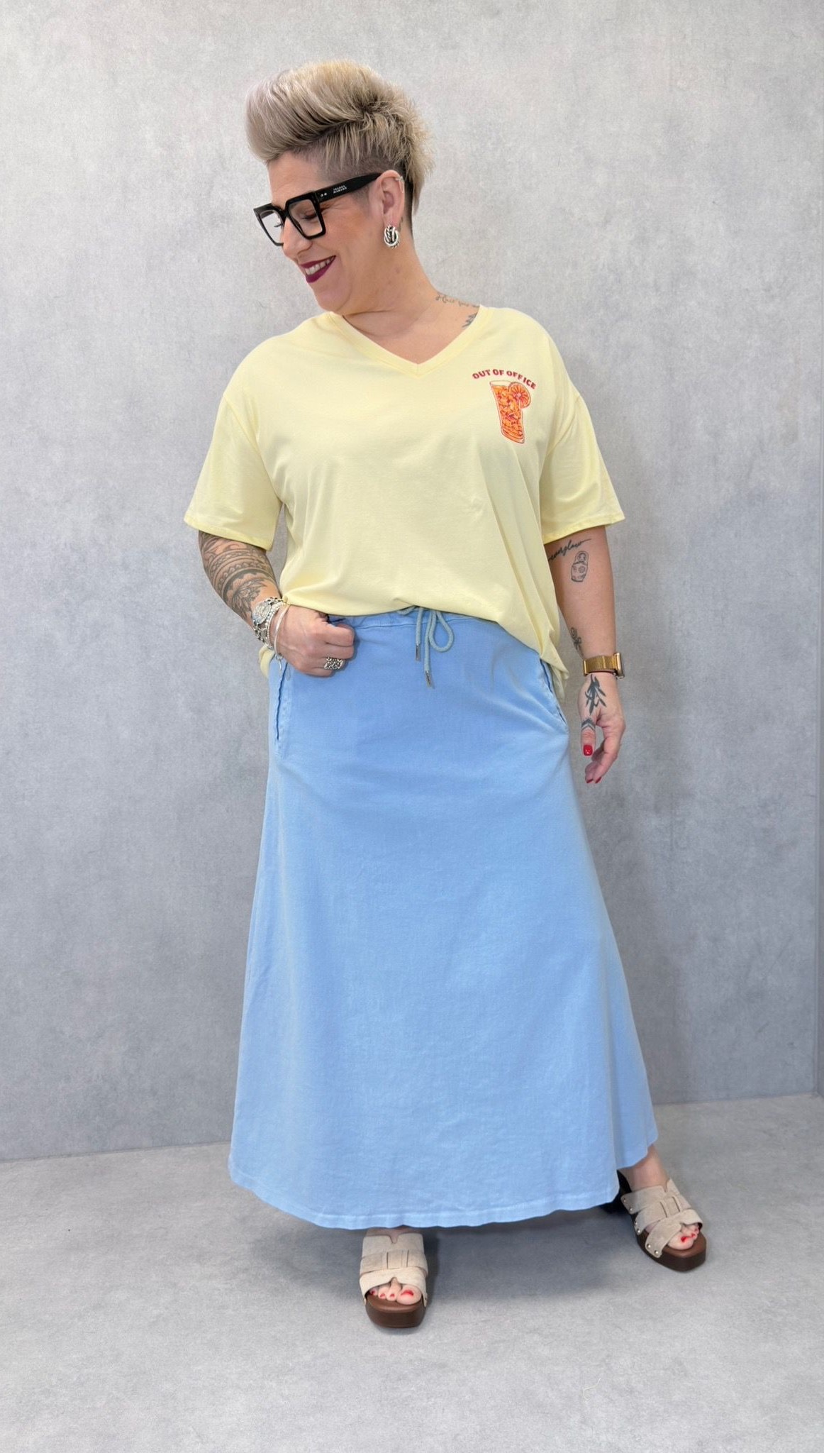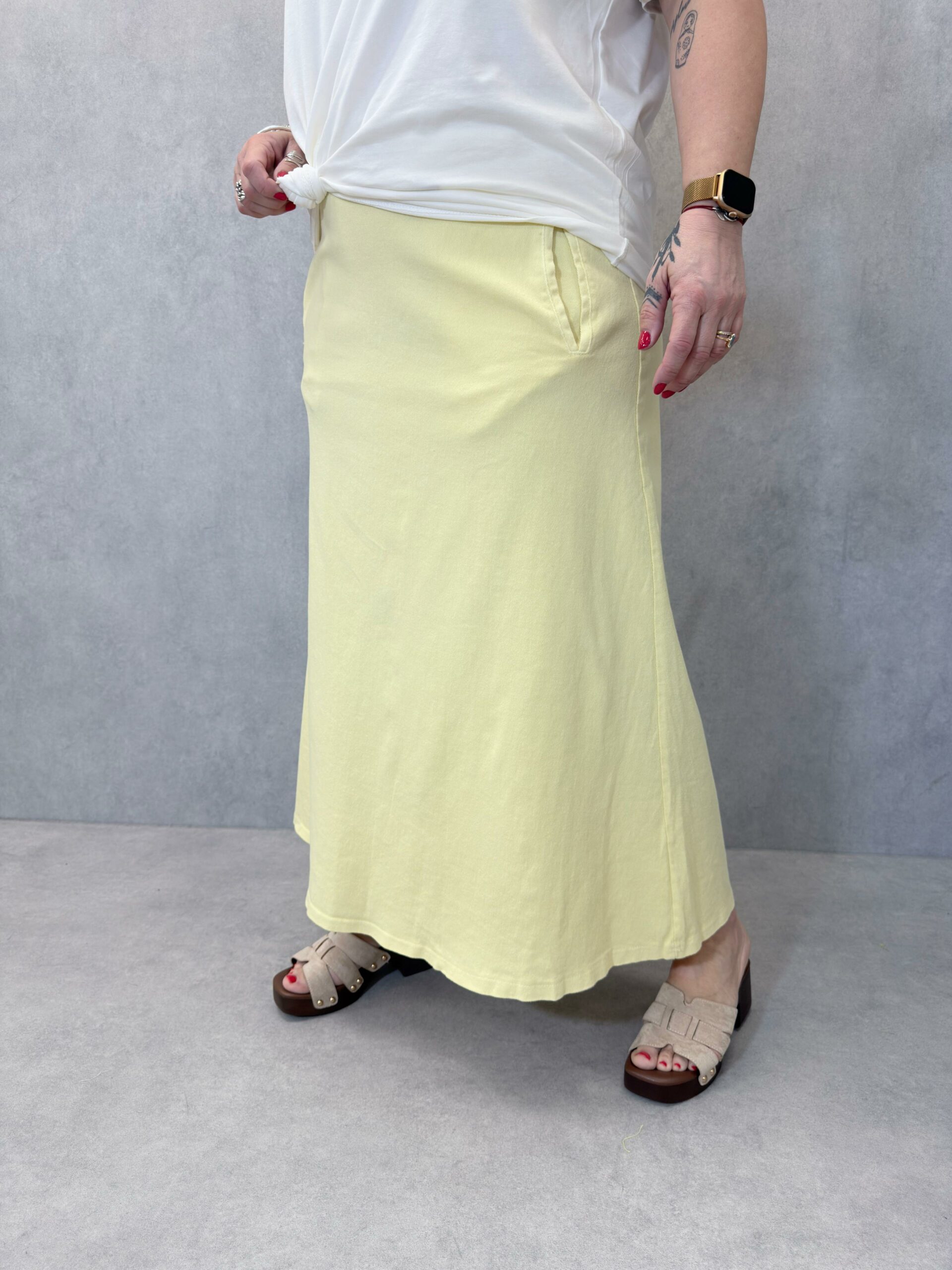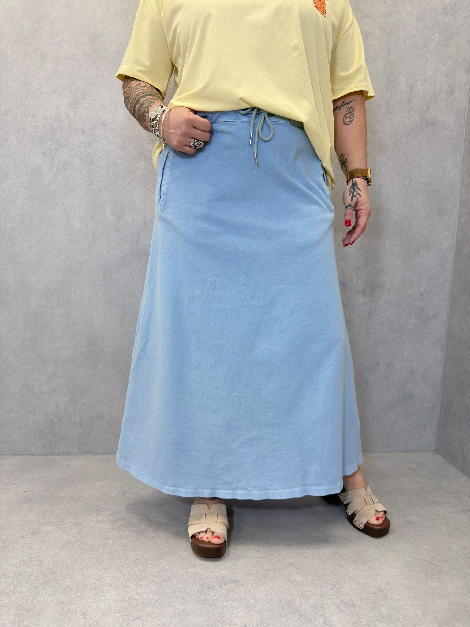 Jupe longue, légèrement évasée, taille élastique, cordon à serrer à la taille, poches