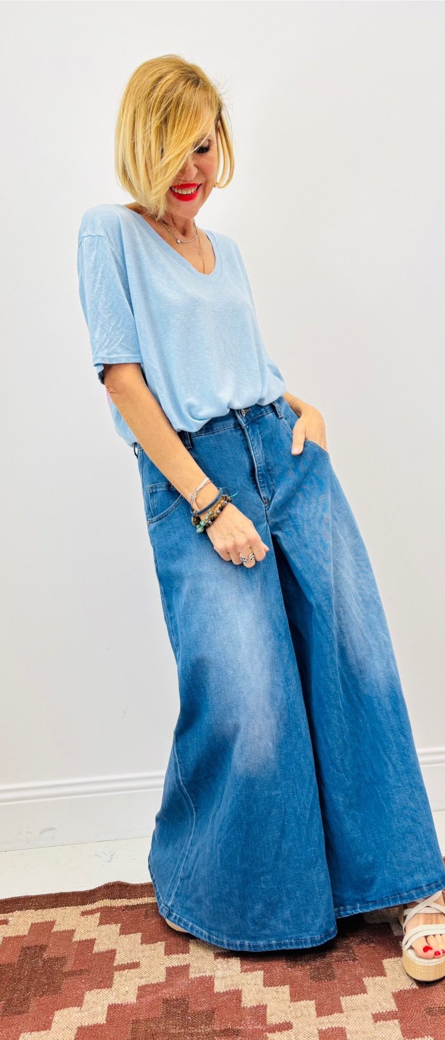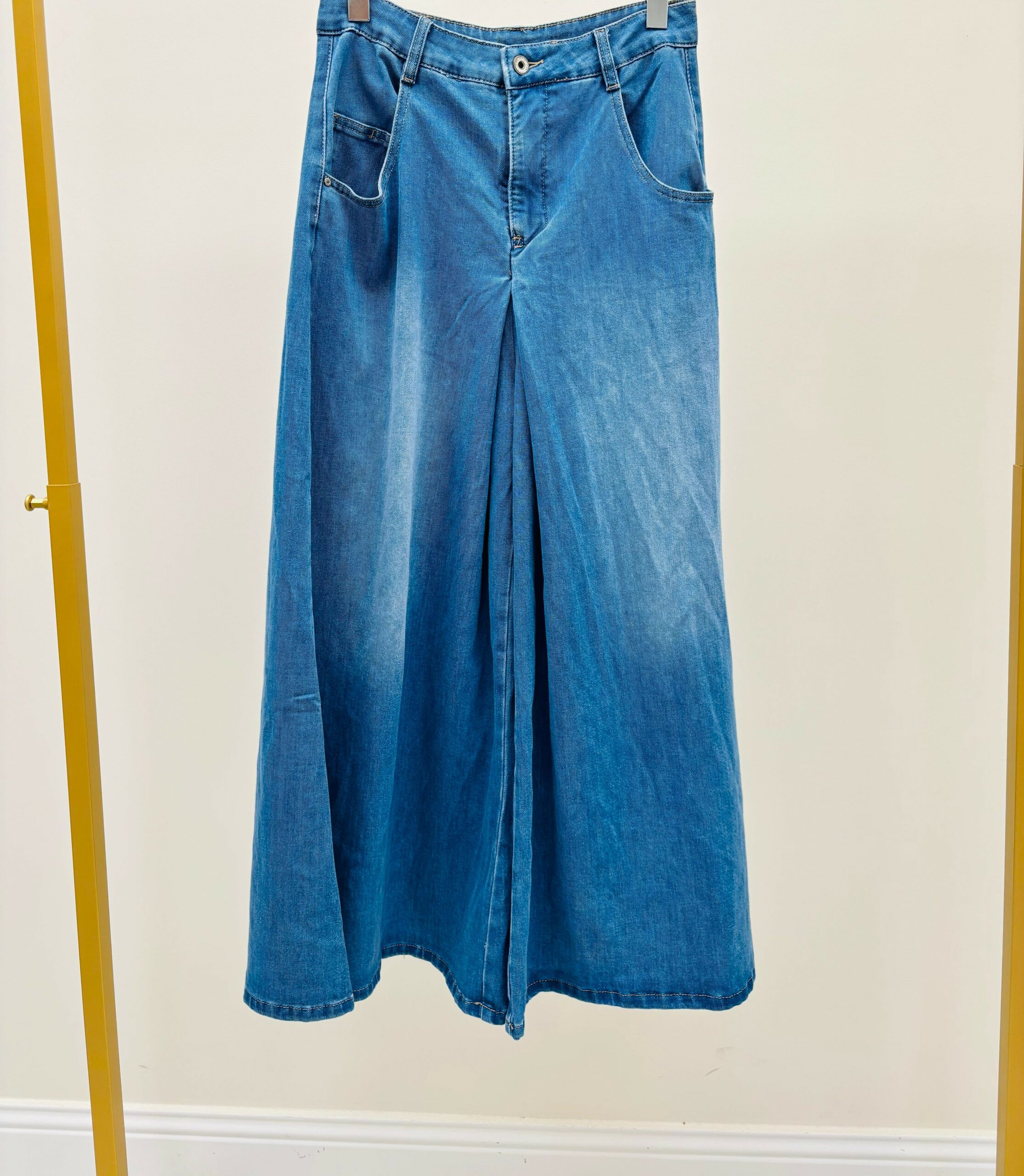 Jupe culotte en jeans, assez épais, bouton et fermeture éclair, poches