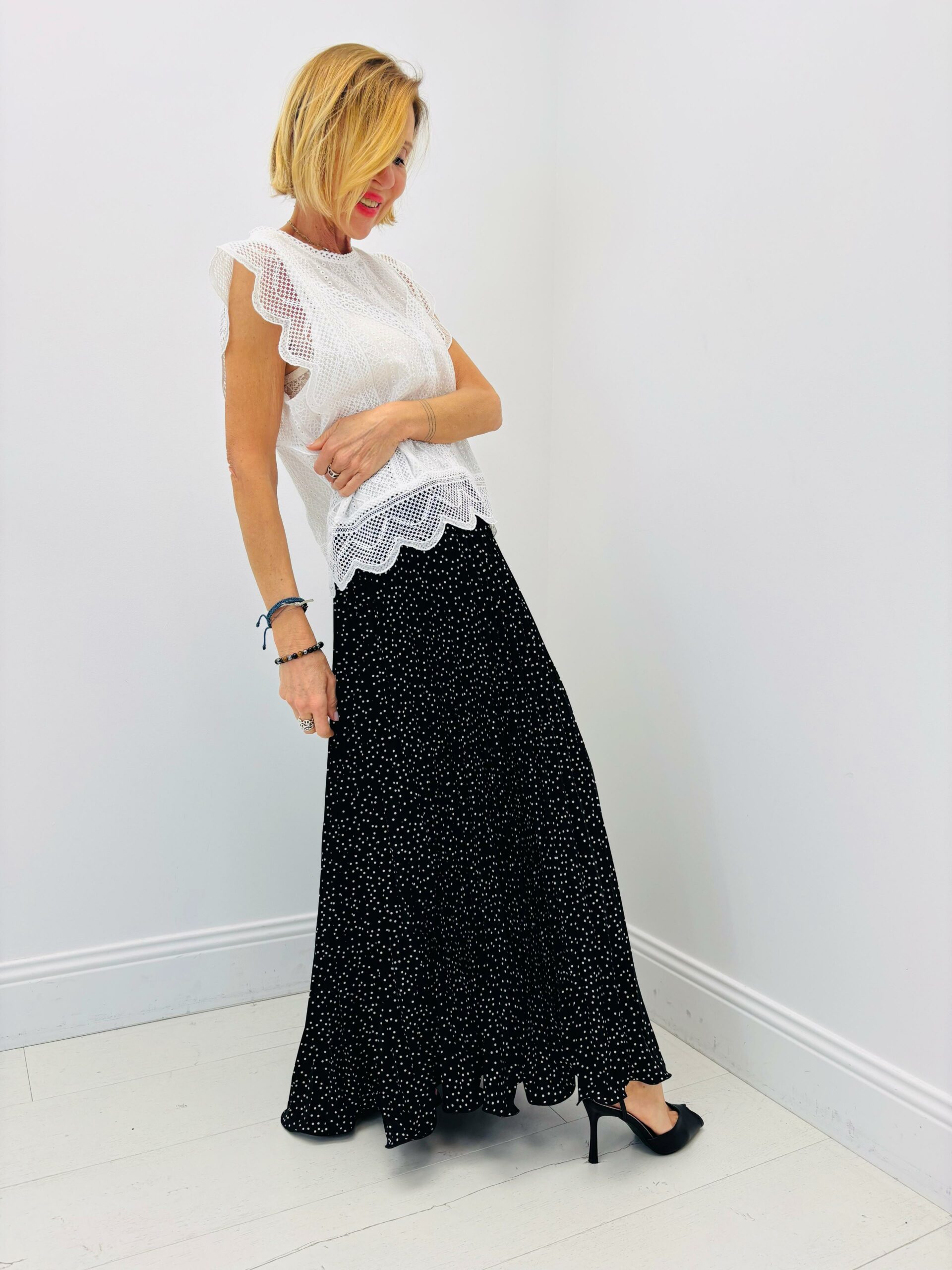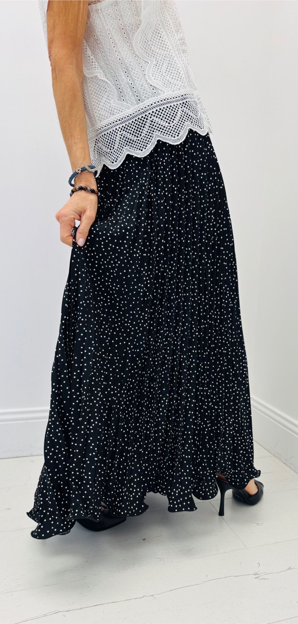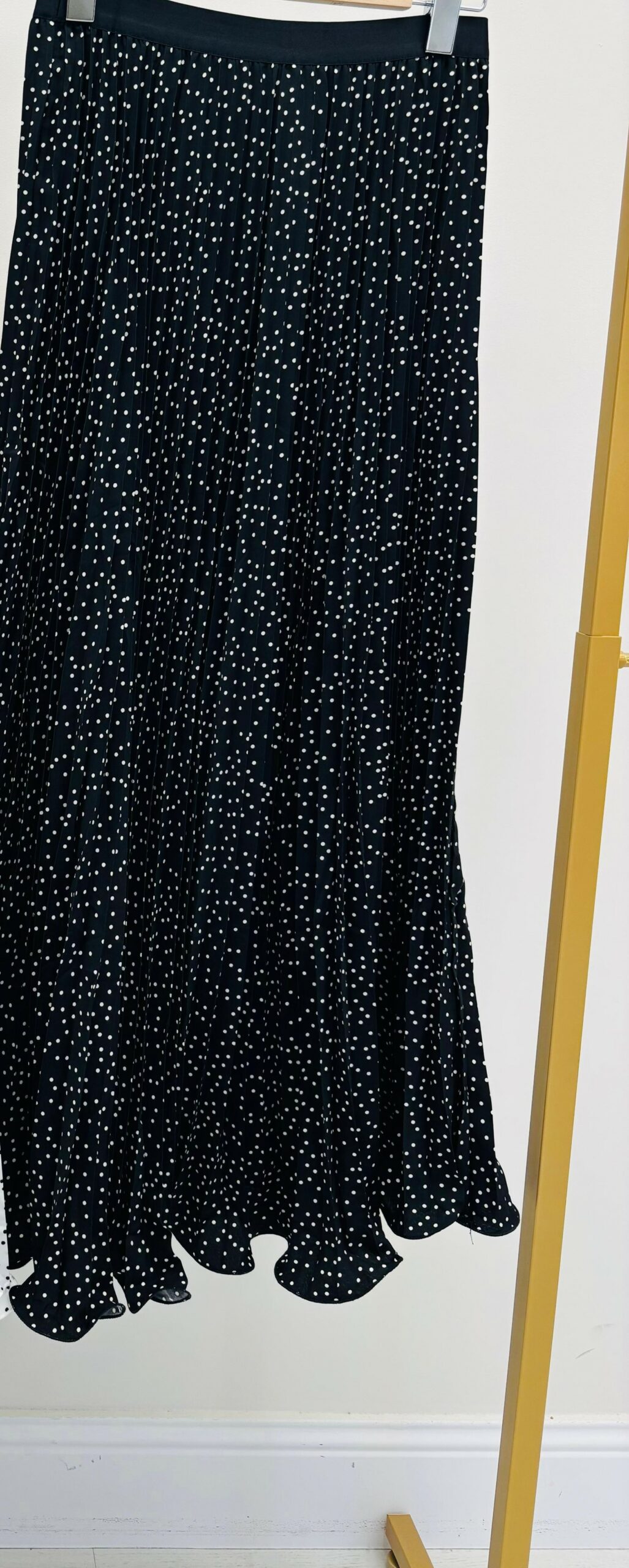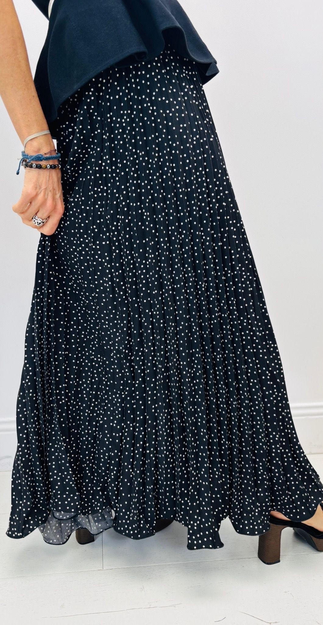 Jupe noire à petits pois, fin plissée, taille élastique, doublée