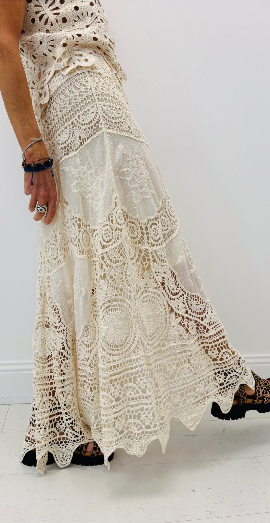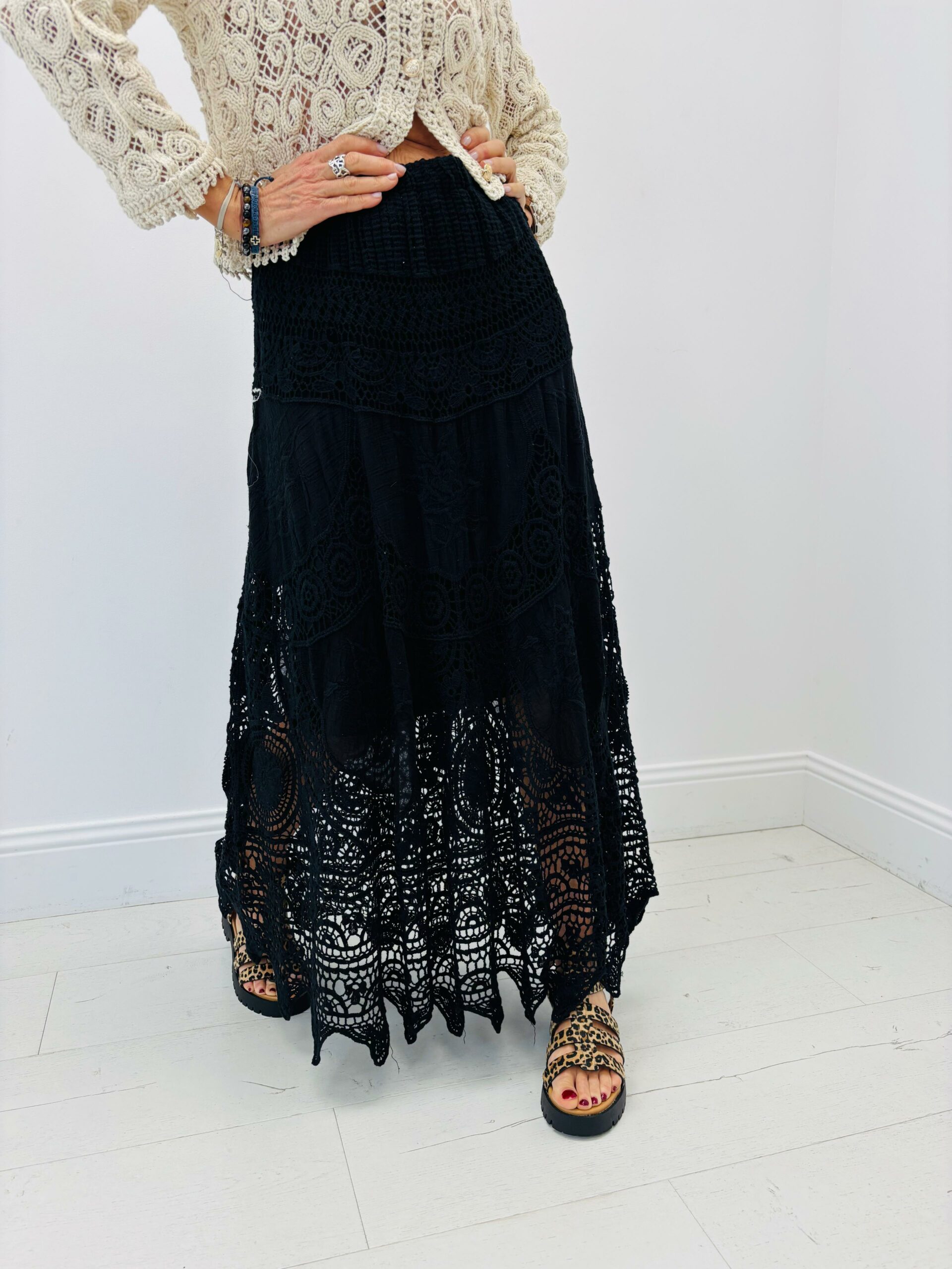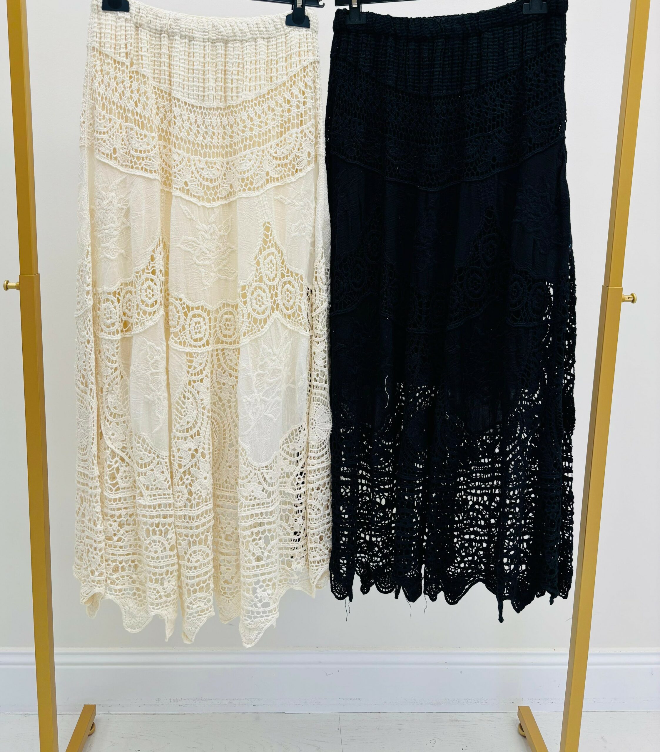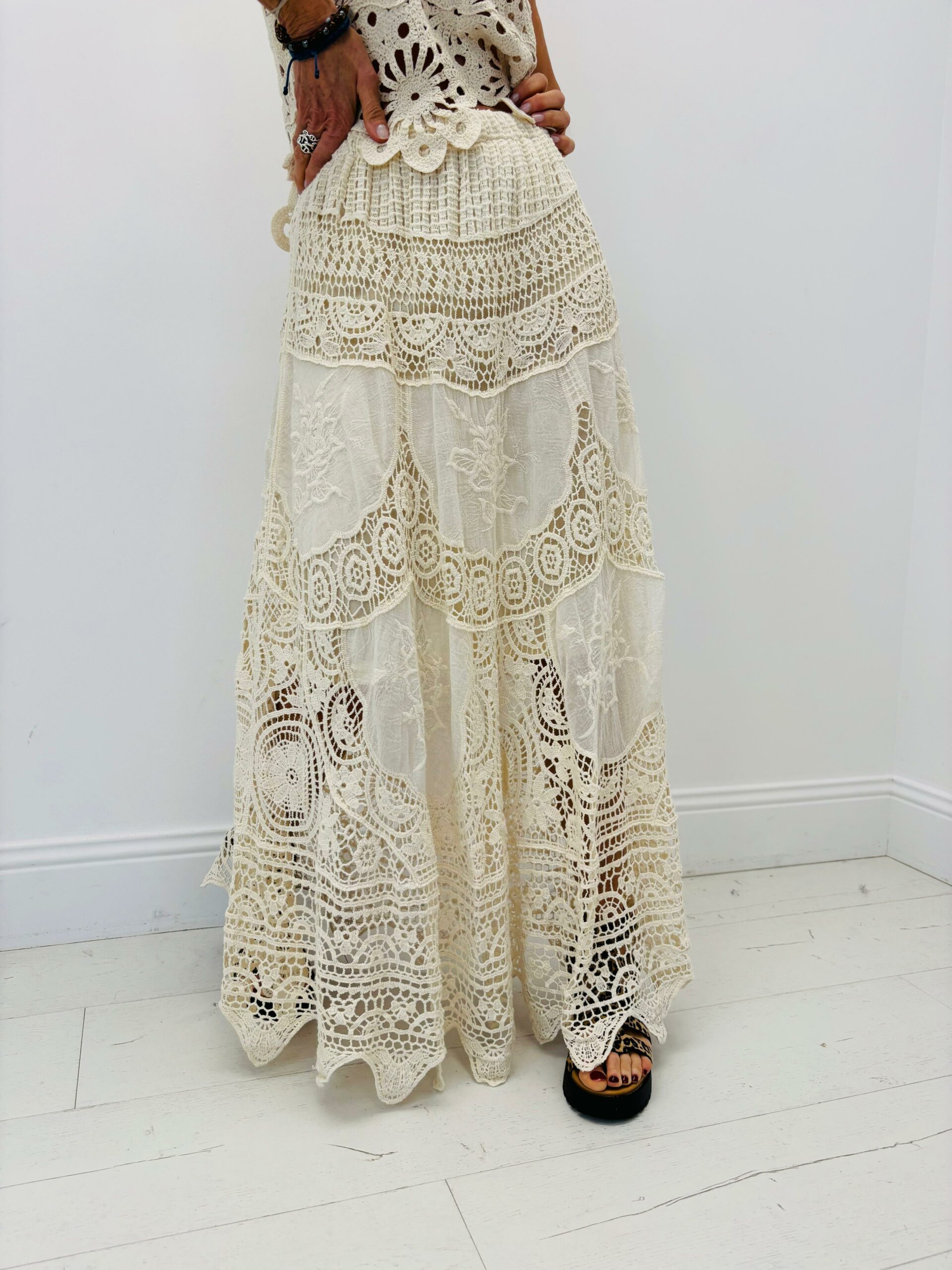 Jupe longue en broderies, doublé, taille élastique