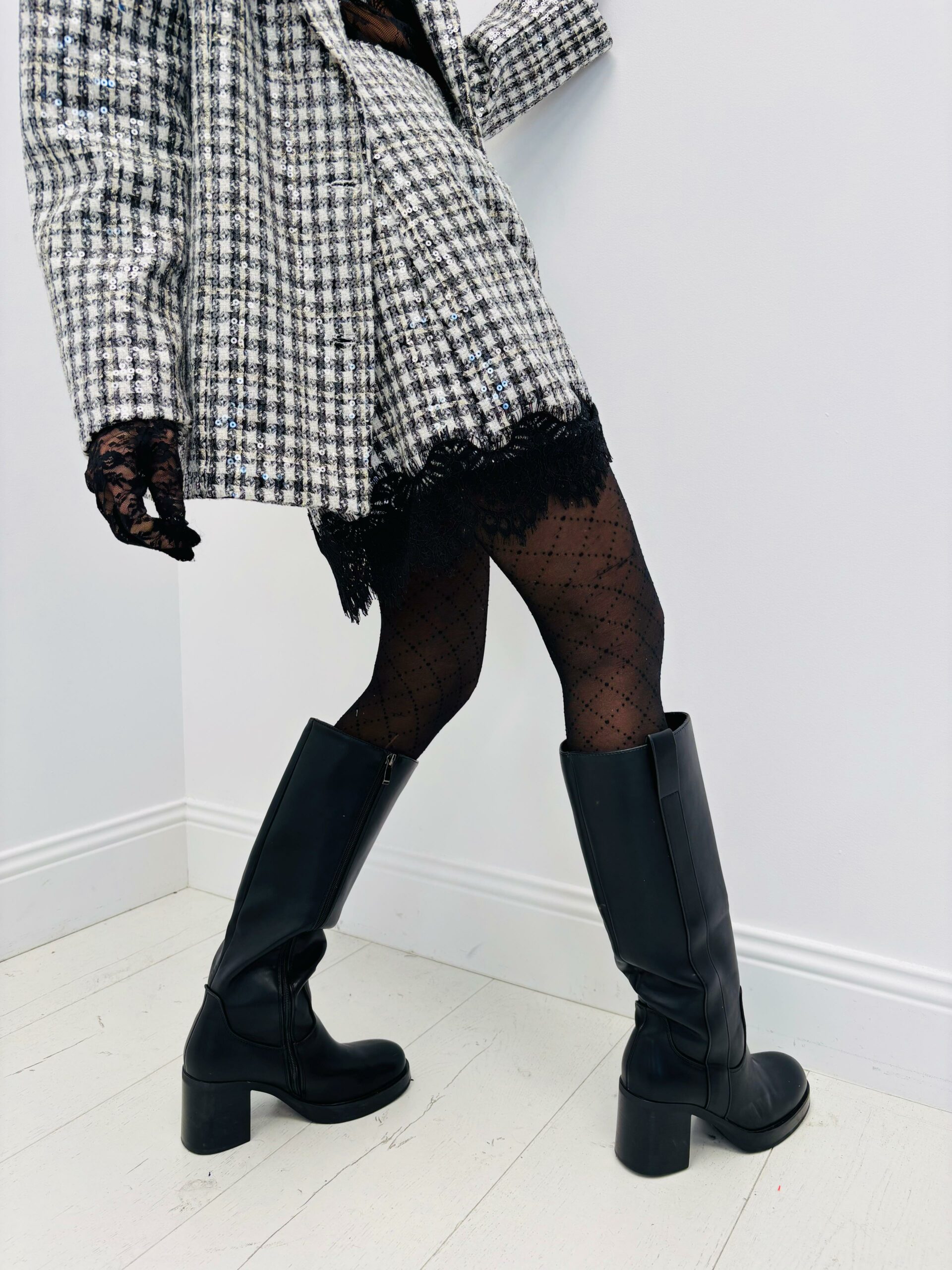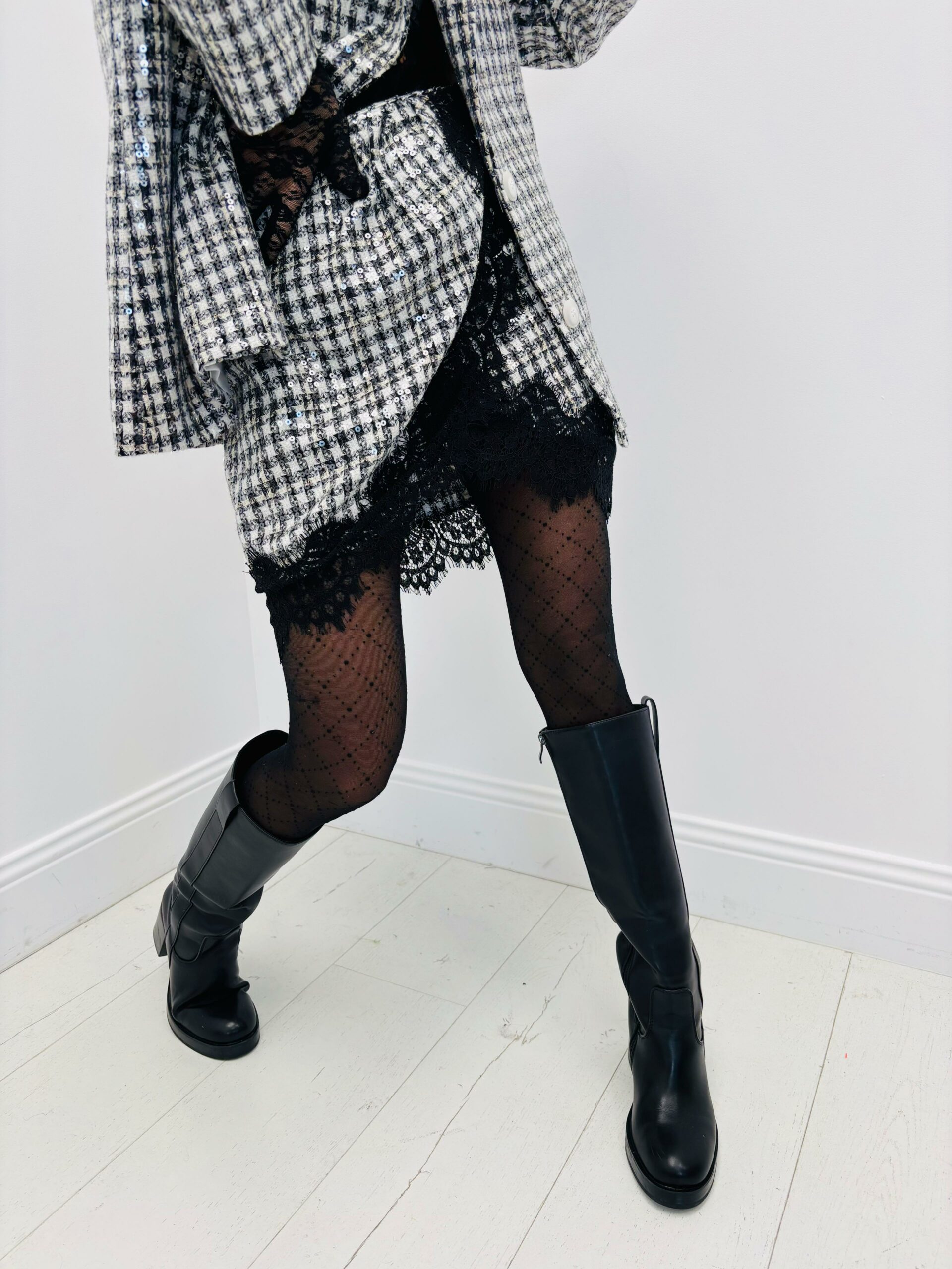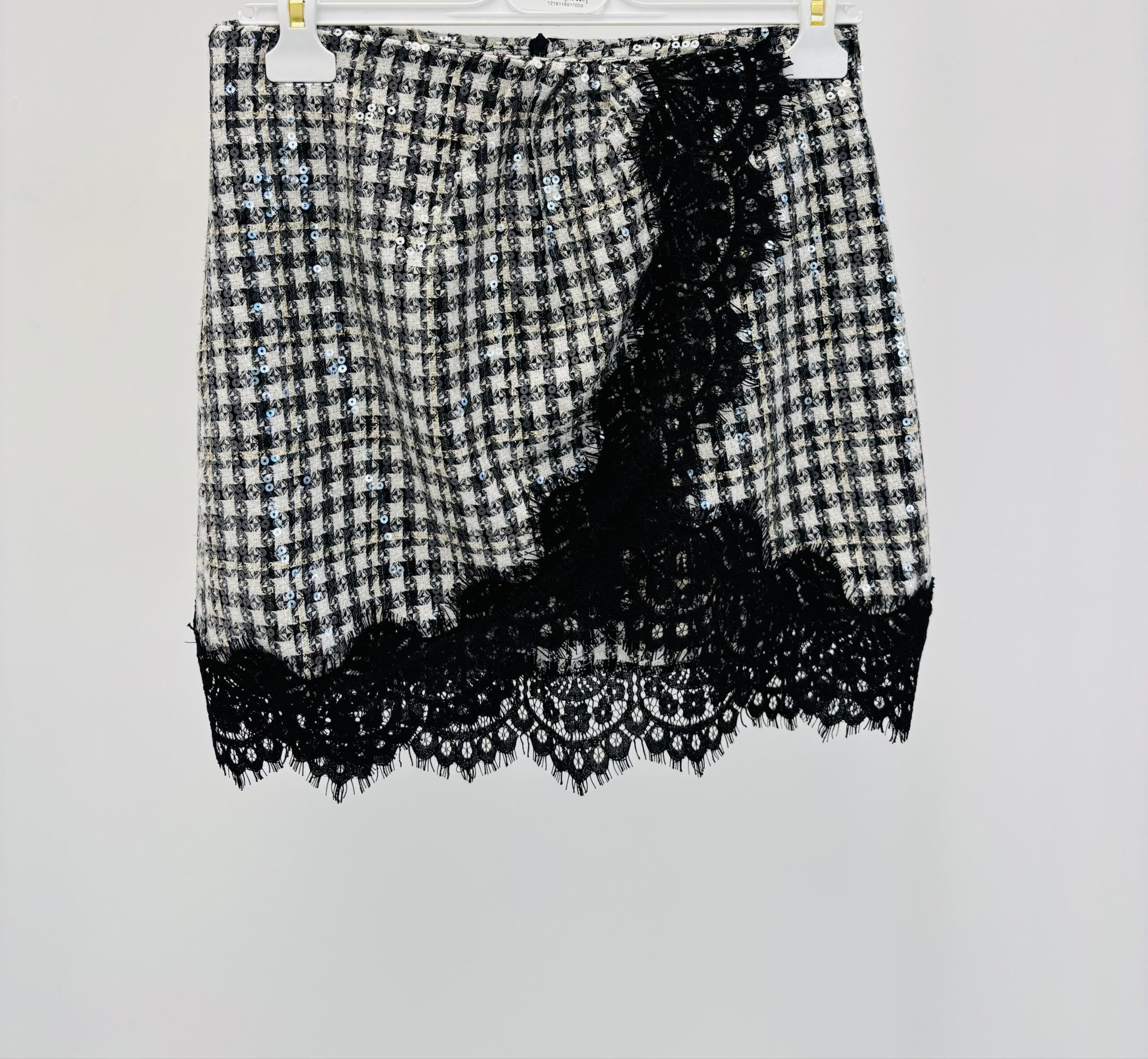 Jupe pied de coq, sequins transparents, dentelles, très joli modèle