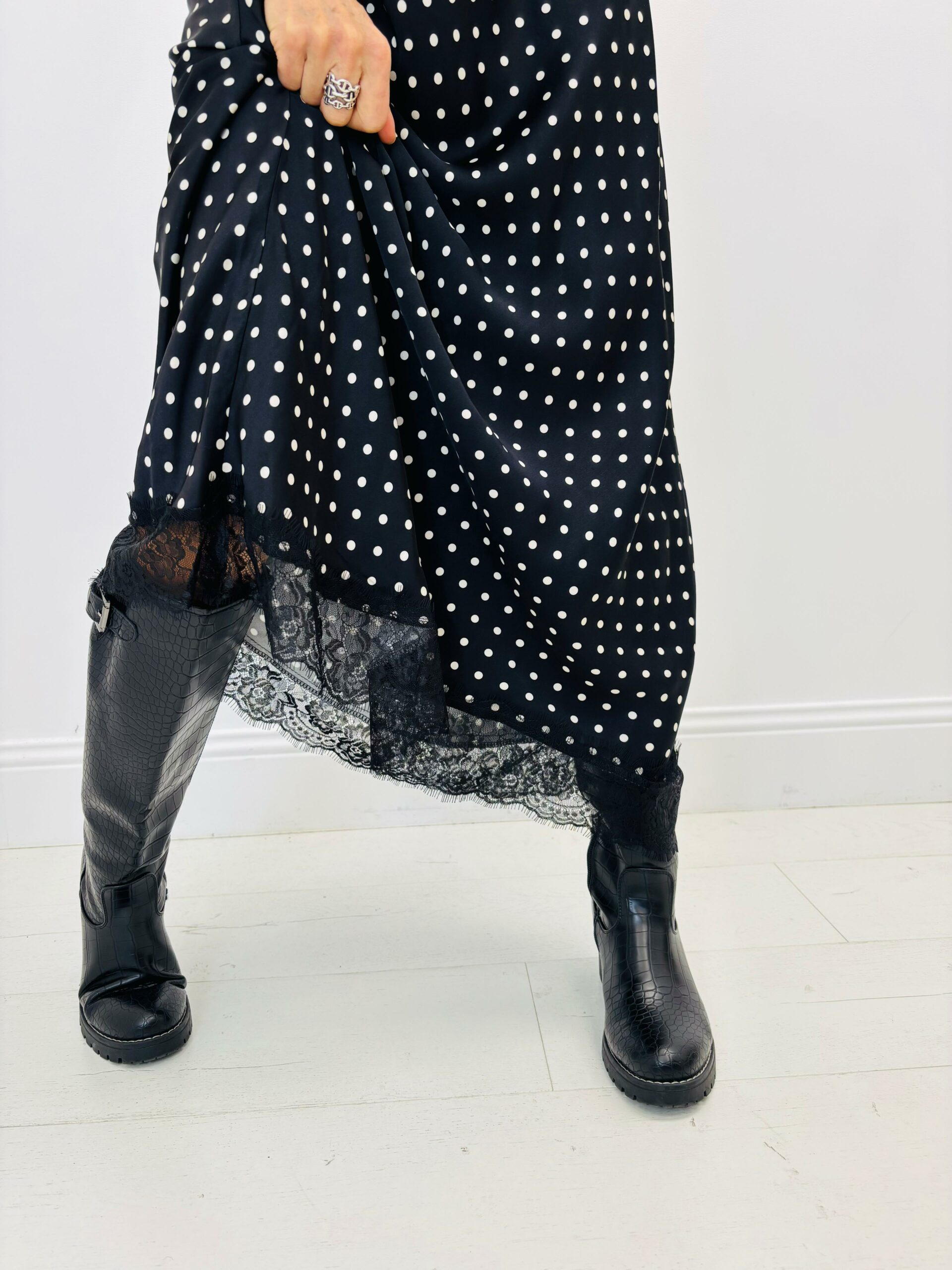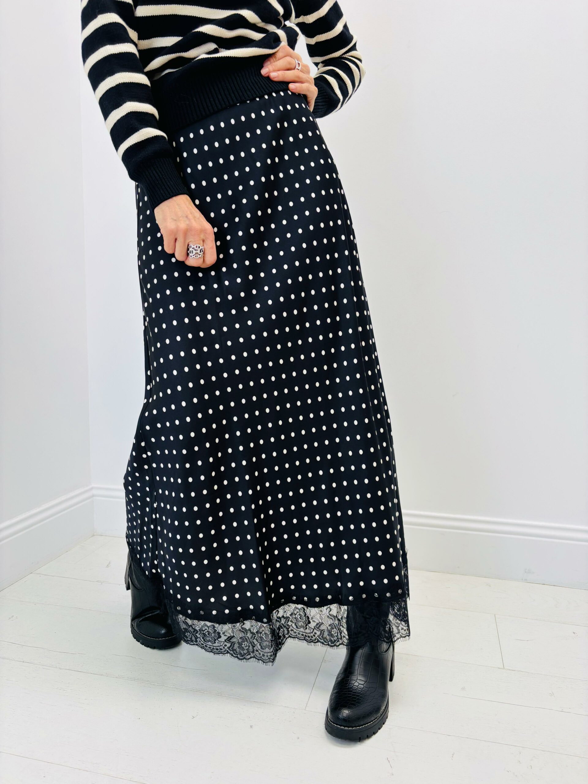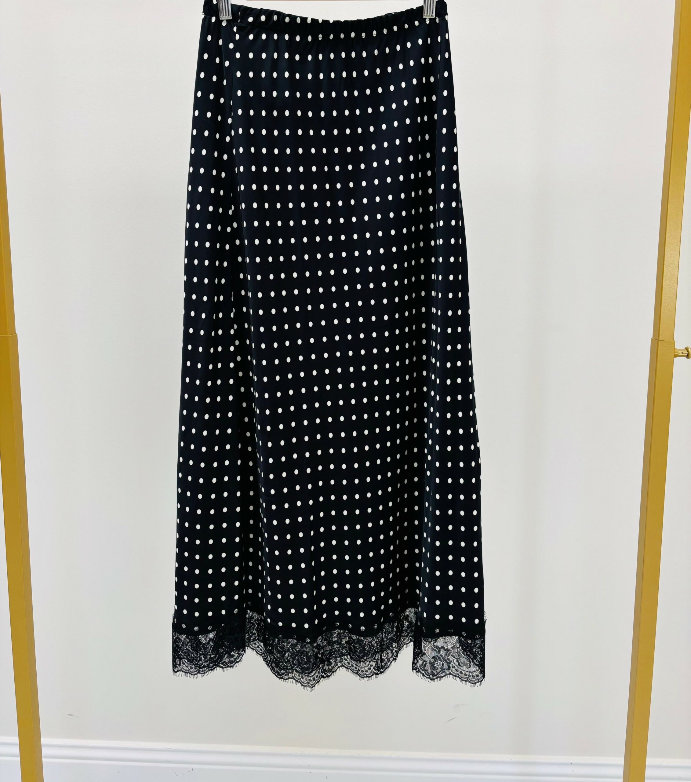 Jupe noire avec des pois blancs, taille élastique, le bas dentelle