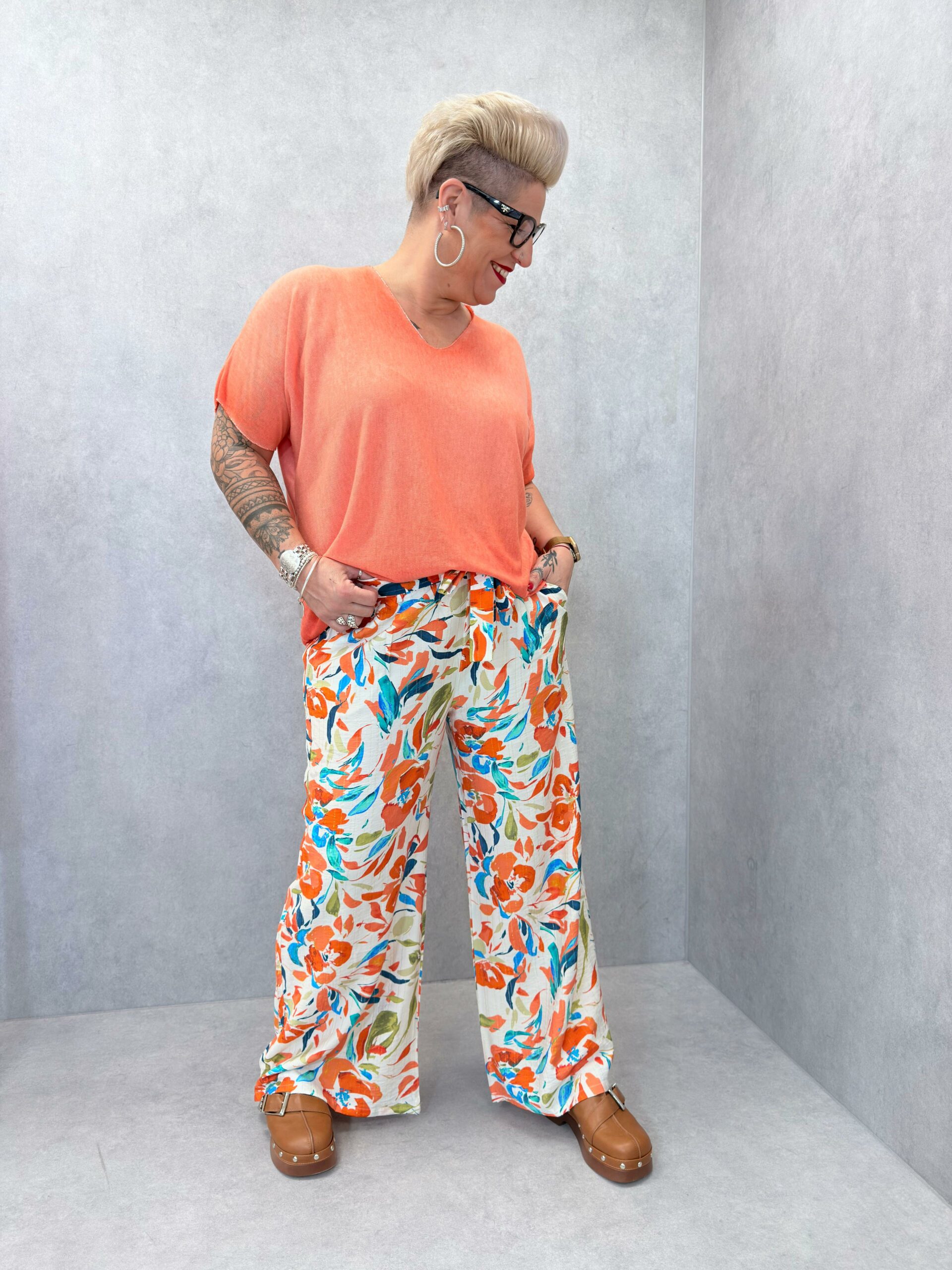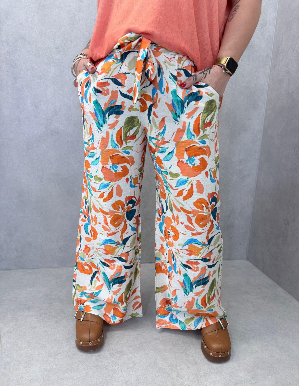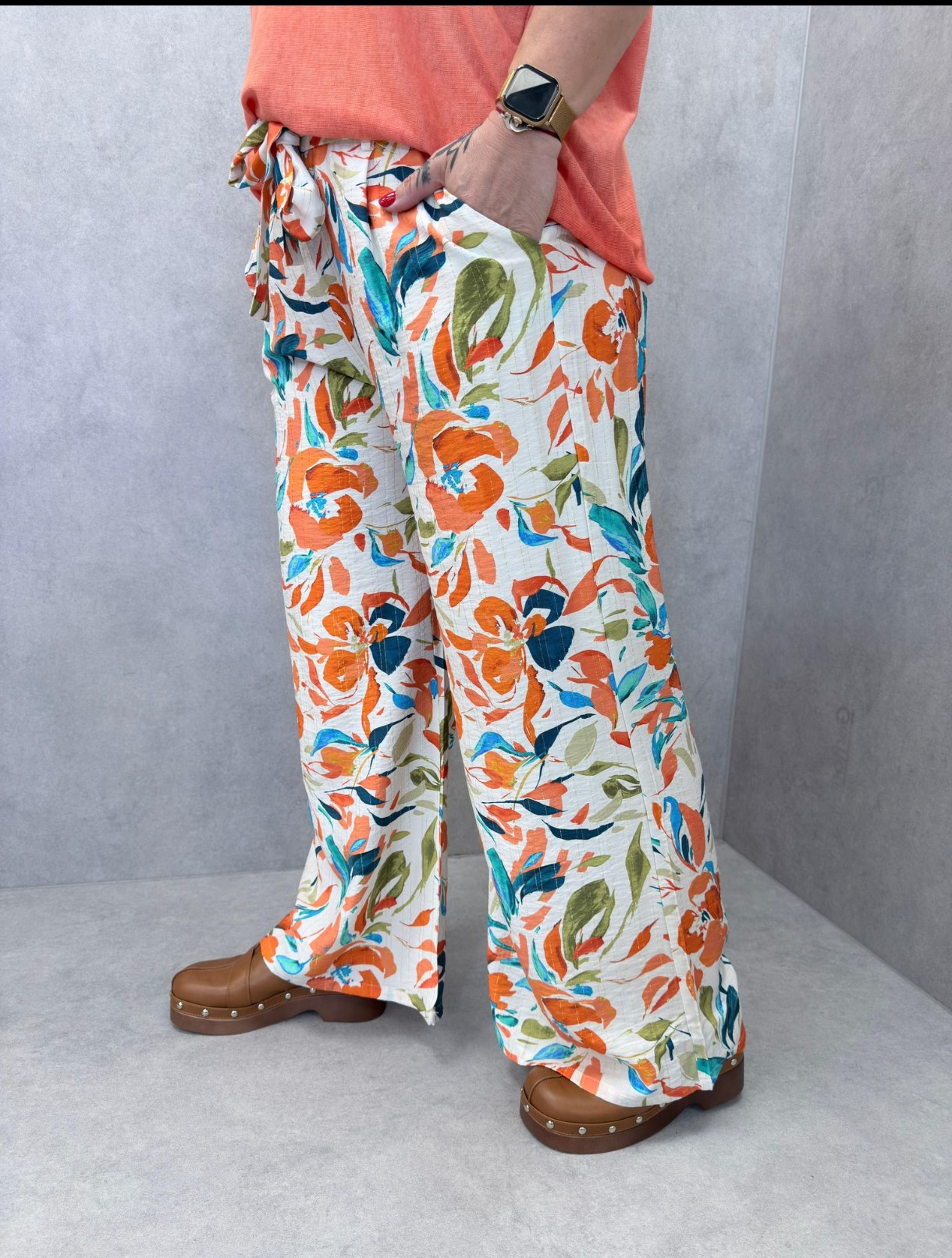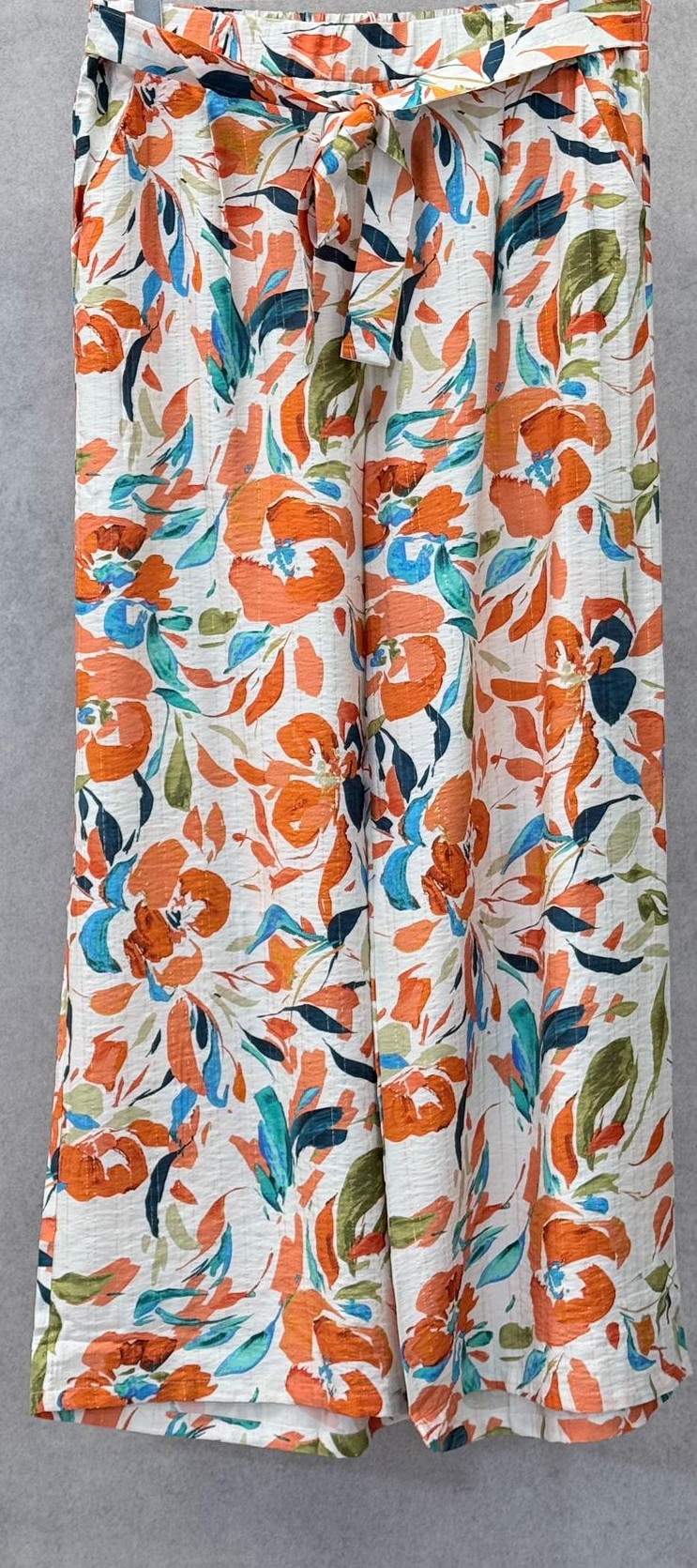 Pantalon à grosses fleurs, tons oranges et bleus avec 1 fil doré, taille élastique, cordon à serrer à la taille, poches