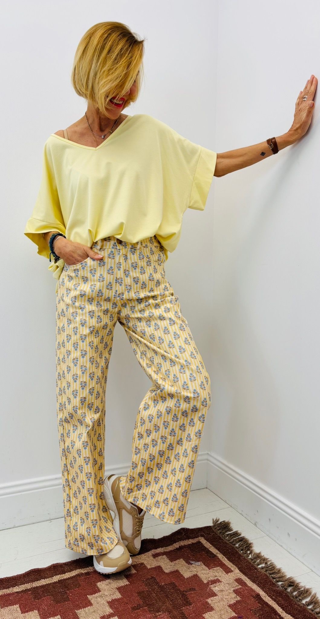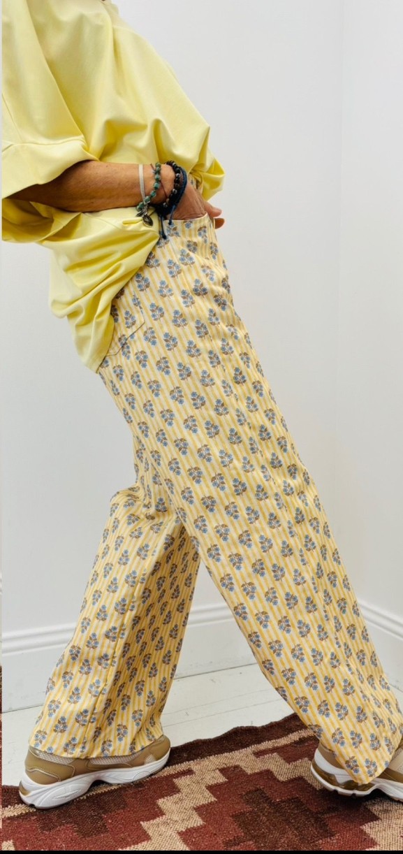 Pantalon jaune avec des rayures et des fleurs, bouton fermeture éclair, au dos élastique, poches