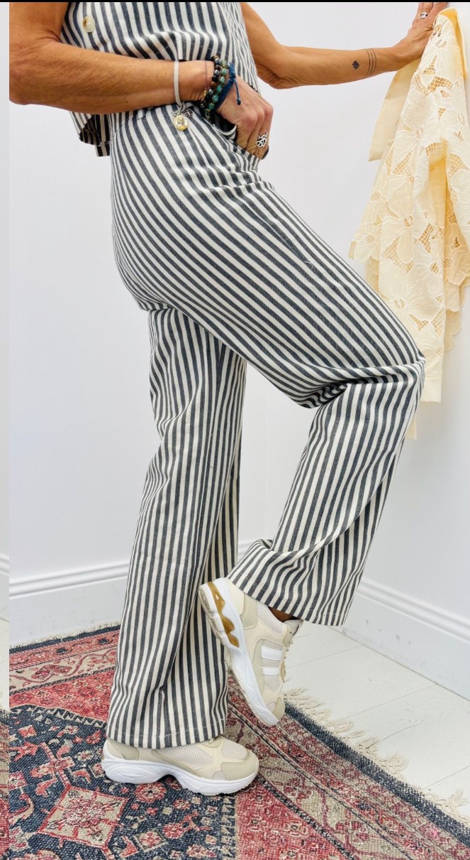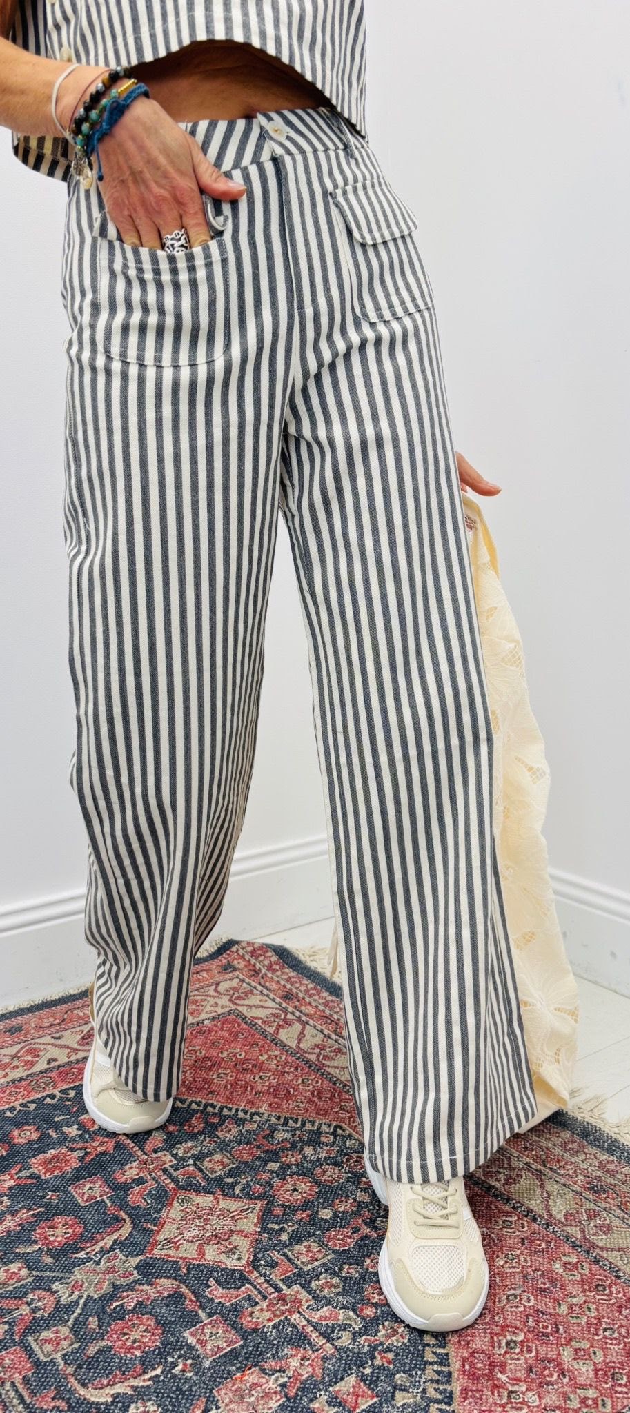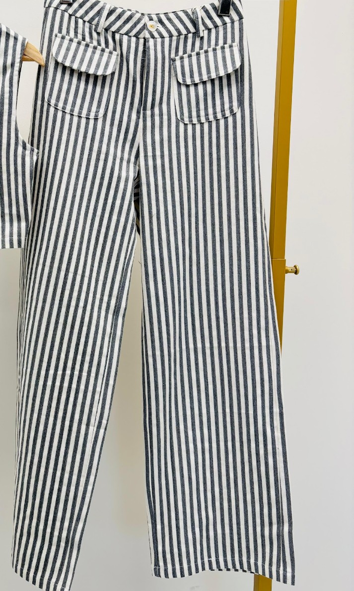 Pantalon rayé, coupe droite, bouton et fermeture éclair, poches