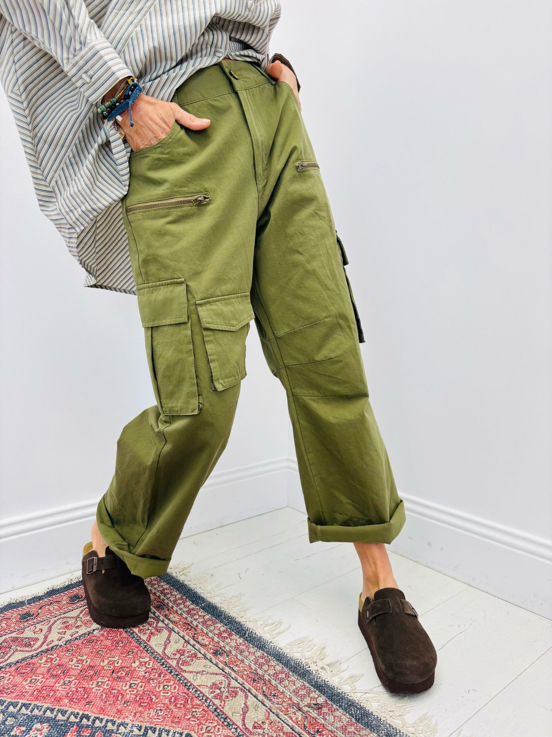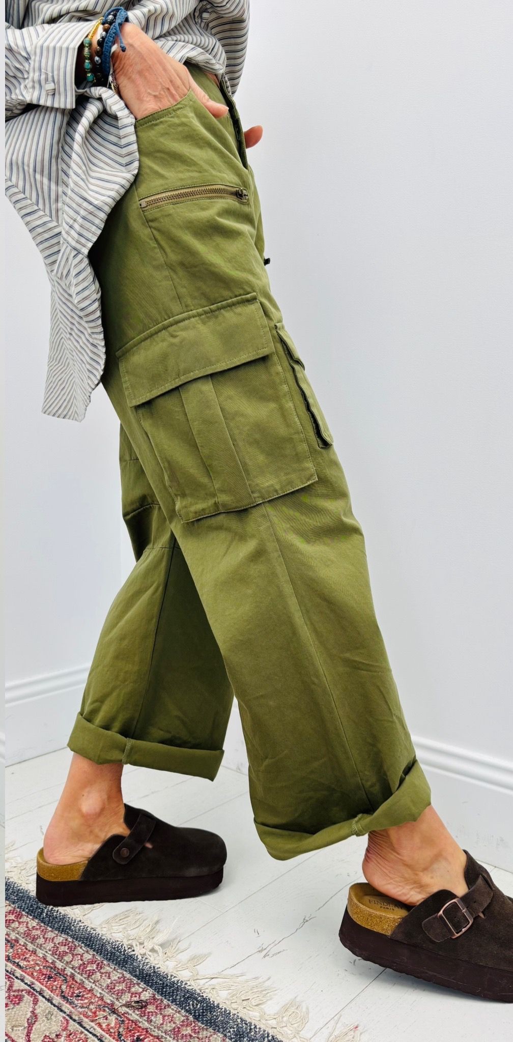 Pantalon kaki forme cargo (poches sur les côtés), bouton et fermeture éclair