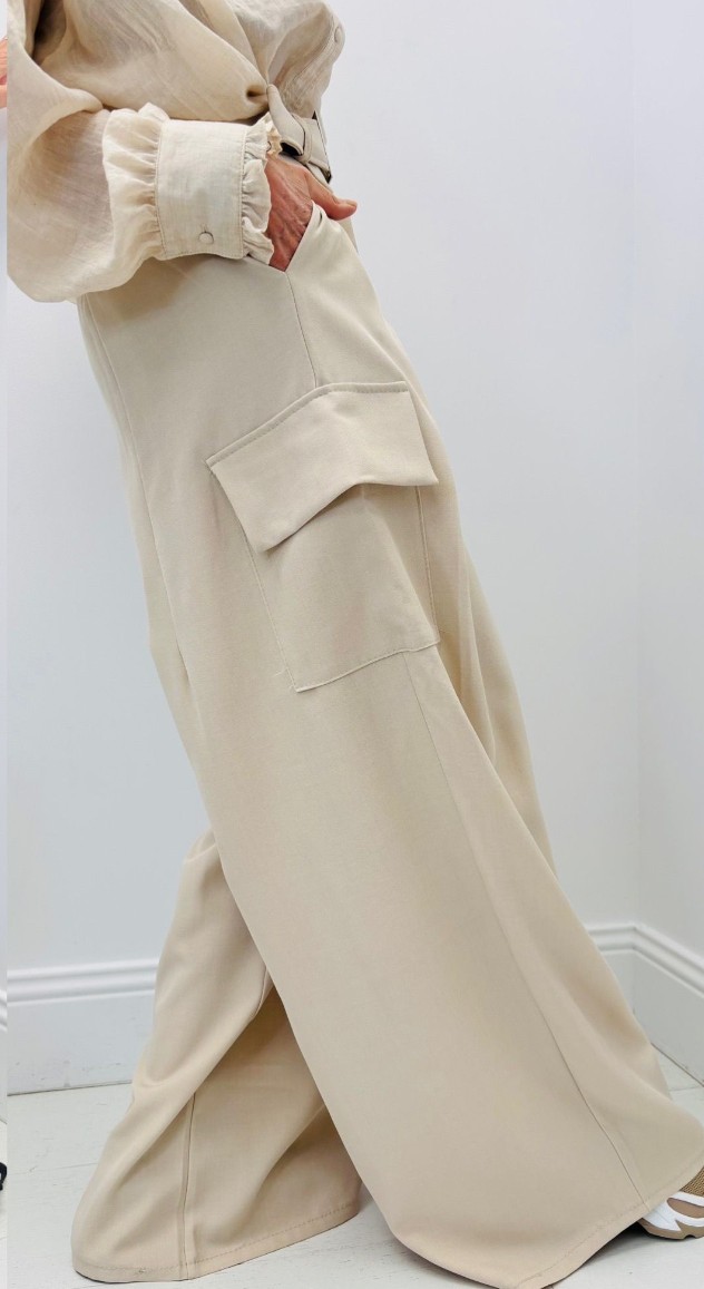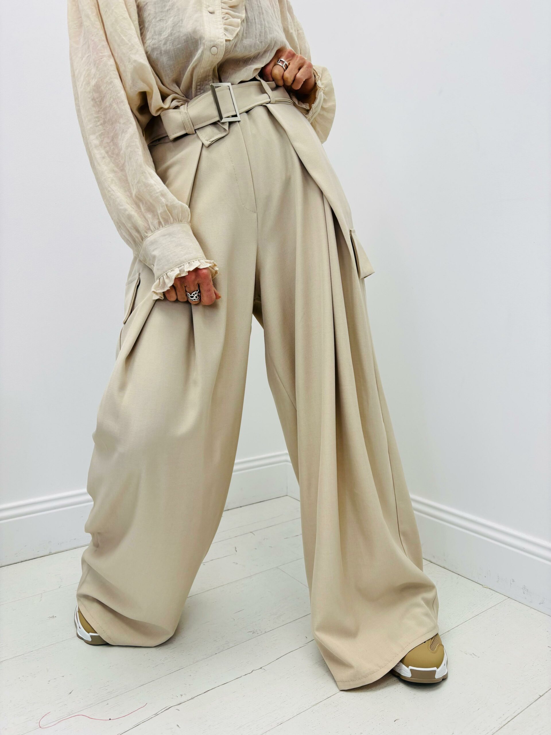 Pantalon coupe large, taille élastique, vendu avec sa ceinture, coupe cargo, avec les poches sur les côtés, poches