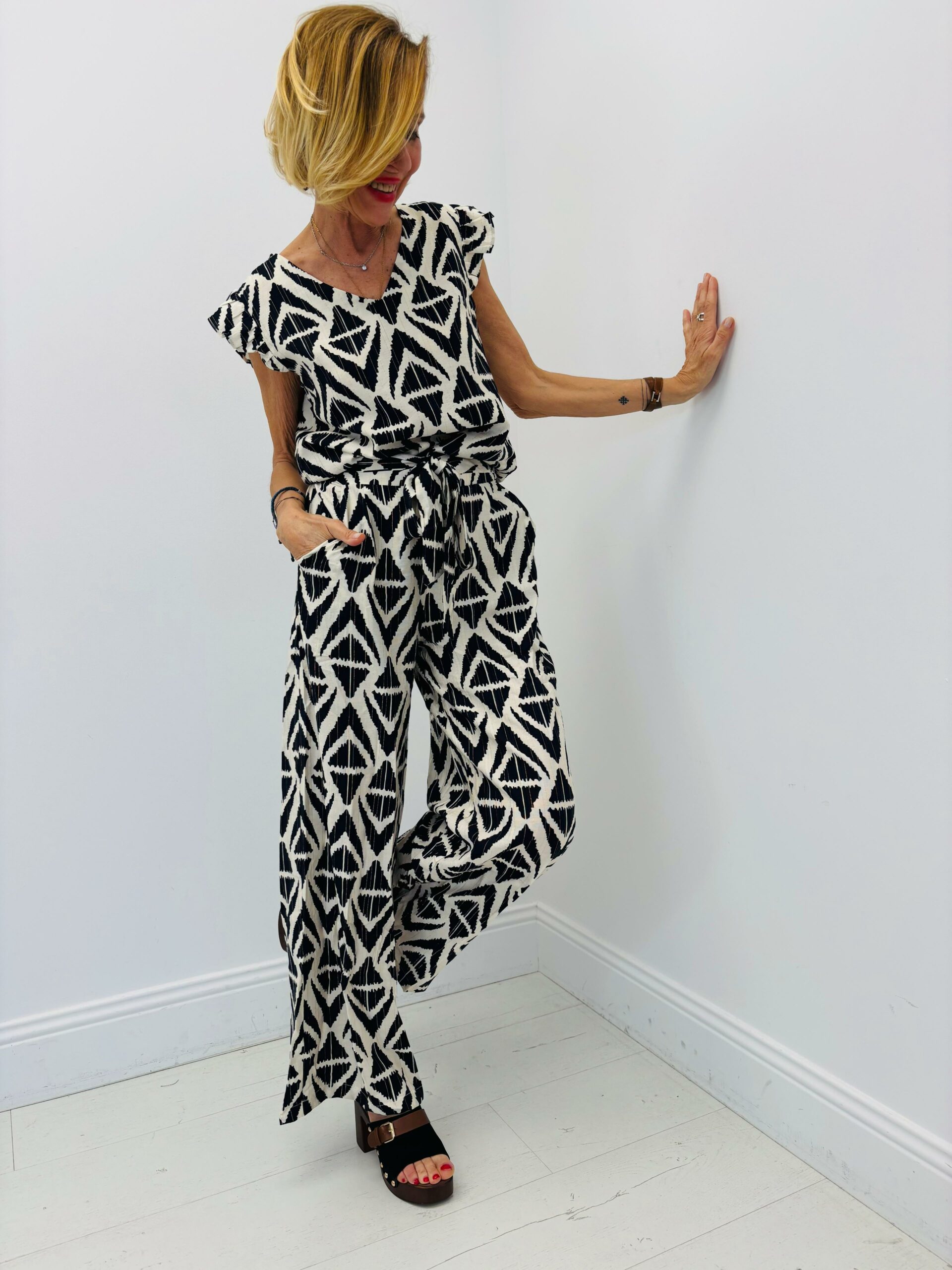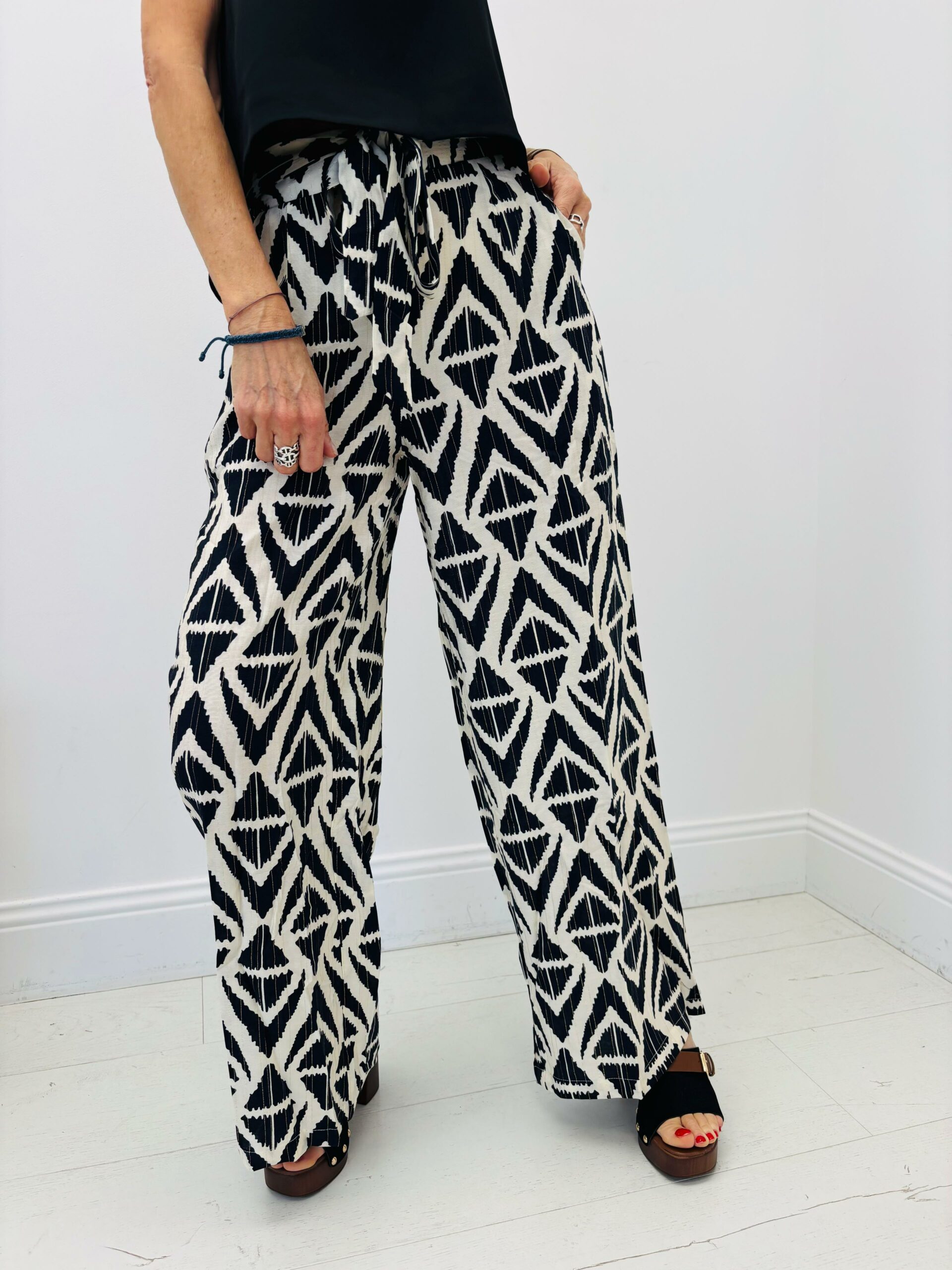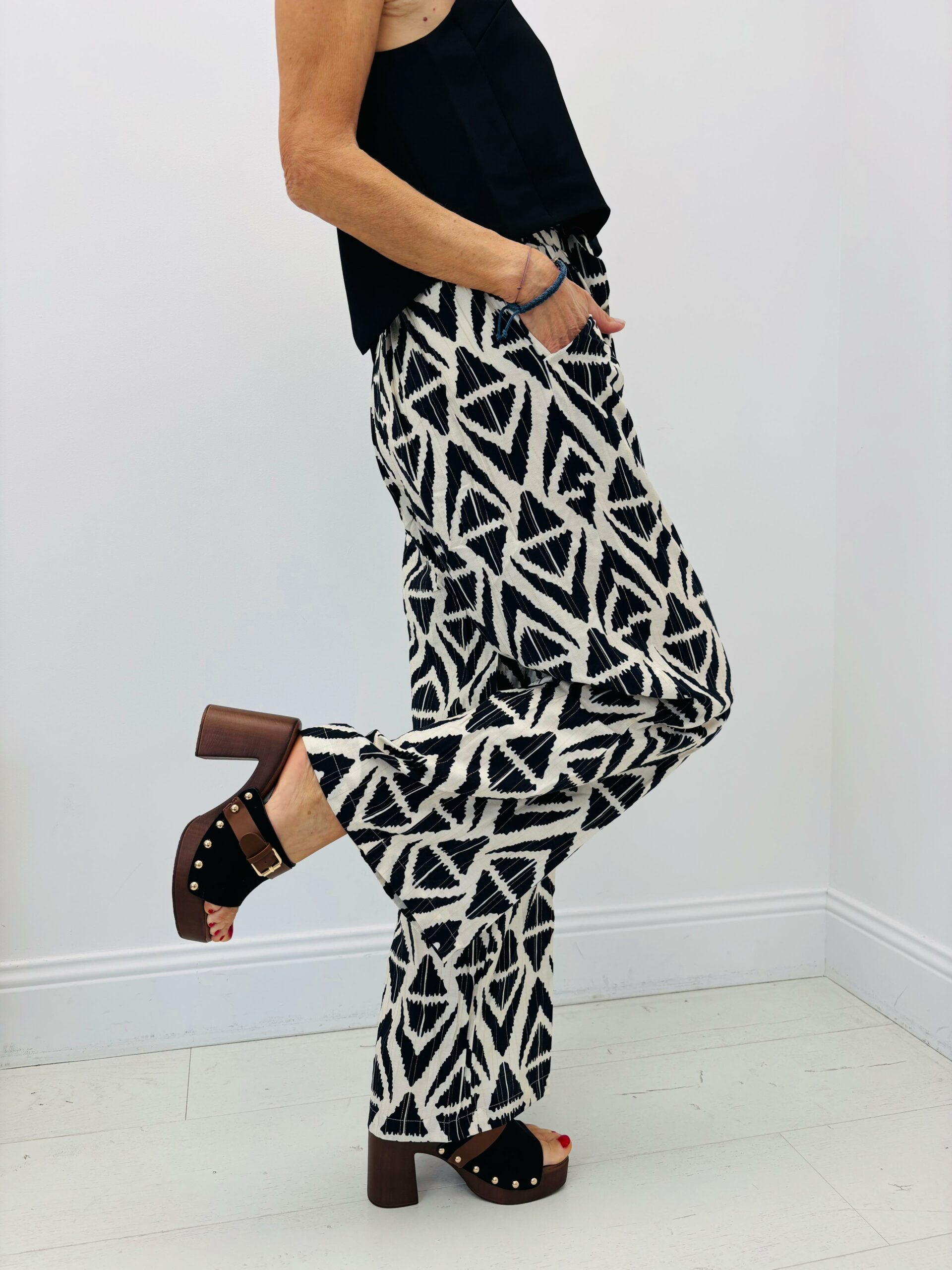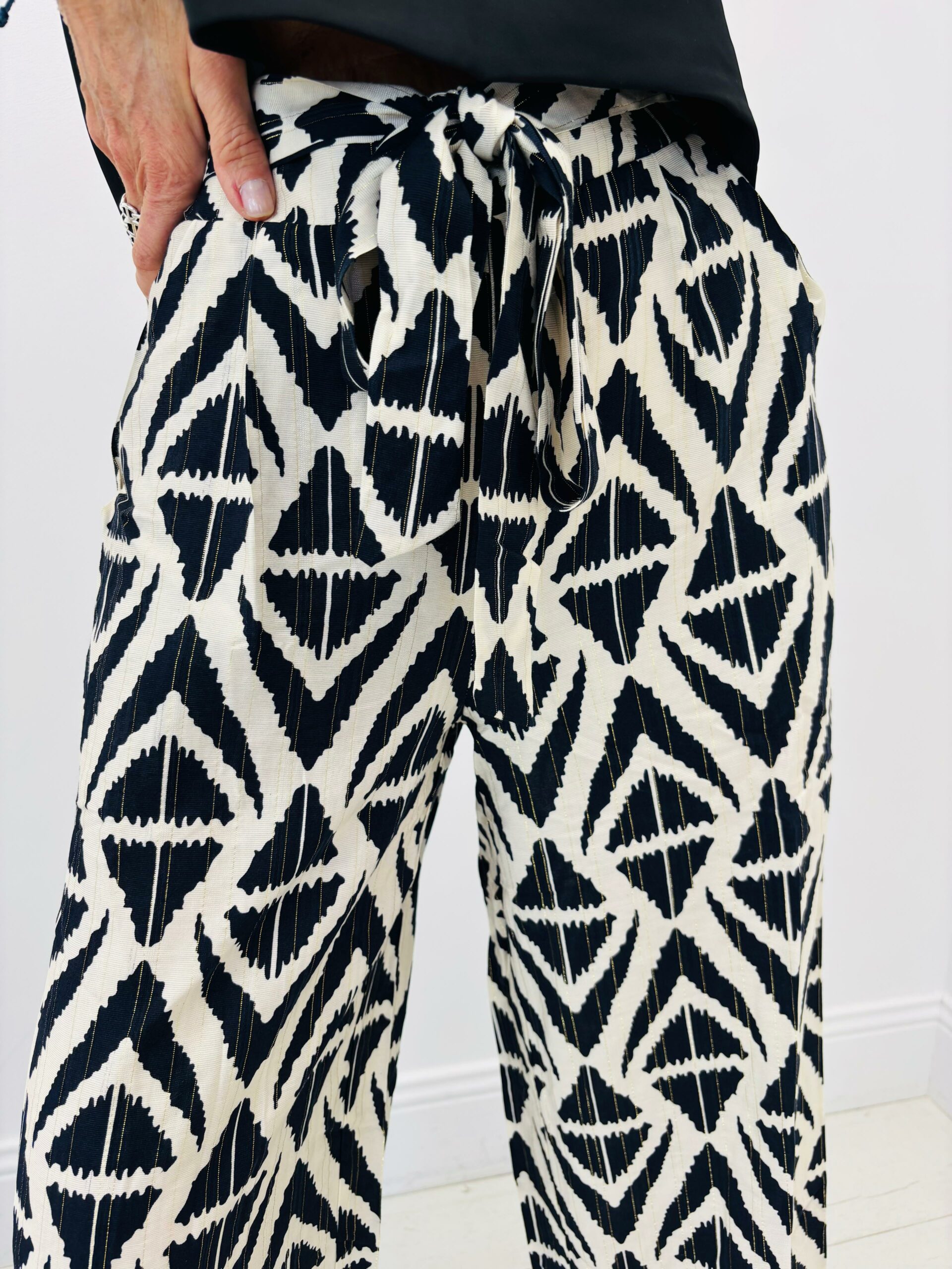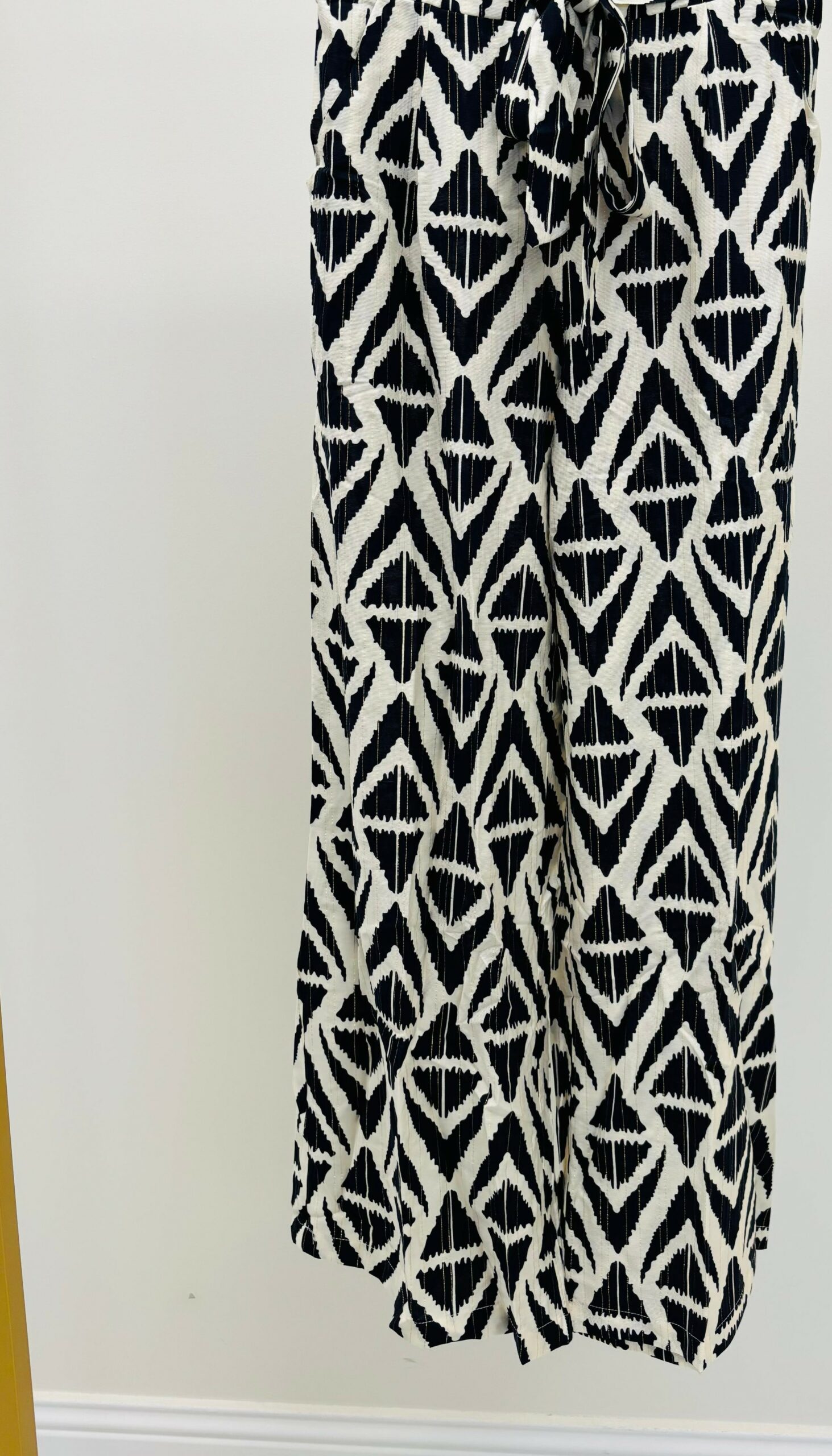 Pantalon fluide, noir et écru, avec 1 fil doré, taille élastique, ceinture à nouer, poches
