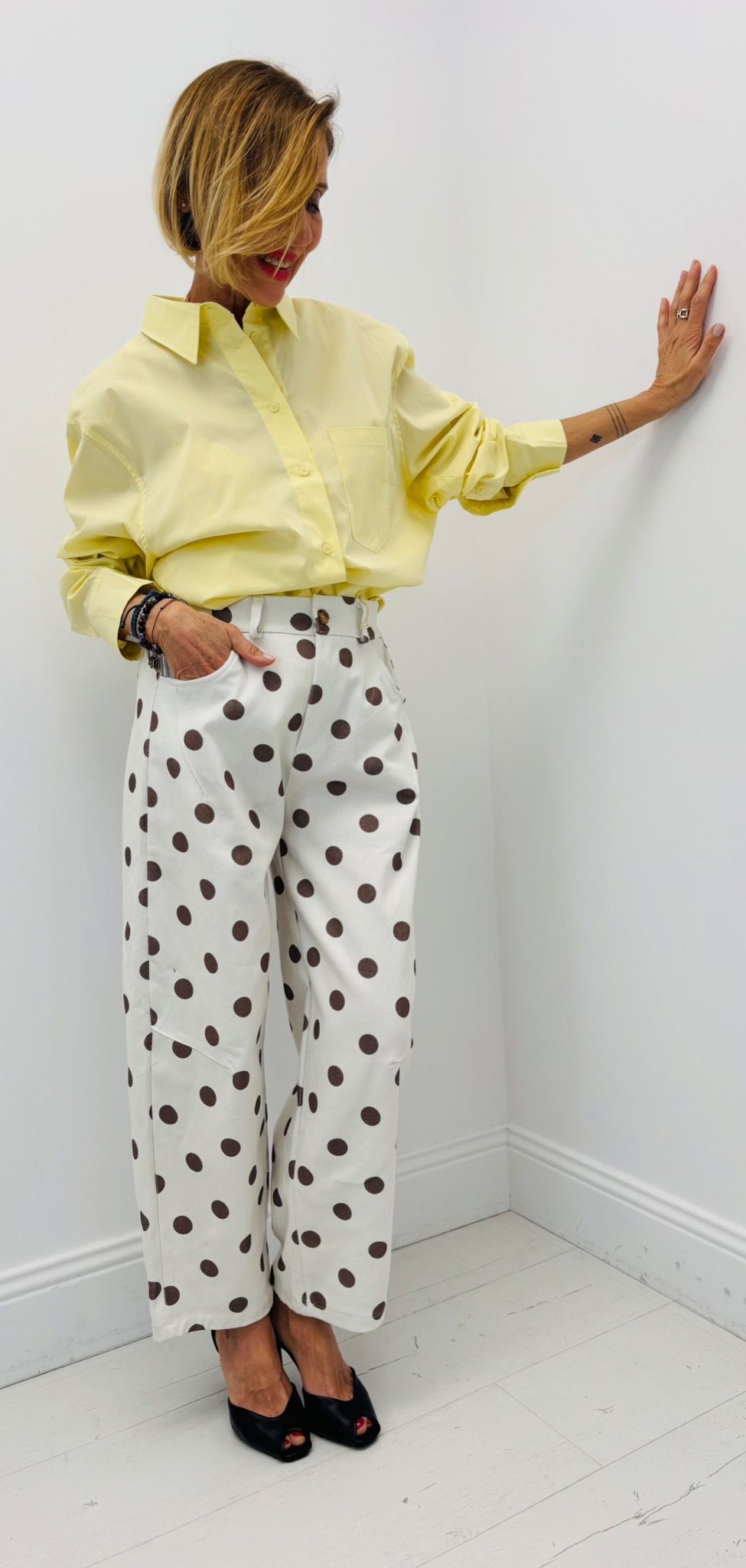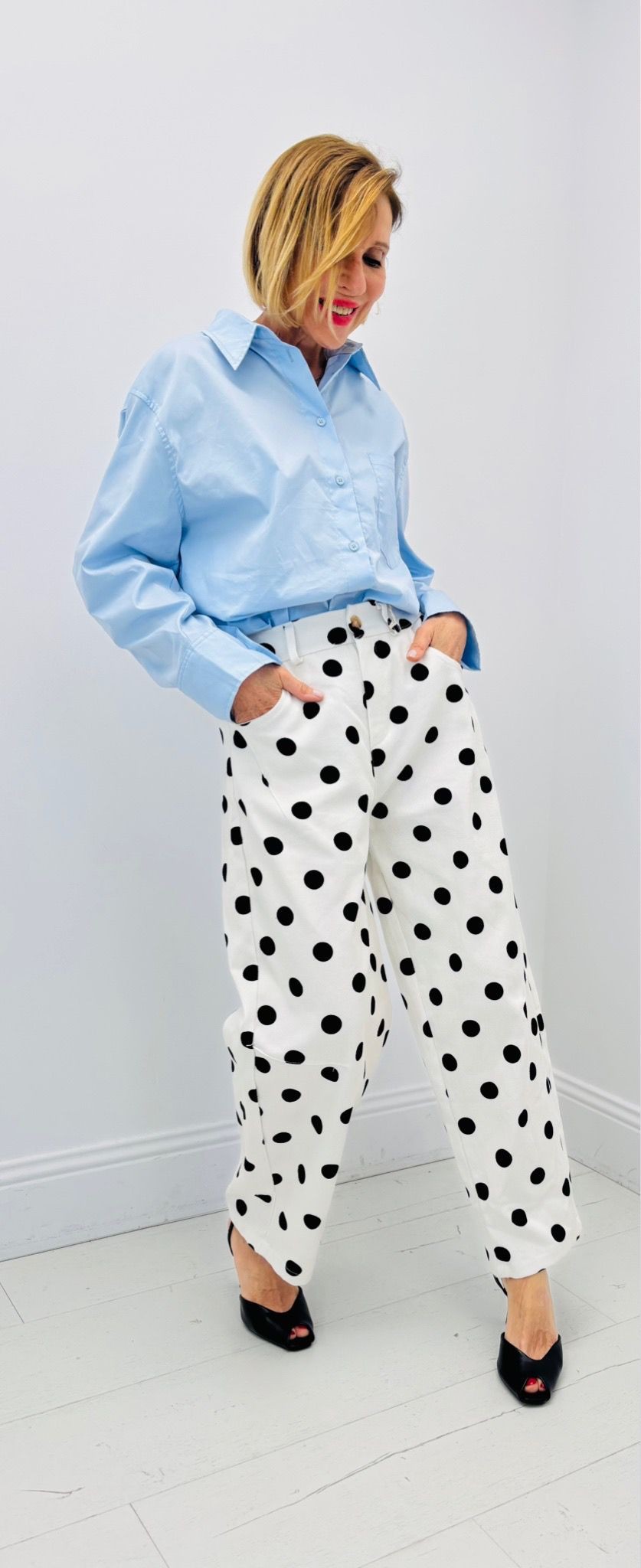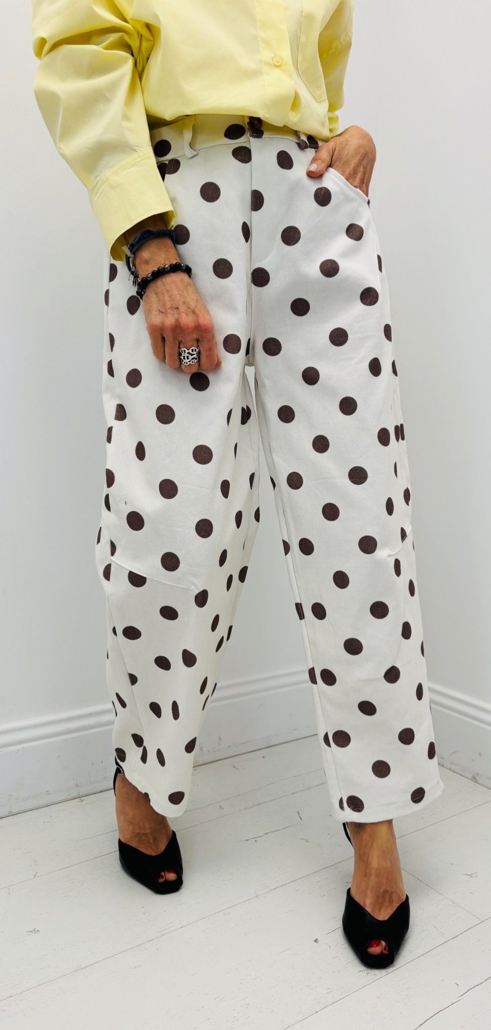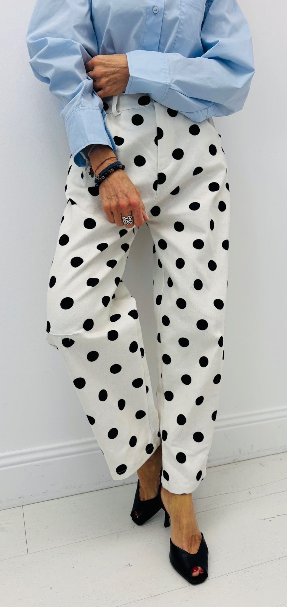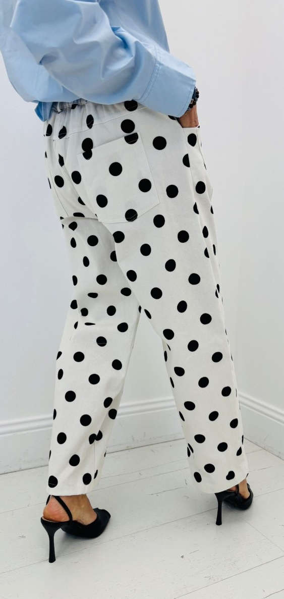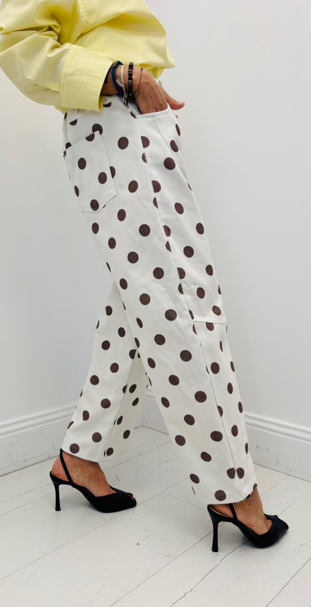Pantalon à gros pois, bouton et fermeture clair, dos élastique, poches